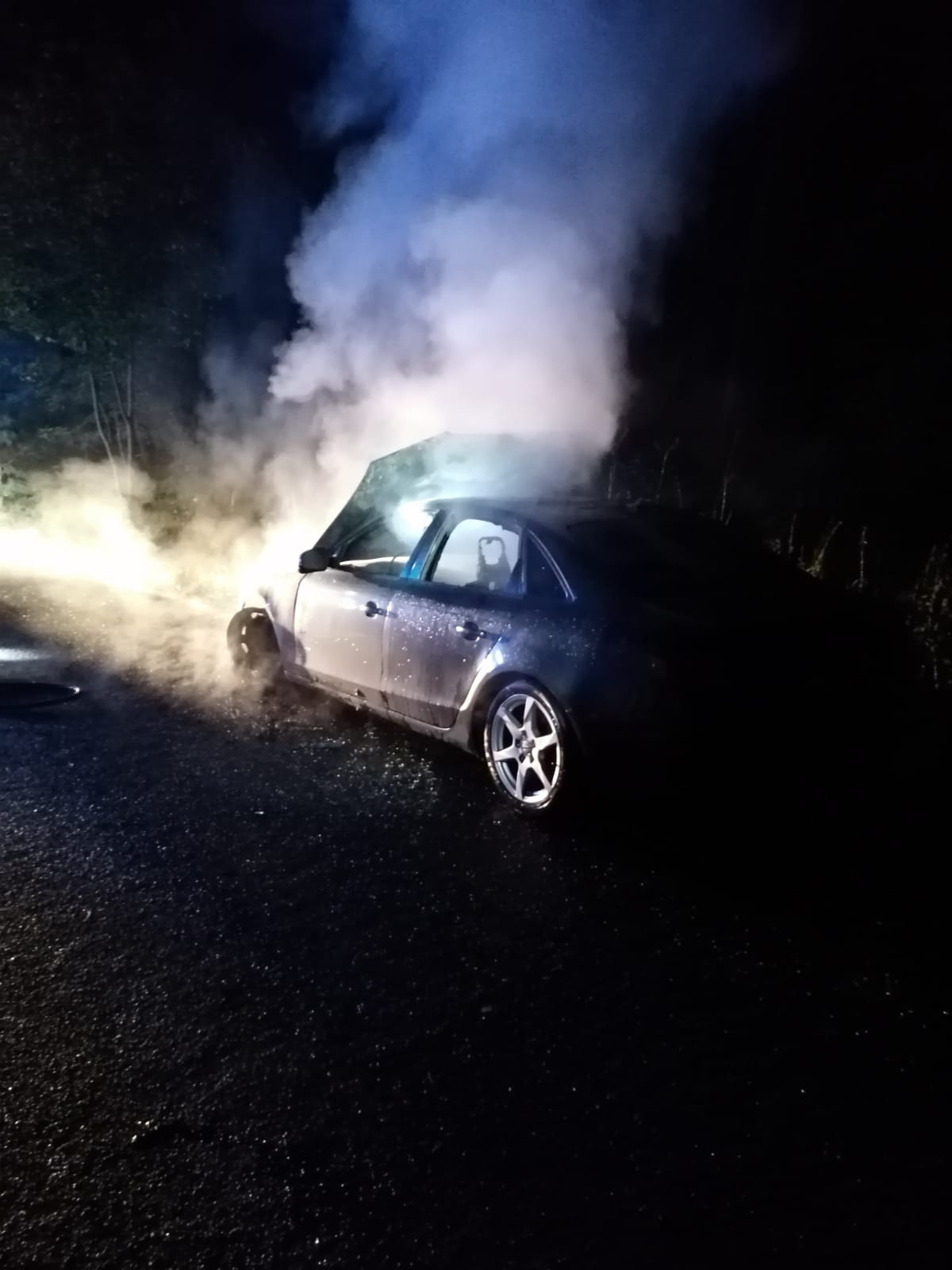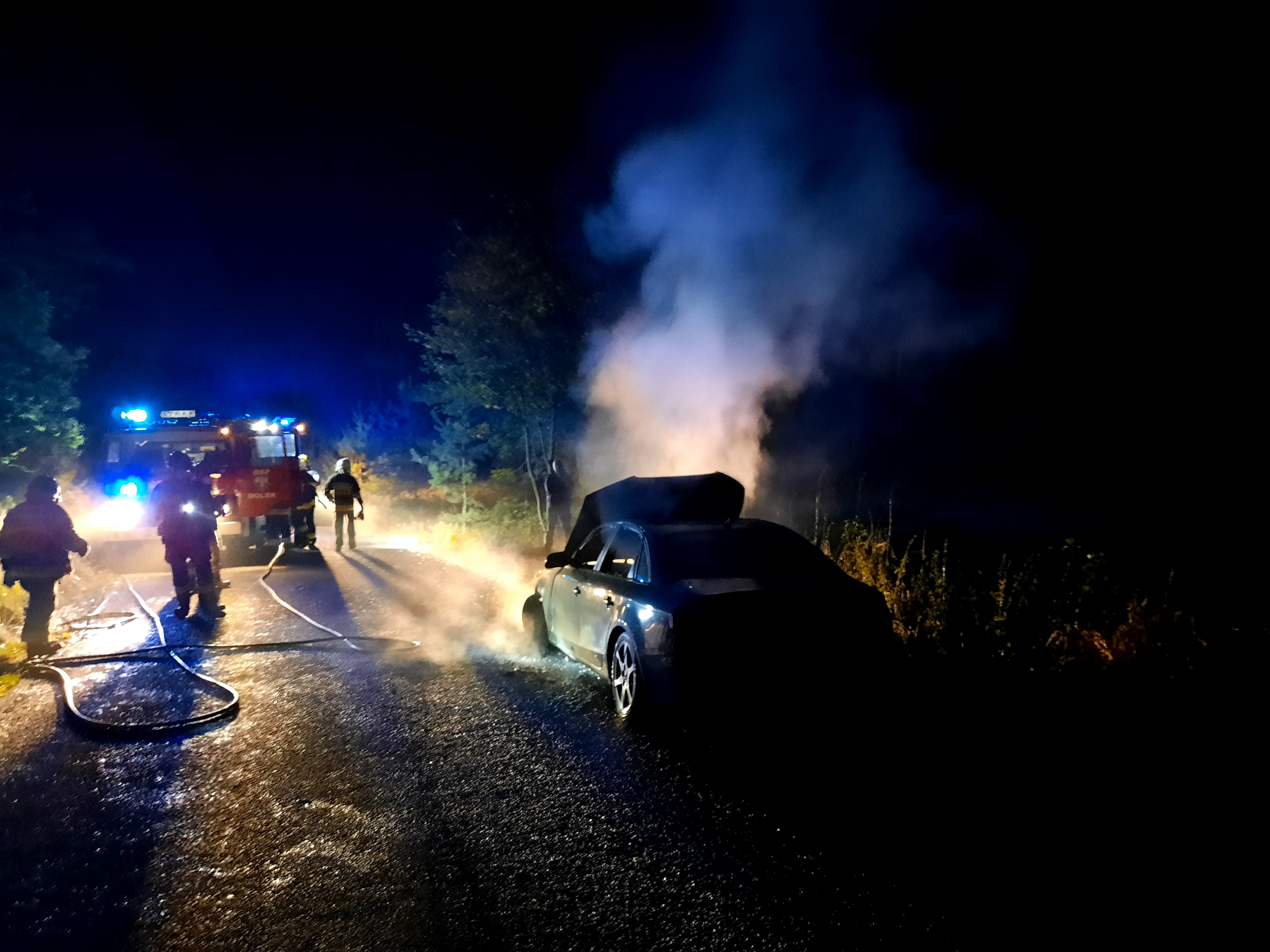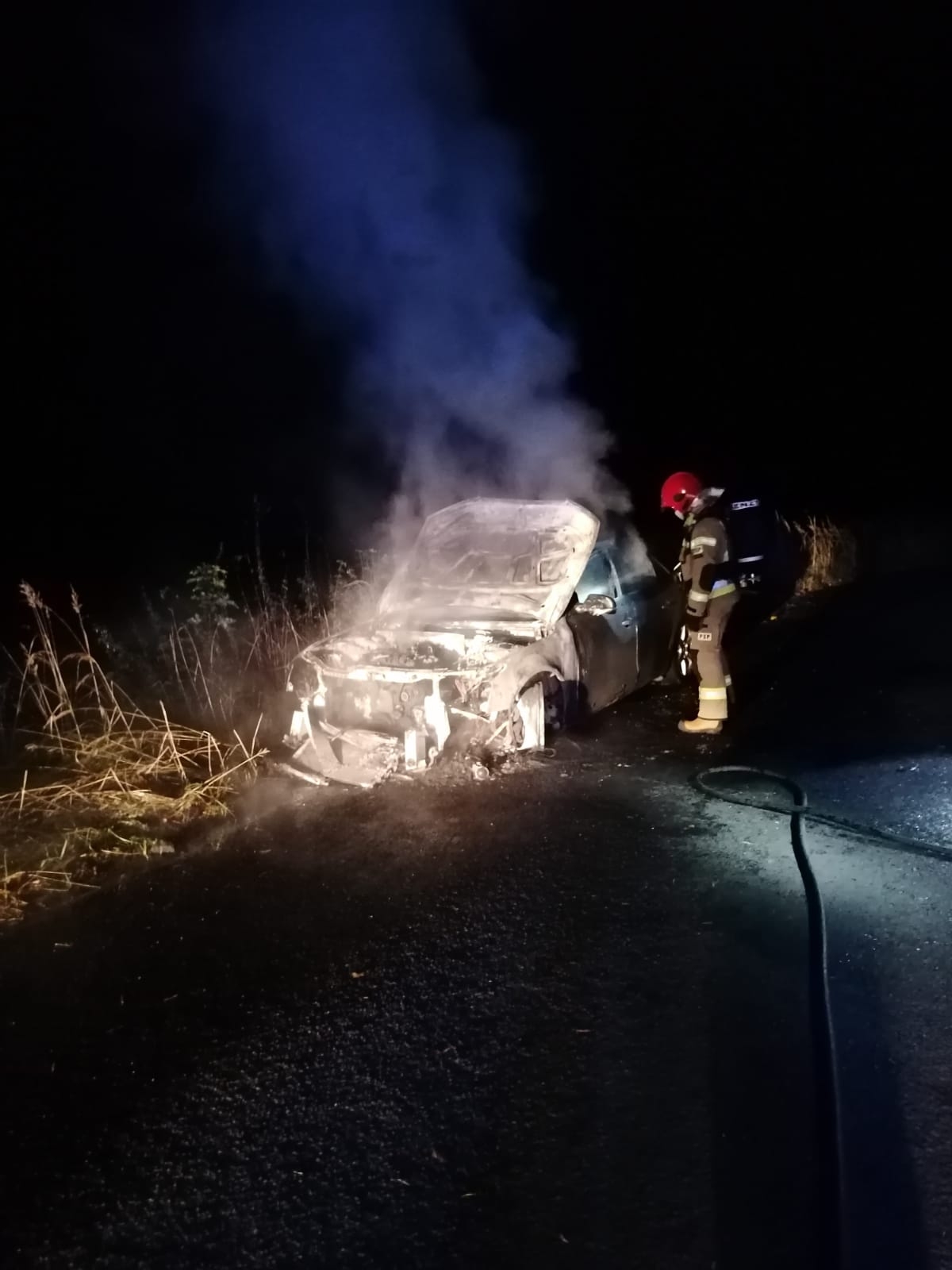 Po przybyciu zadysponowanych zastępów na miejsce zdarzenia i rozpoznaniu ustalono, że pali się samochód osobowy, cały objęty pożarem brak osób poszkodowanych. Działania JOP polegały na zabezpieczeniu miejsca zdarzenia, podaniu jednego prądu gaśniczego na palący się samochód. Strażacy pracowali w sprzęcie ochrony dróg oddechowych podczas działań gaśniczych. Udział 2 zastępy 11 ratowników.