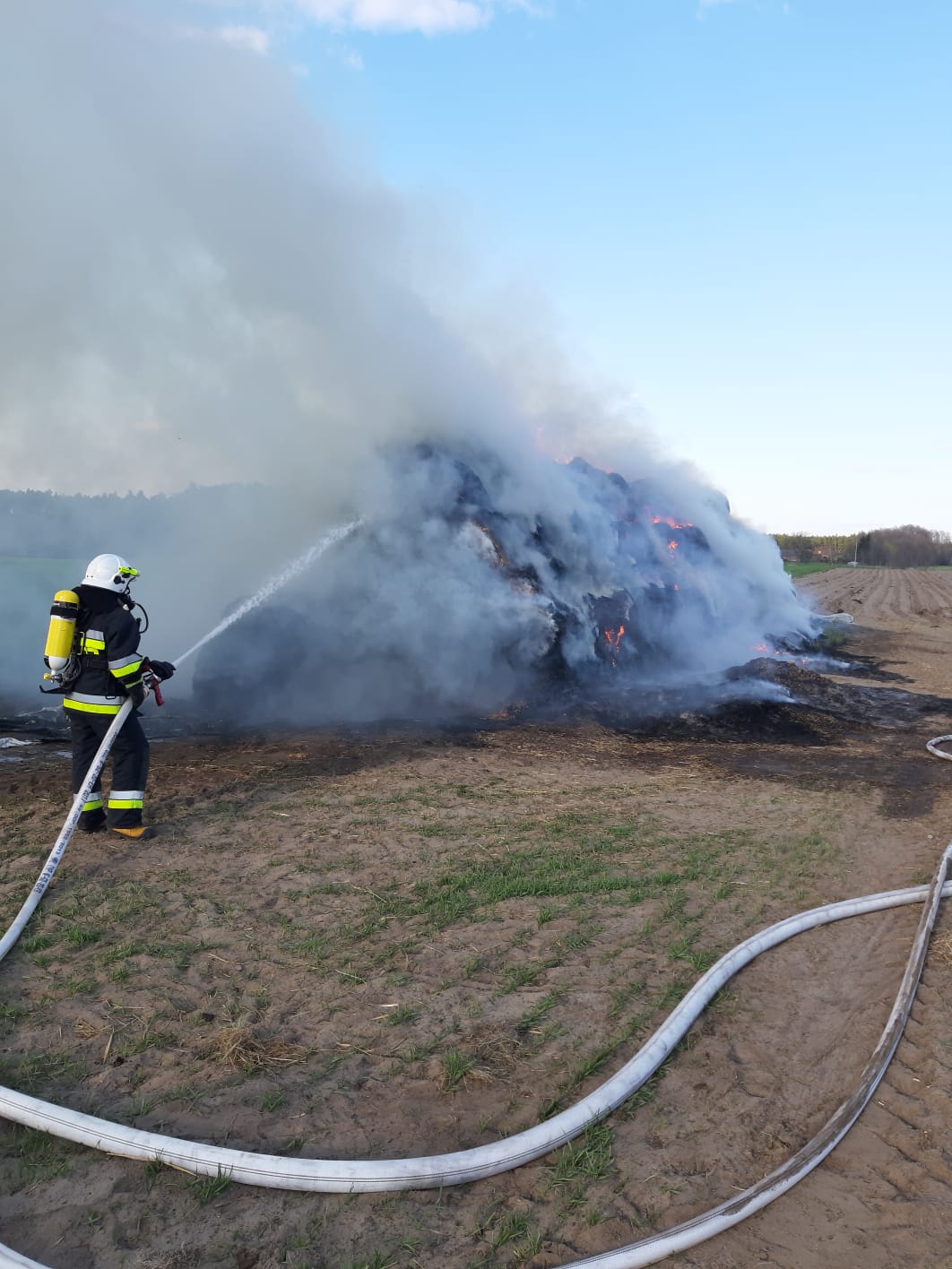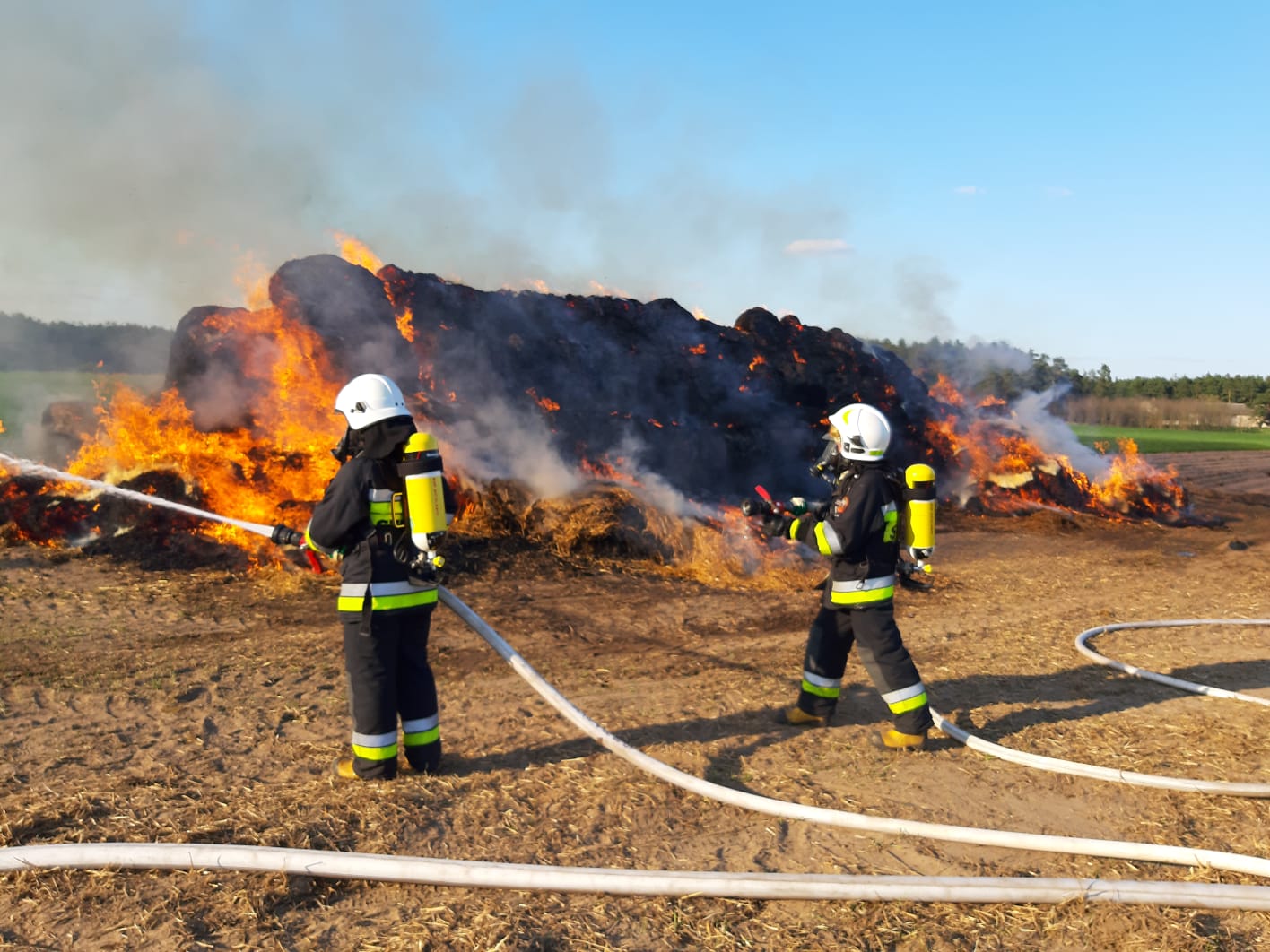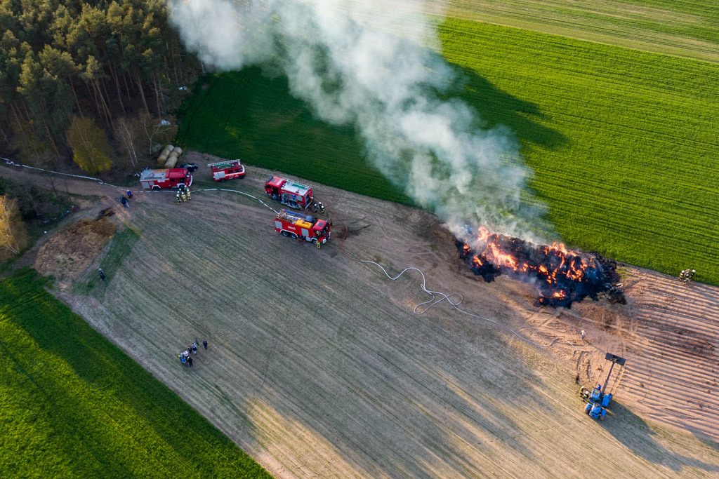 Po przybyciu zadysponowanych sił i środków i rozpoznaniu ustalono, że pali się stóg balotów słomy w całości objęty ogniem, brak osób poszkodowanych. Działania JOP polegały na podaniu dwóch prądów wody w natarciu przez ratowników zabezpieczonych w OUO na palący się stóg. Na miejsce zdarzenia przybył sprzęt rolniczy spycharko - ładowarka, który został wykorzystany do rozgarniania balotów. Po ugaszeniu pożaru pogorzelisko zostało obficie zlane wodą. Udział 5 zastępów 24 ratowników.
