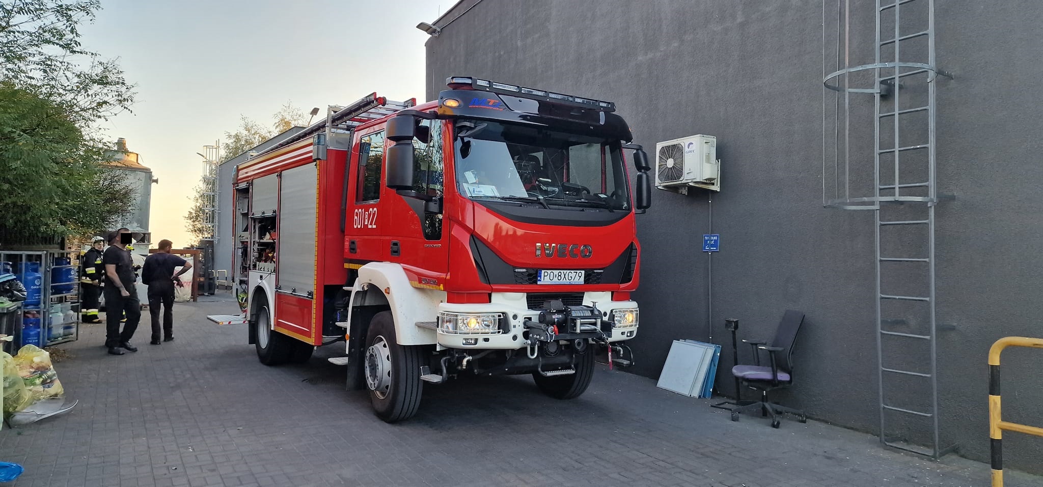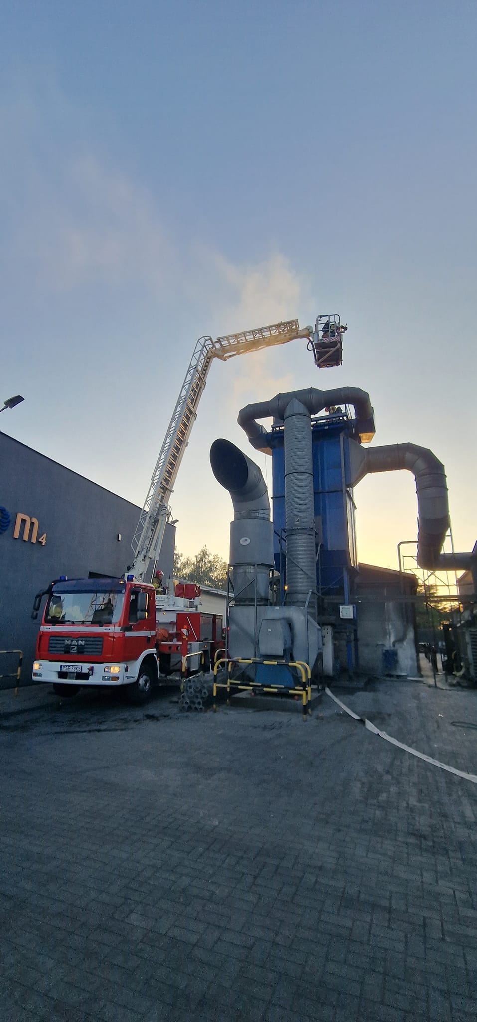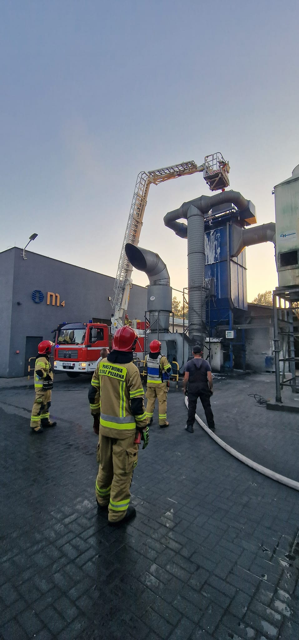 Po przybyciu na miejsce zdarzenia w rozpoznaniu ustalono, że doszło do zadymienia wewnątrz flitów workowych umieszczonych w czterech komorach znajdujących się poza budynkiem produkcyjnym. Dwóch pracowników gasiło palące się filtry przed przybyciem zastępów straży pożarnej. Strażacy z podnośnika podali jeden prąd piany przez włazy znajdujące się na wysokości 8 m do wnętrza filtrów. Podczas prowadzonych działań do strażaków zgłosiły się dwie osoby uskarżające się na złe samopoczucie i duszności. Pracownikom ratownicy udzielili kwalifikowanej pierwszej pomocy. Po przebadaniu poszkodowanych przez zespół ratownictwa medycznego podjęto decyzję o zabraniu poszkodowanych do szpitala.