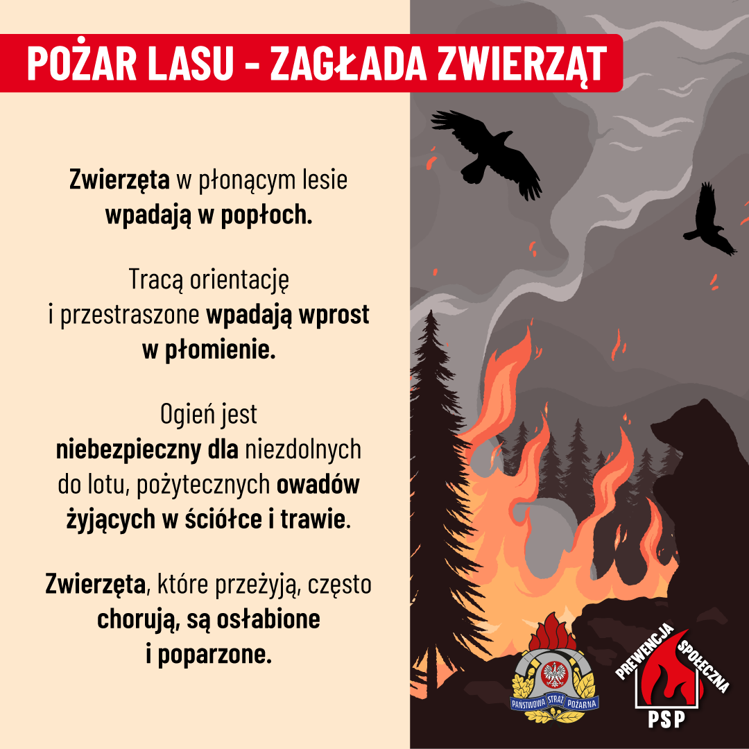 Umyślne podpalenia, wczesnowiosenne wypalanie roślinności, nieostrożność ludzi to tylko niektóre przyczyny pojawienia się ognia w lesie. Większość pożarów występuje przy najwyższym III stopniu zagrożenia pożarowego lasu. Z reguły mają one charakter powierzchniowy, pali się poszycie leśne, zarośla i pojedyncze drzewa. Utrzymujące się wysokie temperatury powodują wysychanie ściółki i roślinności dna lasu.