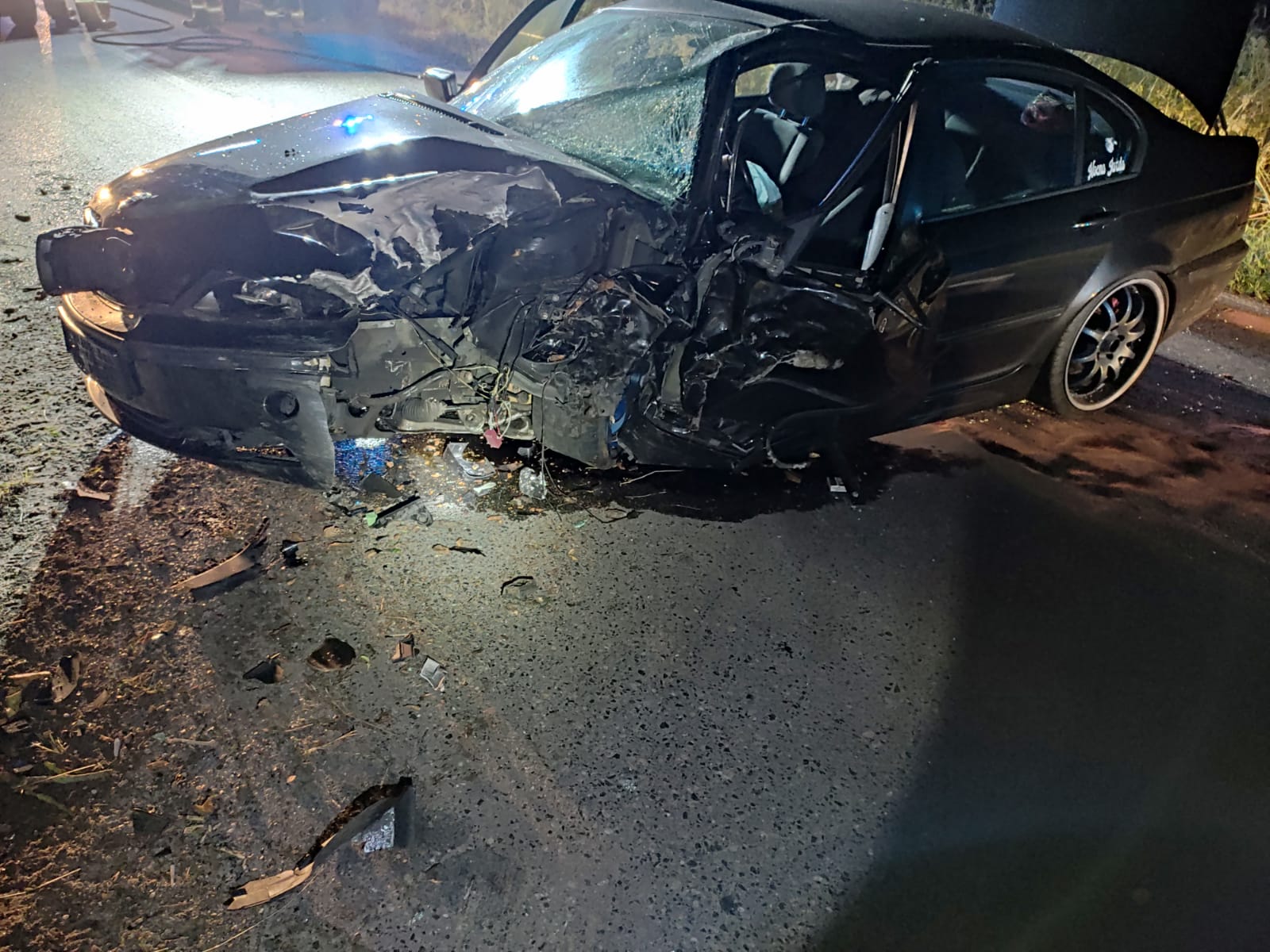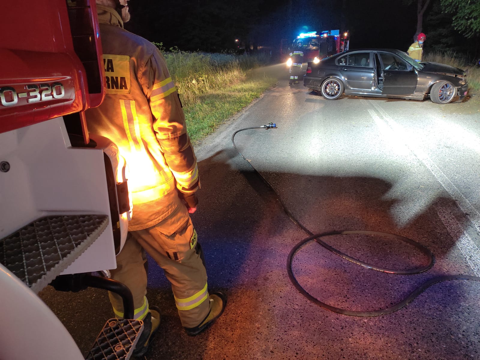 Po przybyciu zadysponowanych zastępów i rozpoznaniu ustalono, że auto osobowe po uderzeniu w drzewo stoi na jezdni, kierujący wraz z pasażerem na zewnątrz pojazdu. Działania JOP polegały na zabezpieczeniu miejsca zdarzenia, odłączeniu akumulatora, udzieleniu kpp osobom poszkodowanym. Po przybyciu ZRM kierujący i pasażer zostali przekazani celem dalszych badań. Przybyły na miejsce lekarz podjął decyzję o hospitalizacji obu osób. Następnie strażacy usunęli płyny eksploatacyjne z drogi przy użyciu sorbentu.Pojazd przesunięto na jeden pas jezdni tym samym uruchamiając ruch wahadłowy. Udział 6 zastępów 25 ratowników, ZRM, Policja.