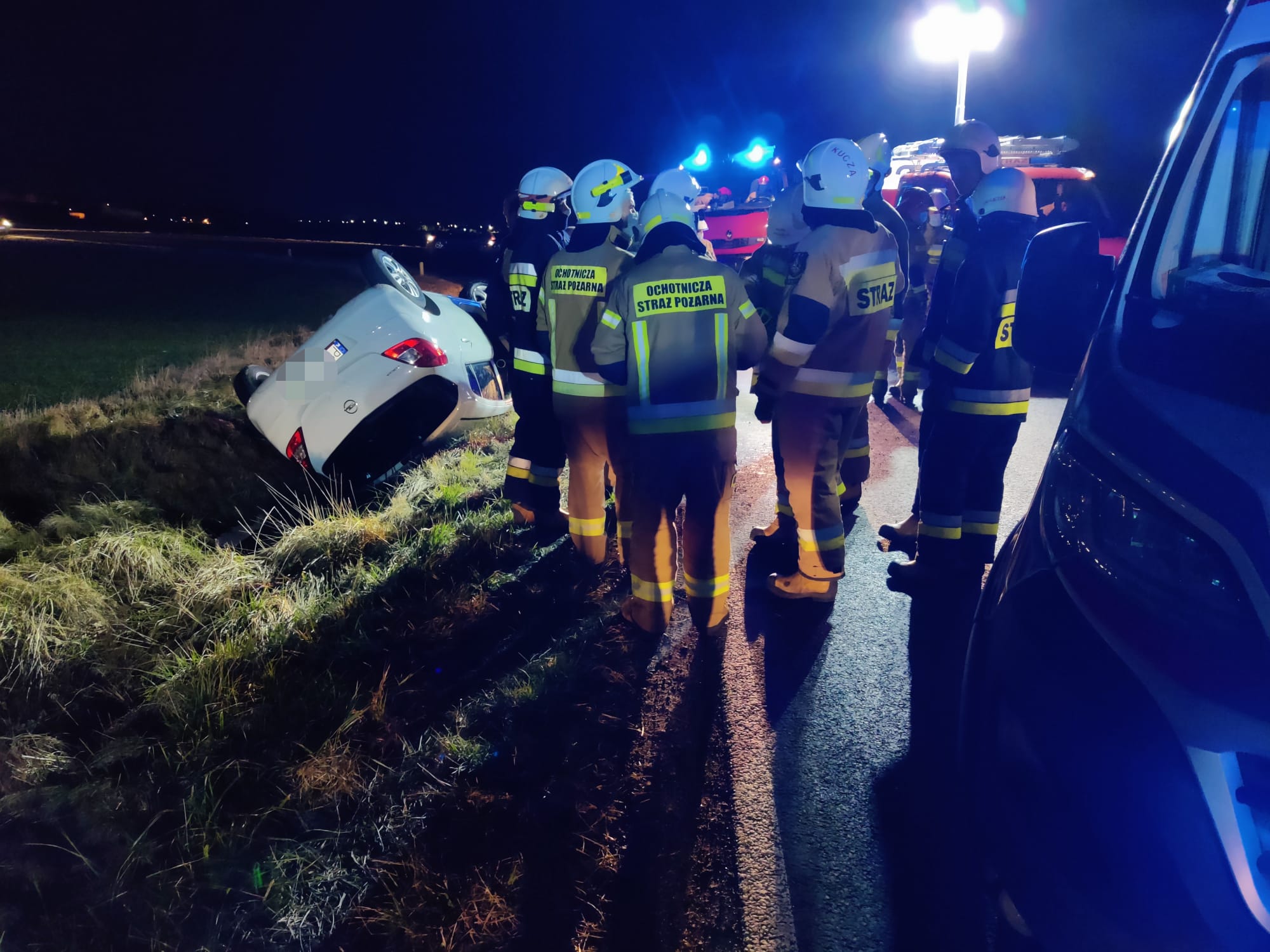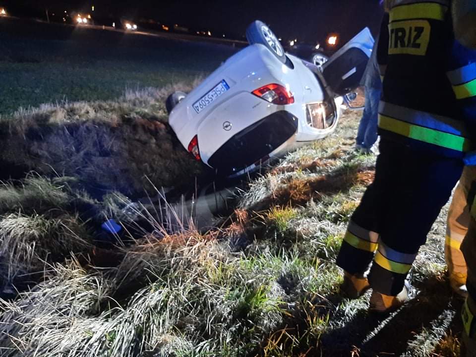 Po przybyciu zadysponowanych sił i środków na miejsce zdarzenia i rozpoznaniu ustalono, że samochód osobowy leży w rowie na dachu, podróżujący poza pojazdem. Działania JOP polegały na zabezpieczeniu miejsca zdarzenia, odłączeniu akumulatorów oraz udzieleniu kpp pasażerce pojazdu. Kierowca odmówił udzielania kpp. Po przybyciu na miejsce zdarzenia ZRM osobę poszkodowaną ratownicy JOP przekazali celem dalszych badań. W zdarzeniu została poszkodowana 1 osoba. Na czas trwania działań droga wojewódzka DW 436 była zablokowana. Udział 4 zastępy 20 ratowników, Policja, ZRM.