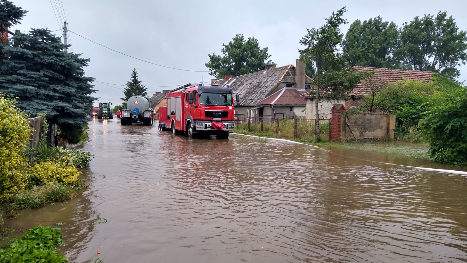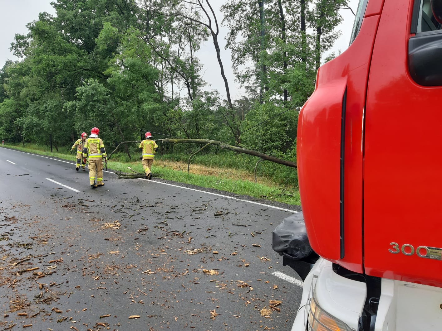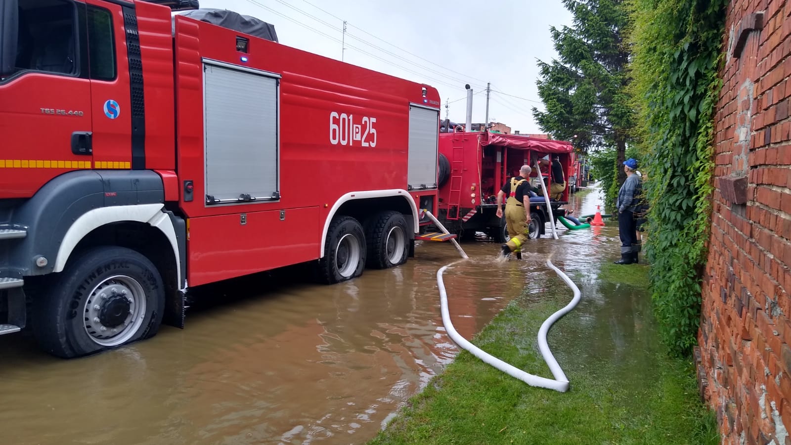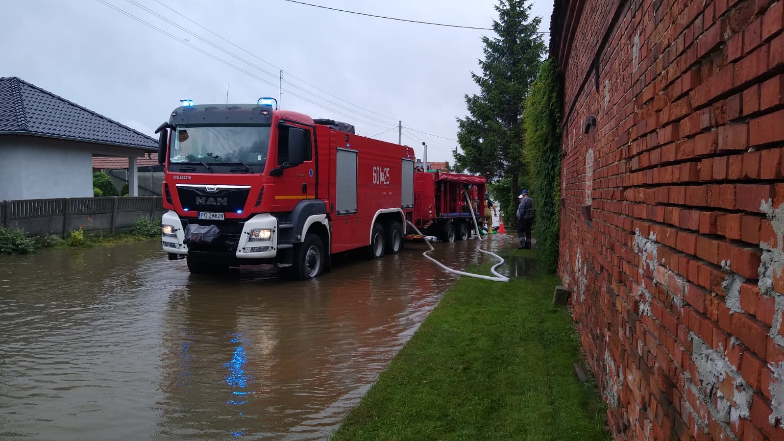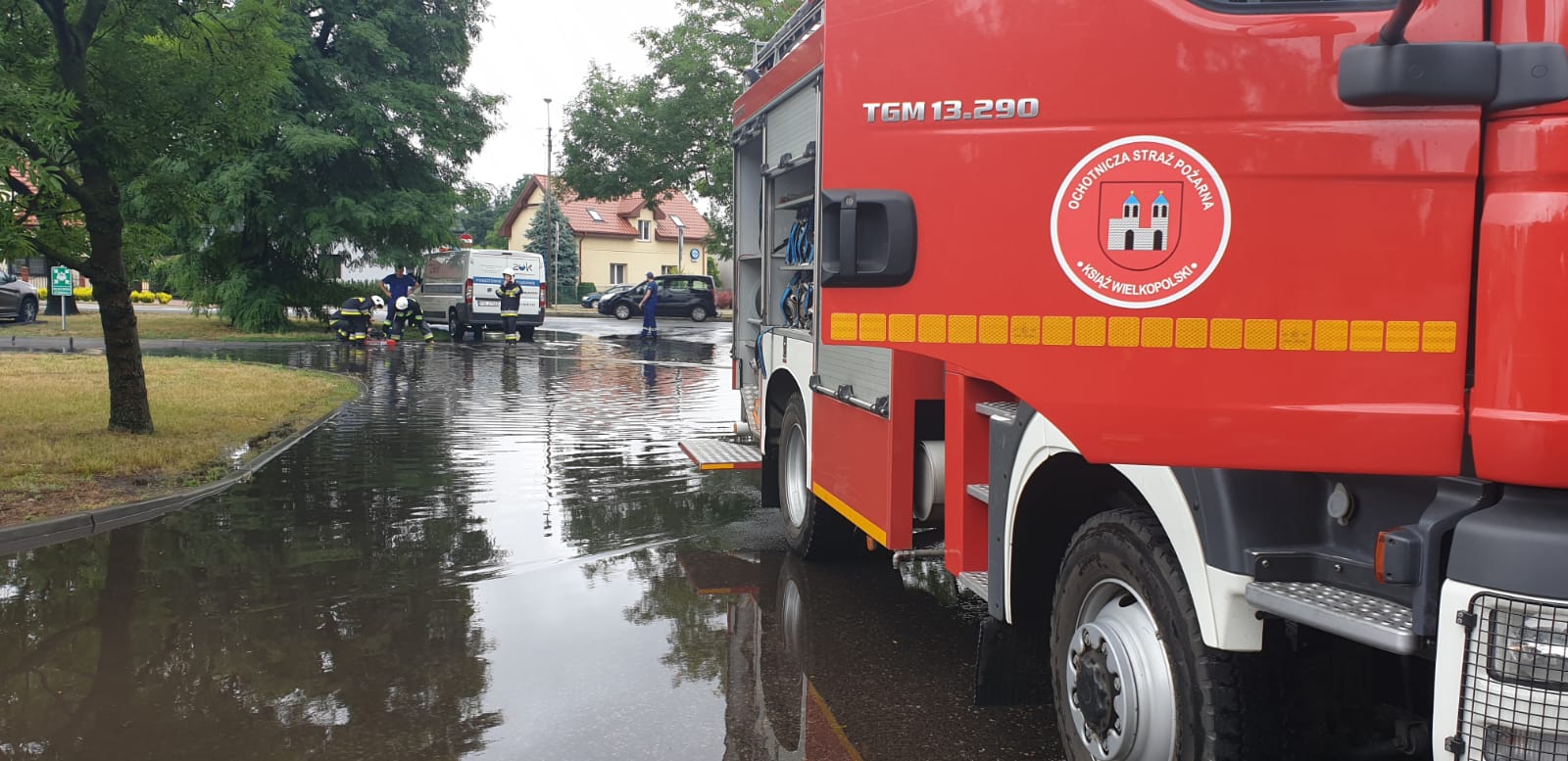W związku z ostrzeżeniem meteorologicznym wydanym na 8-9 lipca 2021 roku dotyczącym silnych wiatrów, burz i obfitych opadów deszczu jak również gradu wydanym dla naszego powiatu, straż pożarna z terenu powiatu śremskiego interweniowała czterokrotnie usuwając skutki tych anomalii pogodowych. Jeden z tych wyjazdów miał miejsce na teren powiatu gostyńskiego. Na polecenie stanowiska kierowania komendanta wojewódzkiego do miejscowości Bączylas został zadysponowany samochód GCBA wraz z zestawem pompowym ZP680. Działania na miejscu polegały na wypompowywaniu wody z zalanej ulicy w w/w miejscowości. Na terenie naszego powiatu straż pożarna interweniowała w Śremie na ulicy Solidarności, gdzie z uwagi na zatkane studzienki deszczowe woda zalegały na szerokości całej ulicy. W miejscowości Luciny drzewo zostało przewrócone na jeden pas jezdni, które strażacy usunęli zagrożenie przy użyciu pilarek do drewna. W Książu Wlkp. na ul. Powstańców została zalana droga, którą strażacy wypompowali przy użyciu pomp szlamowych. W wszystkich z tych działań brało udział 3 zastępy JRG 13 ratowników oraz 1 zastęp i 6 ratowników z OSP KSRG.