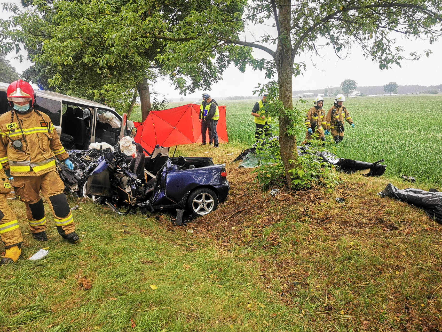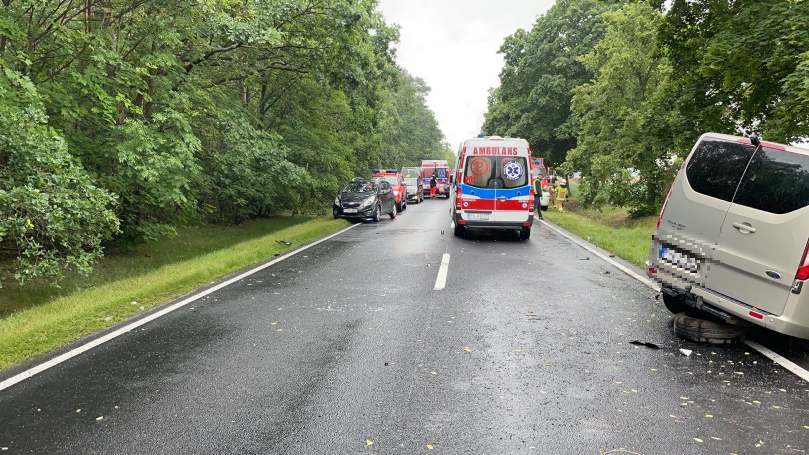 Po przybyciu na miejsce akcji zastano samochód osobowy oraz bus po zderzeniu czołowym. Działania w pierwszej fazie podjęli funkcjonariusze KW PSP w Poznaniu oraz funkcjonariusz JRG 7 Poznań wracający po służbie do domu, którzy najechali na zdarzenie udzielając pomocy poszkodowanym w tym 2 letniemu dziecku. Pozostałe osoby poszkodowane poruszające się busem znajdowały się poza pojazdem w obecności osób postronnych. Wszystkim udzielono kwalifikowanej pierwszej pomocy, następnie przekazano ZRM. Drugie dziecko, które jechało w Busie zostało przebadane - bez obrażeń i dolegliwości. Osoba poruszająca się samochodem osobowym znajdowała się w pojeździe. Strażacy ewakuowali osobę przy użyciu narzędzi hydraulicznych. Kierujący Akcją Medyczną odstąpił od medycznych czynności względem ewakuowanej osoby - kierujący poniósł śmierć w wyniku zaistniałego zdarzenia. Na miejscu zdarzenia zabezpieczono lądowanie i start śmigłowca LPR, który przetransportował 2 letnie dziecko do szpitala. Będące na miejscu Zespoły Ratownictwa Medycznego zabrały 3 osoby poszkodowane do szpitali. Droga Wojewódzka 434 na czas prowadzonych działań była zablokowana. Udział 8 zastępów 27 ratowników w tym Grupa Operacyjna KW PSP Poznań, Grupa Operacyjna KP PSP Śrem, Policja oraz Pogotowie Ratunkowe.