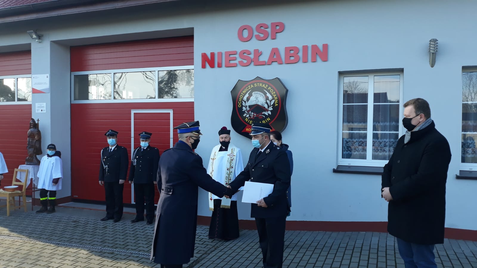 w Śremie st.kpt. Tomasz Kierzek. W swoim przemówieniu odniósł się do mementu podjęcia decyzji o zakupie średniego samochodu ratowniczo – gaśniczego dla OSP Niesłabin, gdyż był to warunek, aby podjąć próbę włączenia jednostki do krajowego systemu ratowniczo - gaśniczego. Dzięki środkom finansowym z Ministerstwa Spraw Wewnętrznych i Administracji, Wojewódzkiego Funduszu Ochorny Środowiska i Gospodarki Wodnej w Poznaniu oraz gminy Śrem udało się zakupić w 2019 roku średni samochód ratowniczo – gaśniczy. Jednostka zaczęła czynić starania o włączenie do krajowego systemu ratowniczo – gaśniczego. Po podpisaniu trójstronnego porozumienia między Burmistrzem Śremu, Komendantem Powiatowym PSP w Śremie a Prezesem OSP Niesłabin i spełnieniu wymogów określonych przepisami Wielkopolski Komendant Wojewódzki PSP st.bryg. Dariusz Matczak złożył wniosek do Komendanta Głównego PSP nadbryg. Andrzeja Bartkowiaka o włączenie jednostki OSP w Niesłabinie w struktury krajowego systemu ratowniczo – gaśniczego.
