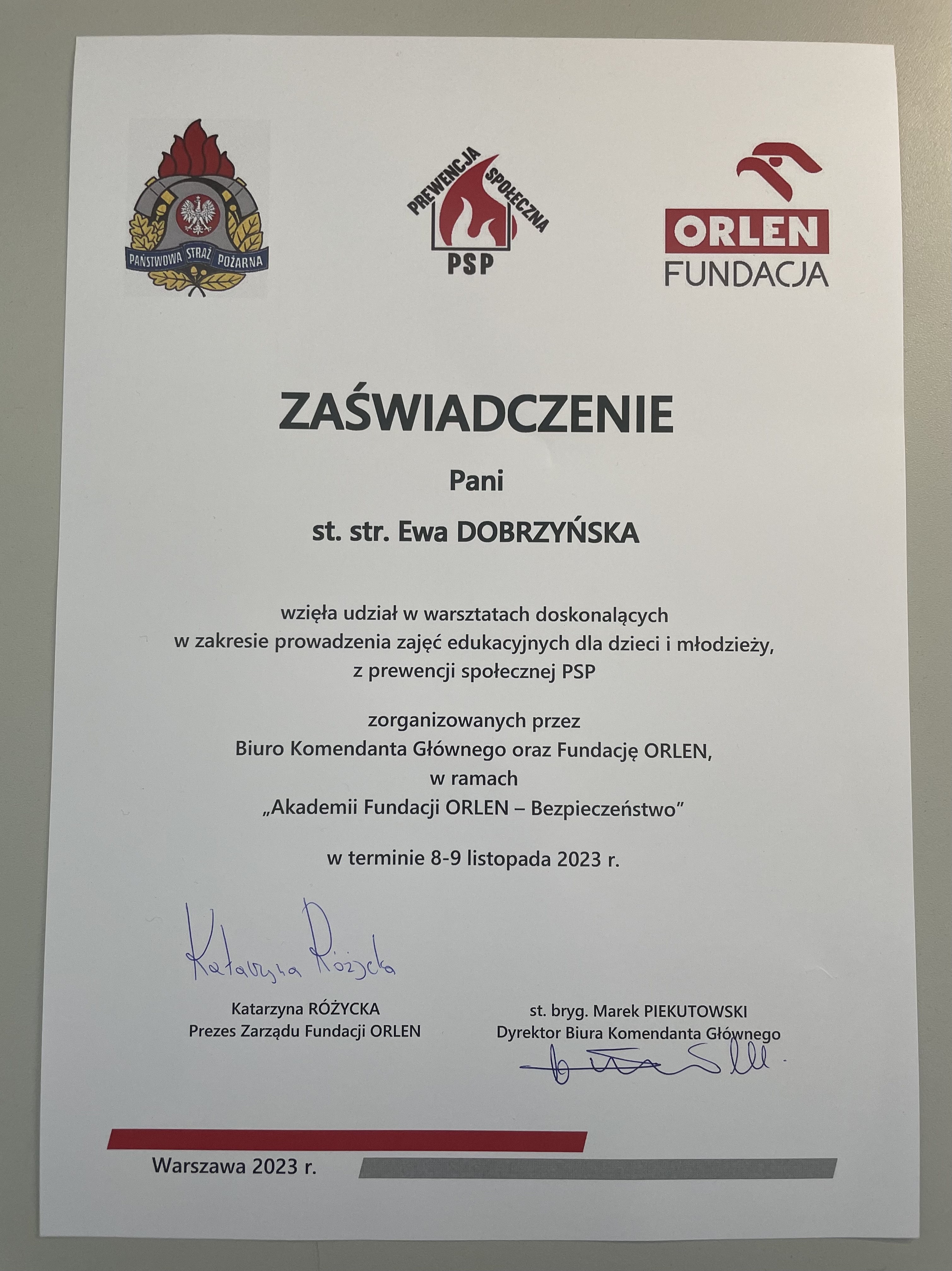 st.str. Ewa Dobrzyńska na przełomie marca i kwietnia odbyła cykl szkoleń online przygotowujących do pracy Edukatora Prewencji Społecznej w salkach edukacyjnych. Warsztaty zorganizowane zostały przez Wydział Prewencji Społecznej Biura Komendanta Głównego Państwowej Straży Pożarnej oraz Fundację Orlen.
