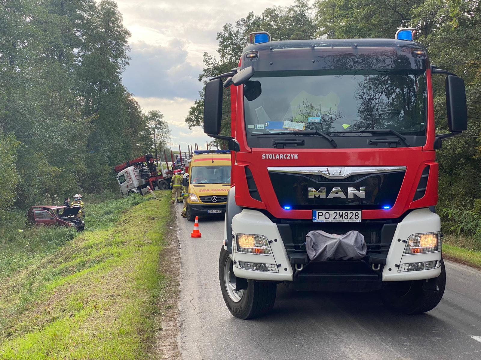 Po przybyciu na miejsce zdarzenia zadysponowanych zastępów i rozpoznaniu ustalono, że na trasie Śrem - Zawory DW 436 doszło do wypadku samochodu osobowego z ciężarowym 1 osoba poza pojazdem, droga zablokowana w obu kierunkach. Działania JOP polegały na zabezpieczeniu miejsca zdarzenia, odłączeniu akumulatorów w obu pojazdach, udzieleniu kpp osobie poszkodowanej z samochodu osobowego. Osobę poszkodowaną przekazano ZRM-owi przybyłemu na miejsce zdarzenia. Kierujacy pojazdem cięzarowym odmówił udzielania kpp.Po czynnościach wykonywanych przez policjantów posprzątaniu jezdni ruch na DW został przywrócony. Poszkodowany z samochodu osobowego zabrany został do szpitala przez ZRM. Udział 4 zastępy 15 ratowników w tym grupa operacyjna KP PSP Śrem, Policja, ZRM, Pomoc drogowa.