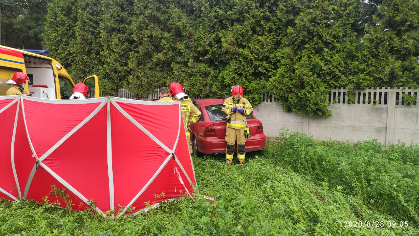 Po przybyciu na miejsce zadysponowanych zastępów JOP na bazie rozpoznania ustalono, że samochód osobowy uderzył w betonowy płot, wewnątrz pojazdu mężczyzna nieprzytomny. W pojeżdzie znajdowało sięrównież kilkumiesięczne dziecko, które wydostała z pojazdu matka przybyła na miejsce zdarzenia. Działania JOP polegały na zabezpieczeniu miejsca zdarzenia, odłączeniu akumulatorów w pojeździe, ewakuacji poszkodowanego mężczyzny z samochodu, którego przejęła obsada ratownictwa medycznego przybyłego na miejsce. ZRM rozpoczął zabiegi RKO, w których uczestniczyli również ratownicy PSP. Drugi przybyły na miejsce zaspół ratownictwa medycznego przejął matkę z dzieckiem i zabrał do szpitala celem dodatkowych badań i obserwacji. Dziewczynce została wydana maskotka pluszowa. Lekarz nadzorujący czynności resucytacyjne podjał decyzję o wezwaniu LPR na miejsce zdarzenia. Po przybyciu poszkodowany mężczyzna został zabrany śmigłowcem do szpitala. Udział 3 zastępy 10 ratowników w tym grupa operacyjna KP PSP Śrem. Policja, ZRM,LPR.