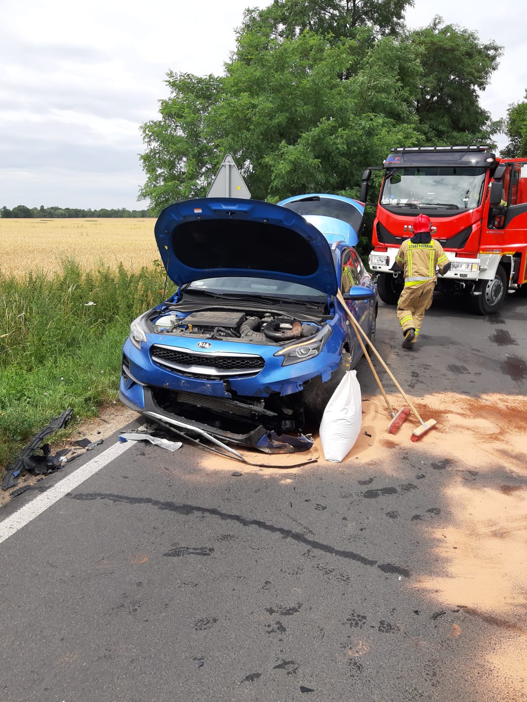 Pod wskazany adres niezwłocznie zadysponowano siły i środki. Po przybyciu na miejsce akcji stwierdzono, że w zdarzeniu udział brało auto osobowe oraz motocykla. Działania SP polegały na zabezpieczeniu miejsca zdarzenia. Osoby podróżujące samochodem oraz motocyklem odmówiły udzielenia Kwalifikowanej Pierwszej Pomocy. W pojazdach odłączono akumulatory, przy użyciu sorbentu zneutralizowano wycieki płynów eksploatacyjnych.Udział 4 zastępy 8 ratrowników w tym grupa operacyjna KP PSP Śrem, Policja.