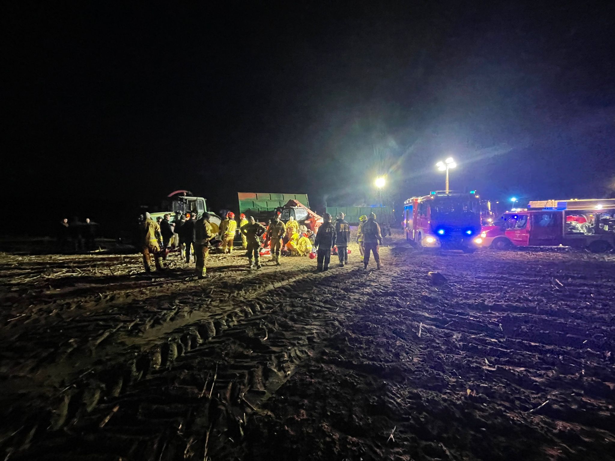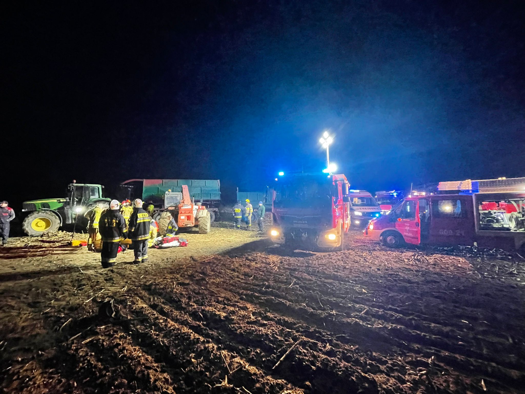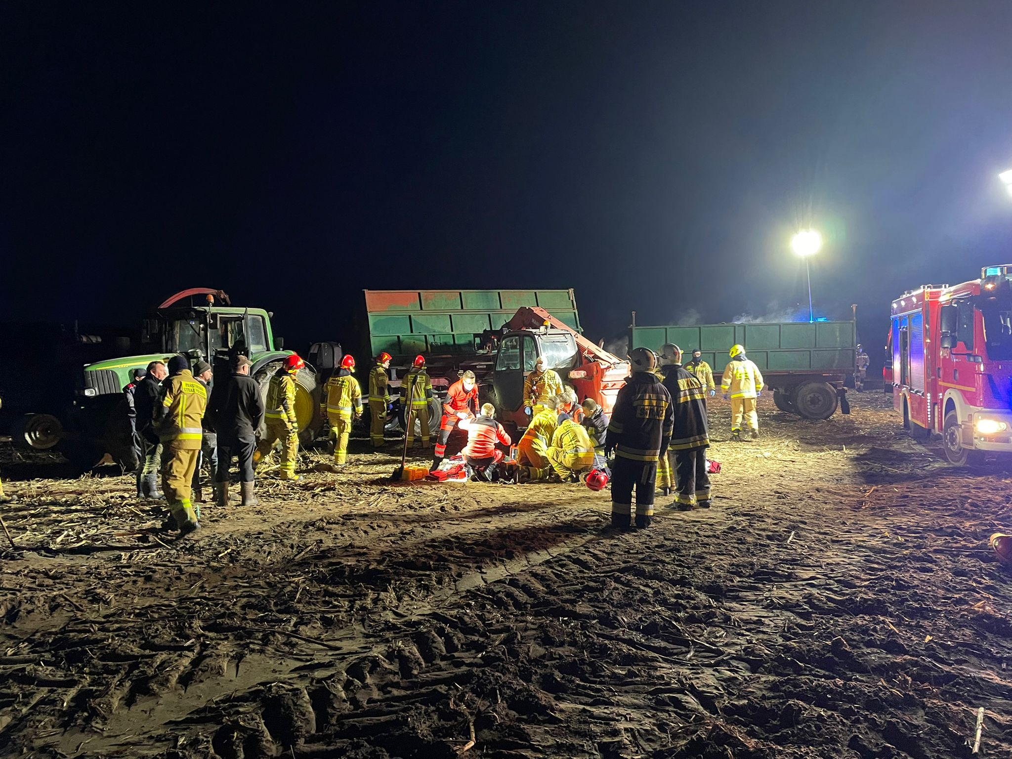 Po przybyciu na miejsce zdarzenia zadysponowanych sił i środków i rozpoznaniu ustalono, że w m.Brześnica podczas prac polowych doszło do przygniecenia w połowie mężczyzny - brak funkcji życiowych. Działania JOP polegały na zabezpieczeniu miejsca zdarzenia, oświetleniu terenu akcji,wykonaniu dostępu do osoby poszkodowanej przy pomocy sprzętu specjalnego celem podniesienia przyczepy i ewakuacji osoby. Po podniesieniu przyczepy i ustabilizowaniu jej przy pomocy klinów ewakuowano poszkodowanego a nastepnie przystąpiono do RKO.Kwalifikowaną pierwszą pomoc realizowano przy użyciu rurki ustno - gardłowej, maski krtaniowej oraz AED. Po przybyciu ZRM na miejsce zdarzenia lekarz stwierdził zgon.W dalszej części działania polegały na zabezpieczeniu miejsca prowadzonych działań i oświetleniu podczas czynności policyjnych. Udział 7 zastępów 24 ratowników w tym oficer w dyspozycji komendanta powiatowego PSP w Śremie oraz 2 zastepy JRG Gostyń, Policja, ZRM.