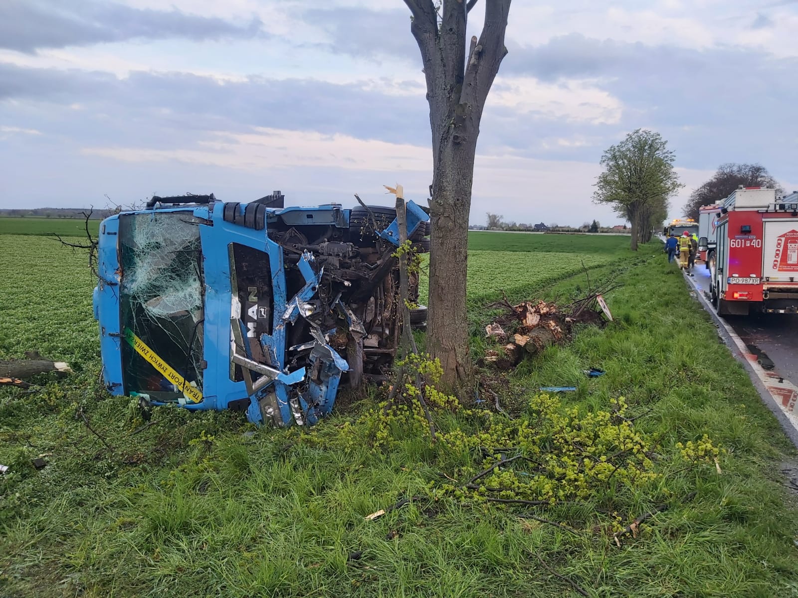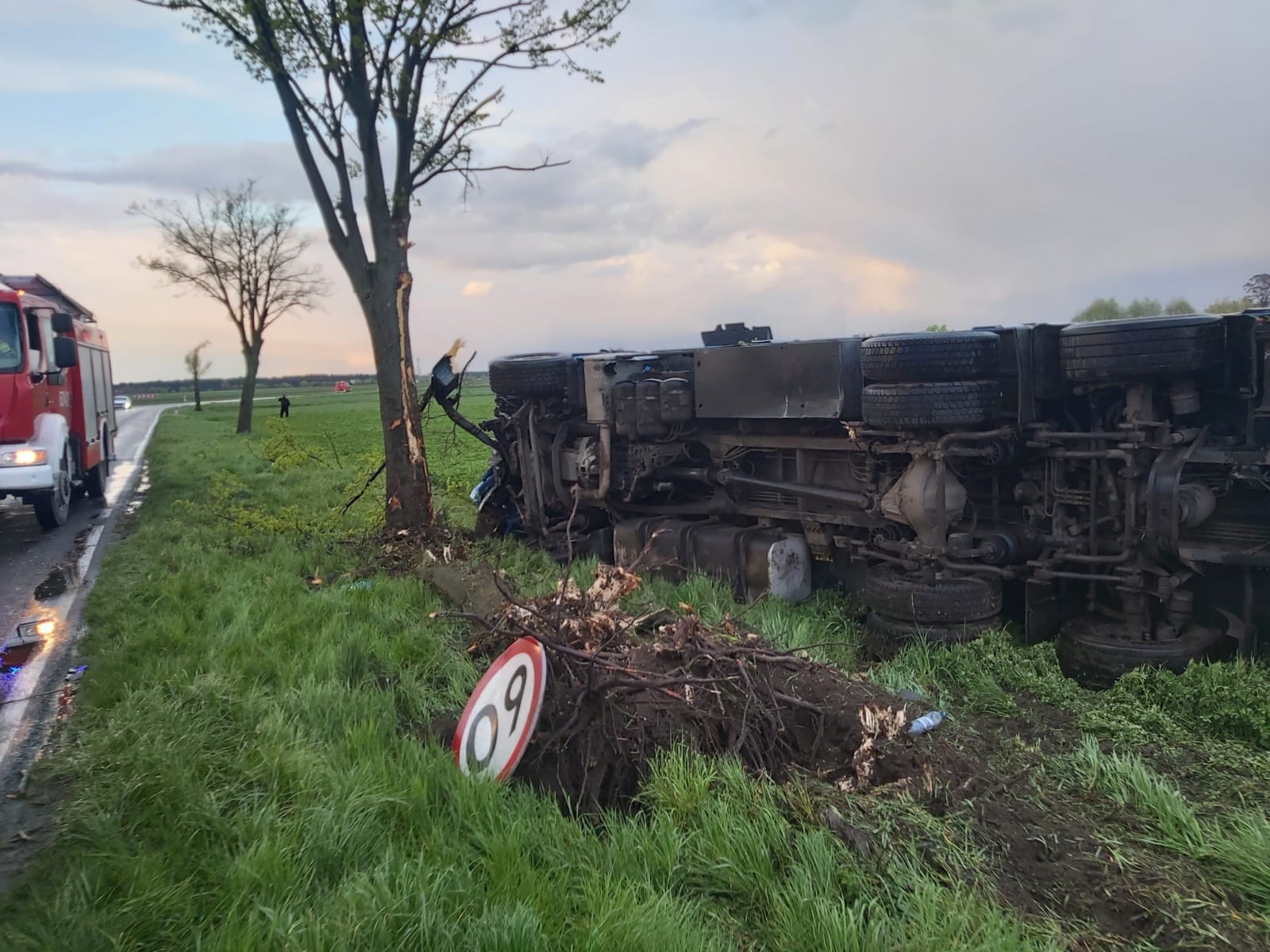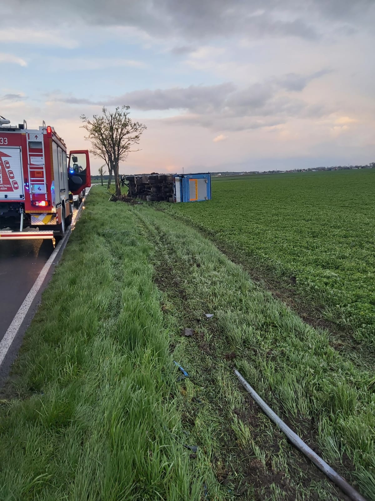 Po przybyciu zadysponowanych sił i środków na miejsce zdarzenia ustalono w wyniku rozpoznania, że samochód ciężarowy leży w rowie DW 432 zablokowana. Działania JOP polegały na zabezpieczeniu miejsca zdarzenia, odłączeniu akumulatorów, dokładnym przeszukaniu kabiny pojazdu oraz terenu wokół niego. Żadnych osób nie odnaleziono. Samochód poruszał się z pustą skrzynią ładunkową. W trakcie działań przyjechał samochodem lawetą kierujący tą ciężarówką. Odmówił udzielania kpp. Udział 4 zastępy 19 ratowników, Policja, ZRM.