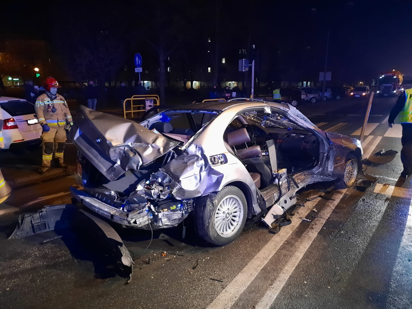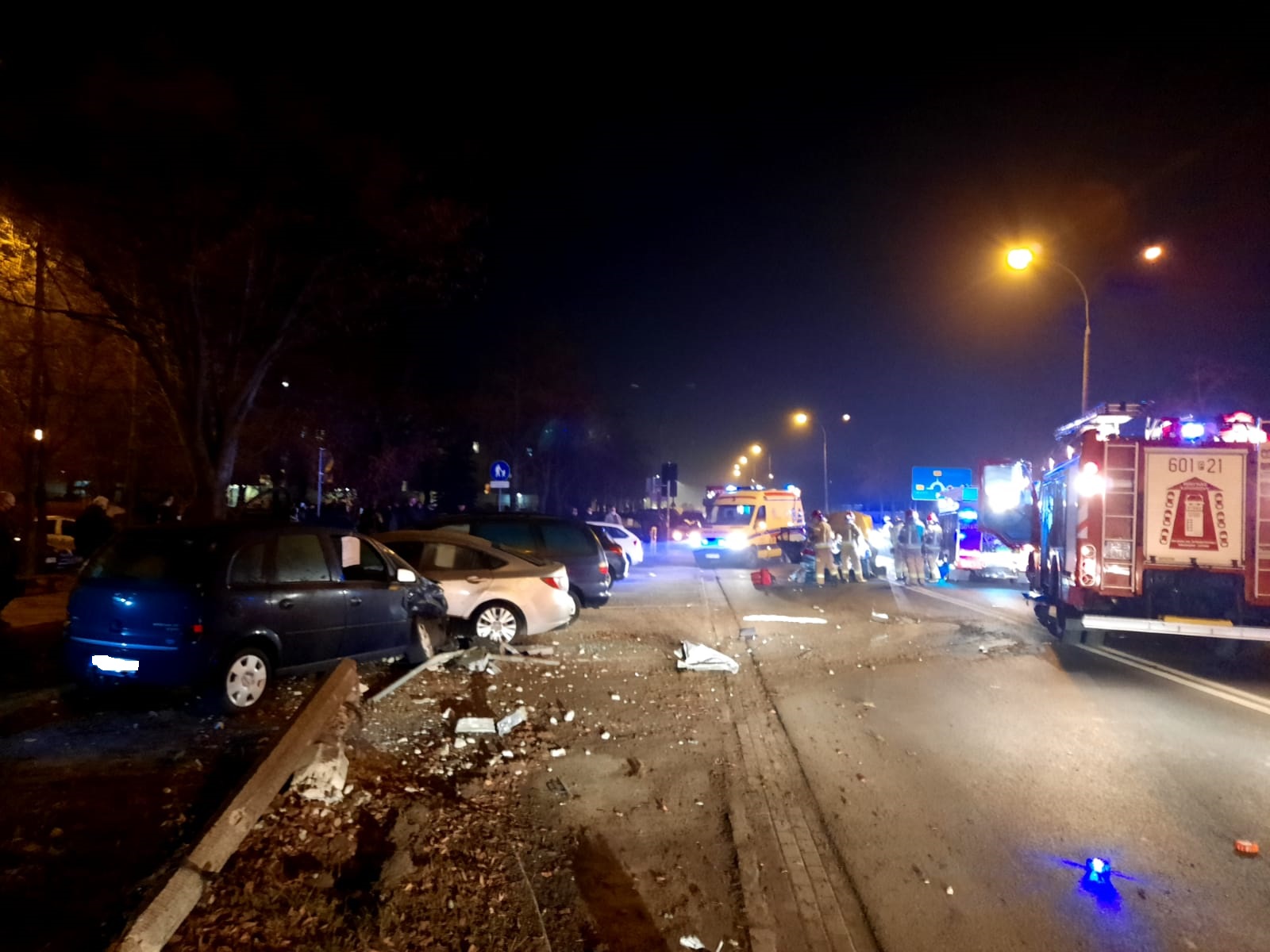 Po przybyciu na miejsce zdarzenia zadysponowanych sił i środków i rozpoznaniu ustalono, że pojazd znajduje się na środku drogi rozbity, w pojeździe jedna osoba przytomna niezakleszczona, dwie osoby poza pojazdem. Na parkingu przy drodze zniszczone 3 samochody oraz latarnia uliczna. Działania straży pożarnej polegały na zabezpieczeniu miejsca zdarzenia, rozłączeniu akumulatora, pomocy ZRM w wydostaniu z pojazdu osoby poszkodowanej. Przy pomocy hotstick sprawdzono napięcie przy uszkodzonej latarni - urządzenia nie wskazały napięcia. Zabezpieczono teren wokół urządzenia w postaci otaśmowania. Po zakończonych czynnościach przy pomocy sorbentu usunięto plamę oleju napędowego. Zabezpieczoną,uszkodzoną lampę uliczną przekazano pogotowiu energetycznemu. Na czas działań ruch na drodze DW 432 był wstrzymany w obu kierunkach.Pasażerowie zostali po przebadaniu przez ZRM zabrani do szpitala celem dalszej hospitalizacji. Udział 2 zastępy 8 ratowników, Policja, ZRM, Pogotowie Energetyczne.