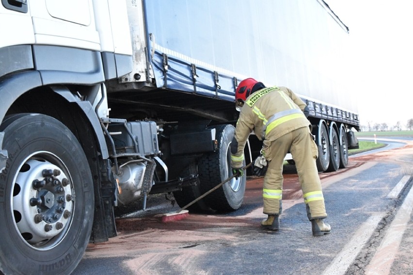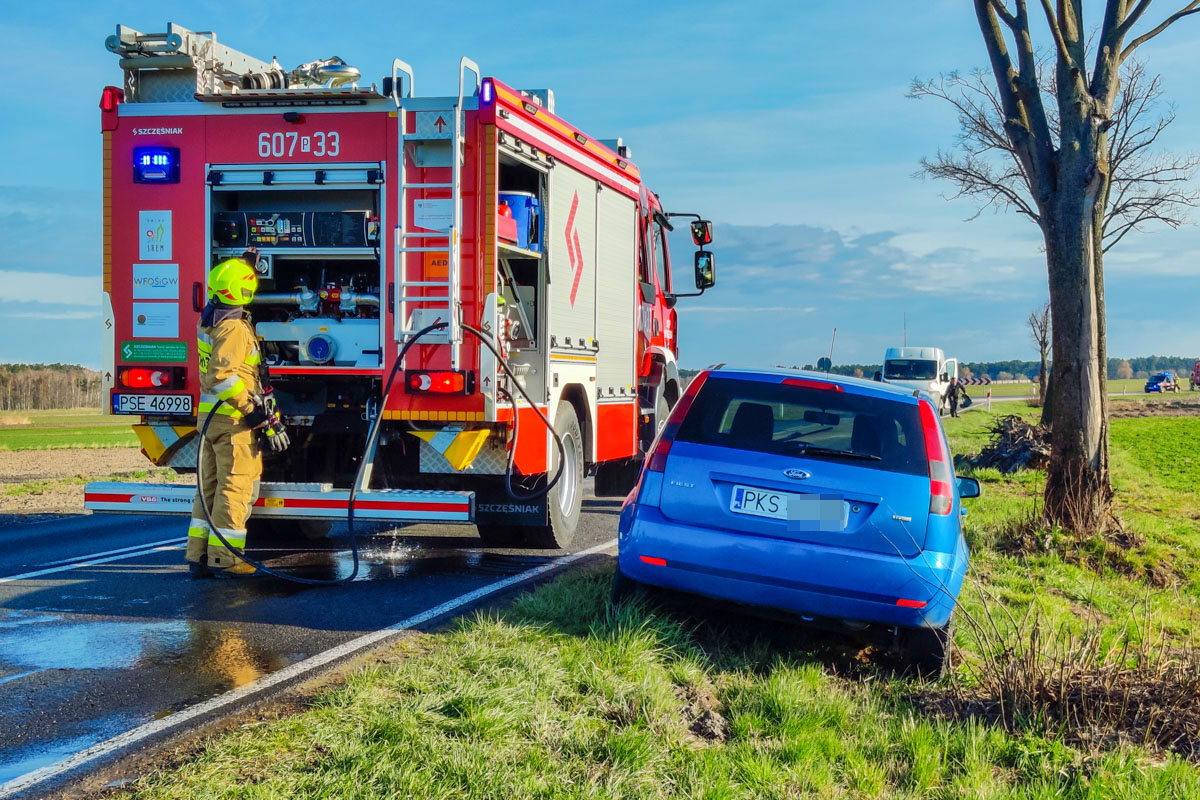 Po przybyciu na miejsce zadysponowanych sił i środków ustalono w wyniku rozpoznania, że miał miejsce wypadek samochodu ciężarowego i osobowego, na długości ok. 300m rozlana substancja ropopochodna w wyniku uszkodzenia zbiornika z olejem napędowym. Uczestnicy w pierwszej fazie odmówili udzielania pomocy JOP. Działania polegały na zabezpieczeniu miejsca zdarzenia, neutralizacji substancji ropopochodnej przy pomocy sorbentu.W trakcie działań kierowca samochodu osobowego zgłosił potrzebę udzielenia pomocy, którą strażacy zrealizowali oraz wezwano ZRM. Po przybyciu Zespołu Ratownictwa Medycznego poszkodowany został przekazany, gdzie nastepnie ZRM zabrał poszkodowanego do szpitala. Na czas działań ruch w obu kierunkach na drodze 432 został zamknięty. Udział 5 zastępów 14 ratowników w tym grupa operacyjna z KP PSP Śrem, Policja, ZRM.