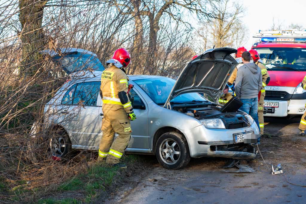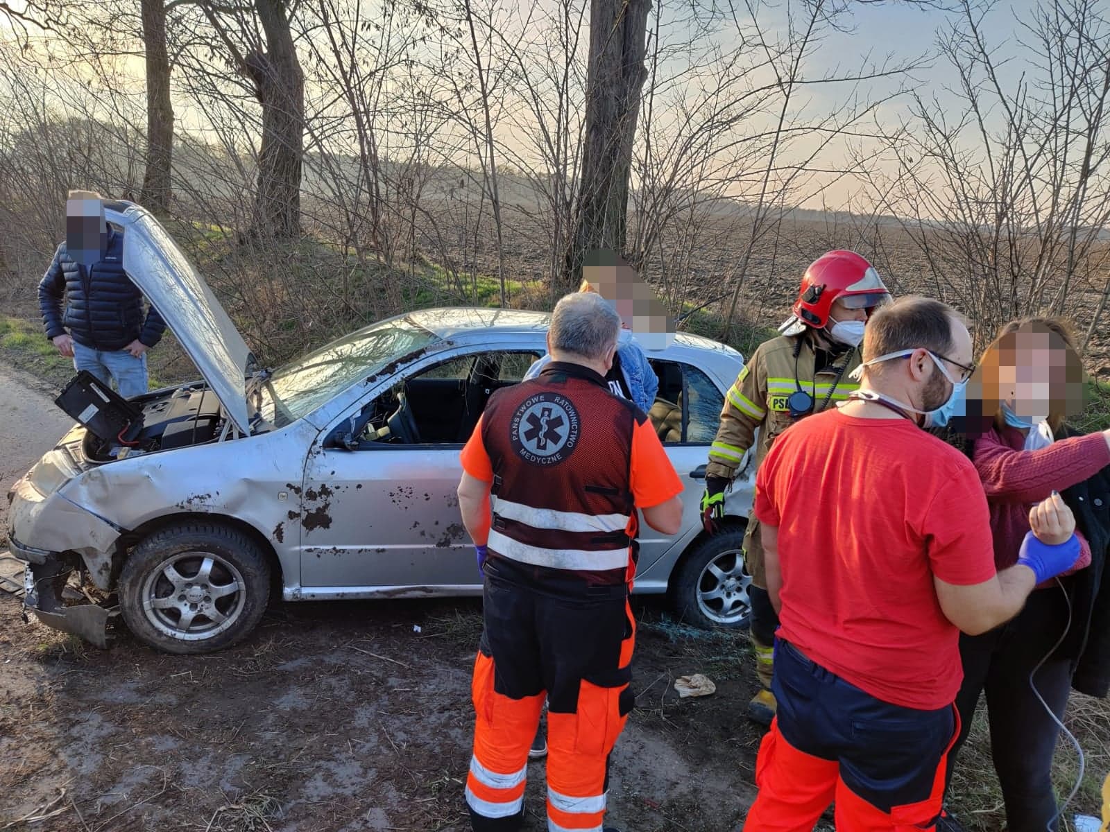 Po przybyciu na miejsce zdarzenia zadysponowanych zastępów ustalono w rozpoznaniu, że samochód osobowy stoi na kołach na drodze powiatowej 2 osoby poszkodowane. Działania JOP polegały na zabezpieczeniu miejsca zdarzenia, odłączeniu akumulatorów oraz udzelaniu kpp osobom poszkodowanym, które zostały przekazane ZRM po jego przybyciu. Po przebadaniu ZRM podjął decyzję o transportowaniu jednej osoby do szpitala celem dalszej hospitalizacji, druga osoba pozostała na miejscu zdarzenia. Na czas działań ruch na drodze powiatowej był wstrzymany. Udział 3 zastępy 13 ratowników, ZRM i Policja.