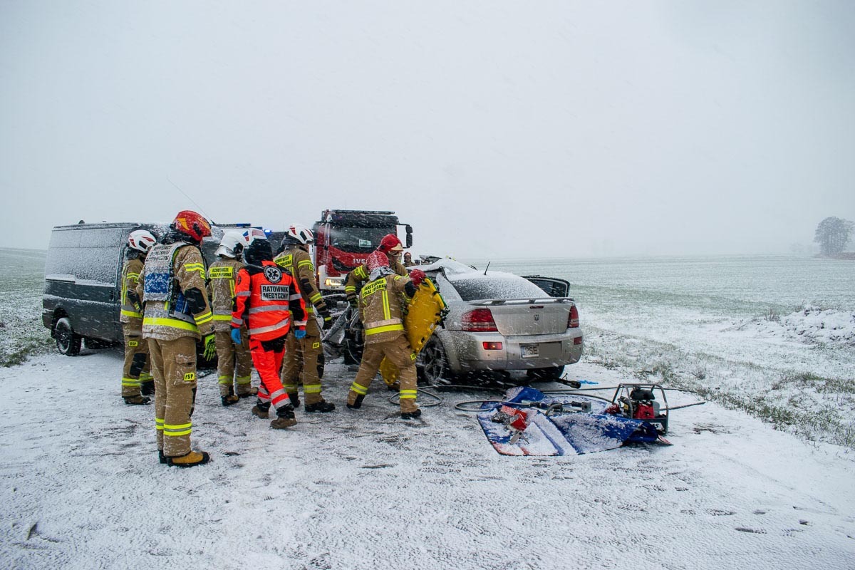 Po przybyciu na miejsce akcji stwierdzono, że w zdarzeniu drogowym udział brały samochód osobowy oraz samochód dostawczy. Kierowca auta osobowego w pojeździe, drugi natomiast poza pojazdem, który opuścił o własnych siłach.