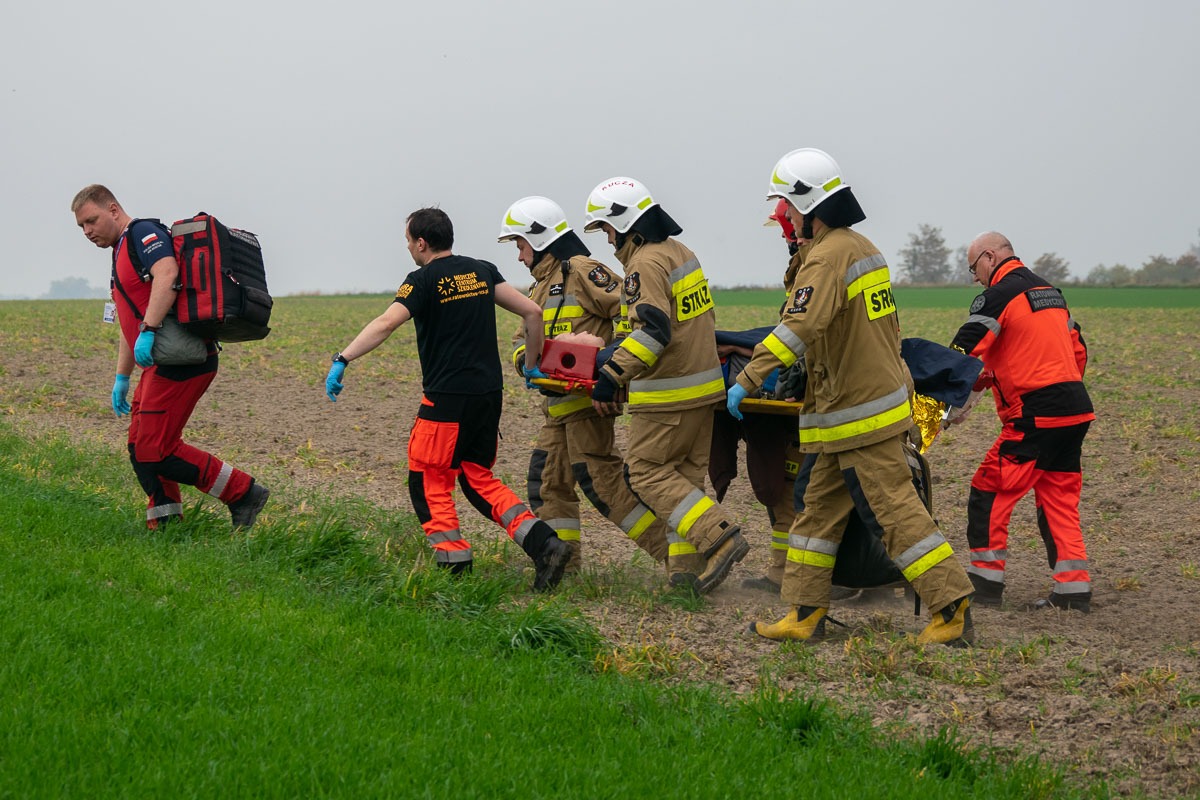 Po przybyciu na miejsce akcji stwierdzono, że w zdarzeniu drogowym udział brał jeden samochód osobowy, którym podróżował tylko kierowca. Auto uderzyło w przydrożne drzewo, na skutek czego ciężkich obrażeń ciała doznał kierujący pojazdem mężczyzna . Aby go uwolnić z wraku pojazdu, ratownicy musieli użyć narzędzi hydraulicznych . Po wydostaniu poszkodowanego z samochodu, przetransportowano go na noszach typu deska do śmigłowca LPR, którym dalej został przewieziony do szpitala. Do zadań przybyłych na miejsce ratowników, należało zabezpieczenie miejsca zdarzenia, udzielenie KPP poszkodowanemu oraz uwolnienie go ze zniszczonego wraku. Podczas prowadzenia działań ruch drogowy na tym odcinku został całkowicie zablokowany. Udział 4 zastępy 17 ratowników. Policja ,PRM, LPR.