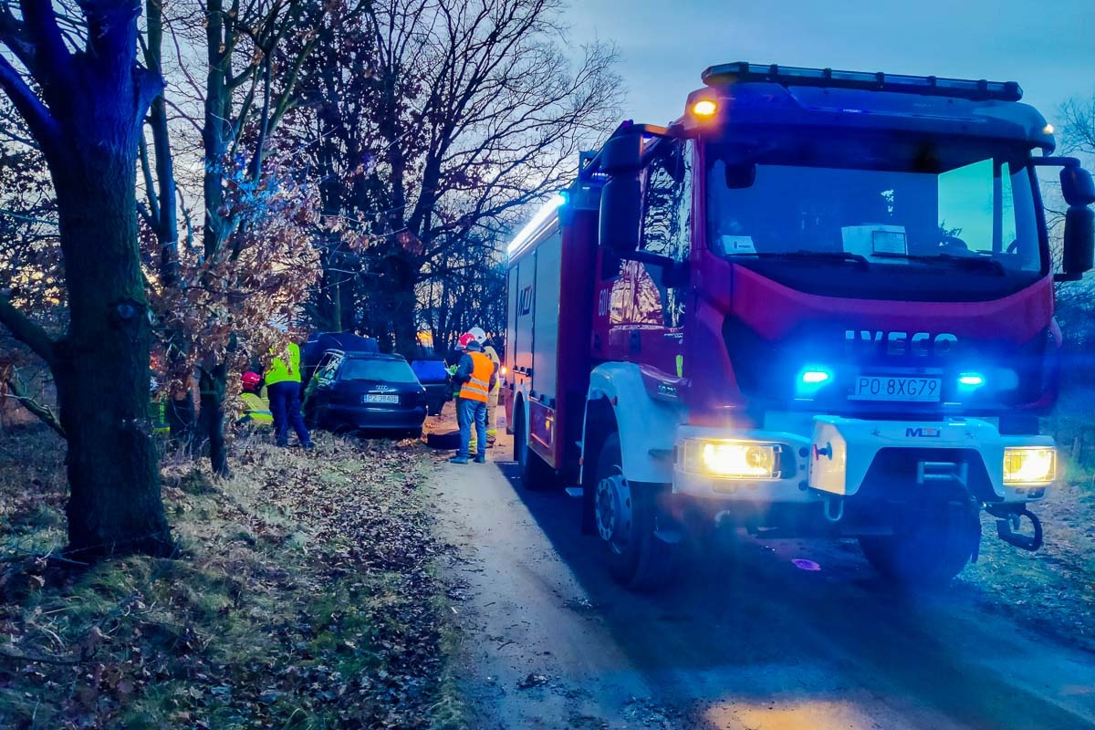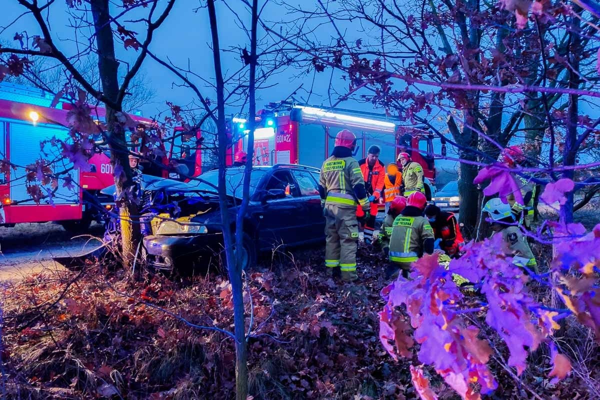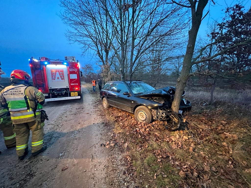 Po przybyciu na miejsce akcji stwierdzono, że w zdarzeniu drogowym udział brał jeden samochód osobowy, którym podróżował tylko kierowca. Auto uderzyło w przydrożne drzewo, kierujący opuścił pojazd przed przybyciem JOP o własnych siłach .