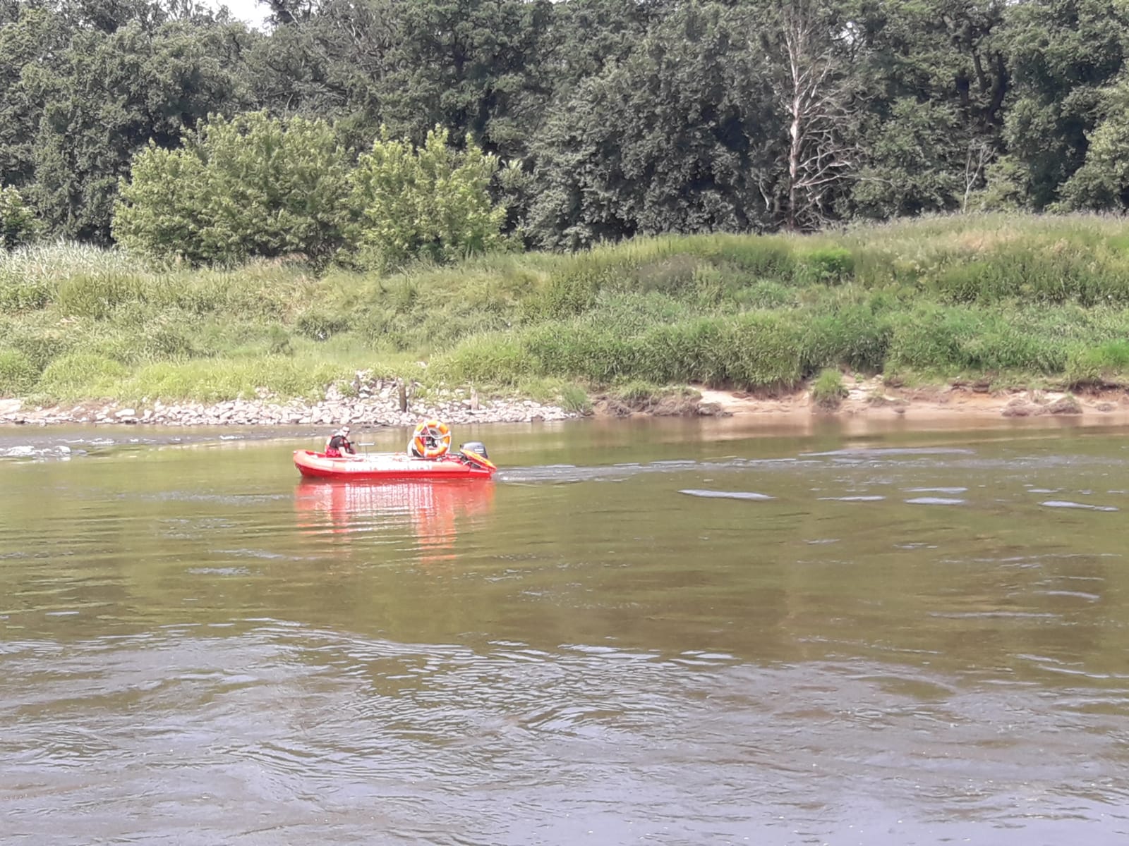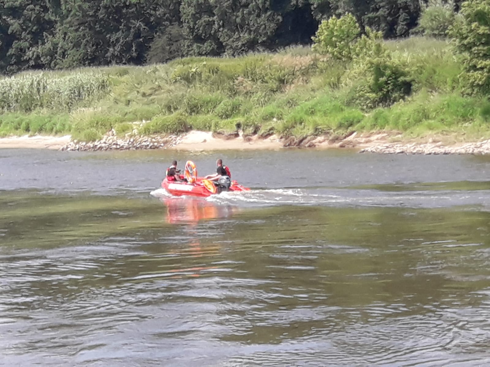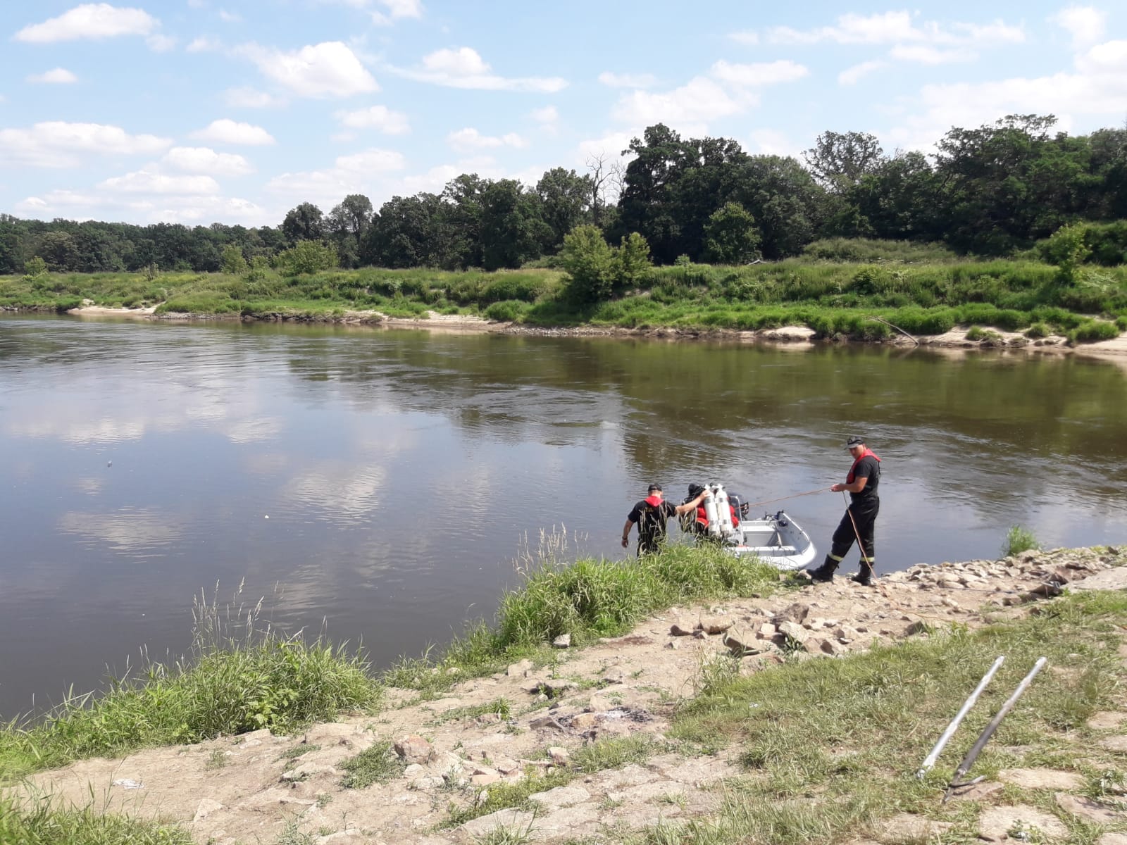 Nowy ślad, który się pojawił, to drugi brzeg Odry, po stronie powiatu wołowskiego. Próby nawoływania do zaginionych okazały się skuteczne. Usłyszano krzyki na przeciwnym brzegu. Strażacy łodzią przeprawili się na drugi brzeg i rozpoczęli poszukiwania. W tym momencie jasne było, że działania ratownicze muszą być prowadzone równocześnie na obu brzegach…bo jeżeli jednej osobie udało się przedostać na przeciwny brzeg to może i druga również tam się znajduje.
