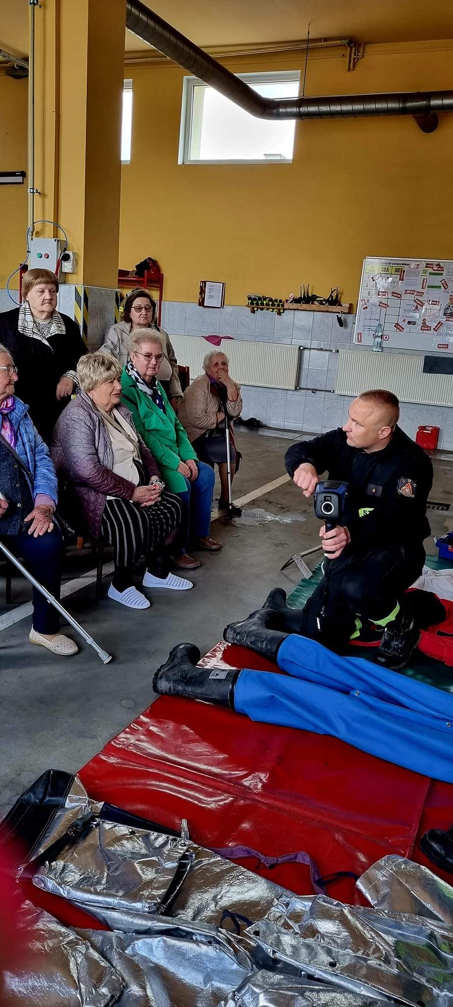 Podczas wizyty Panie zobaczyły na czym polega praca strażaka, oraz dowiedziały się jak należy zareagować będąc świadkiem zdarzenia wymagającego interwencji służb ratowniczych. Seniorki poznały szeroki zakres działań Straży Pożarnej, specyfikę strażackiej służby oraz sprzęt używany podczas różnego rodzaju zdarzeń. Panie poznały między innymi specjalistyczne ubrania używane podczas akcji, a niektóre z nich miały także okazję przymierzyć.