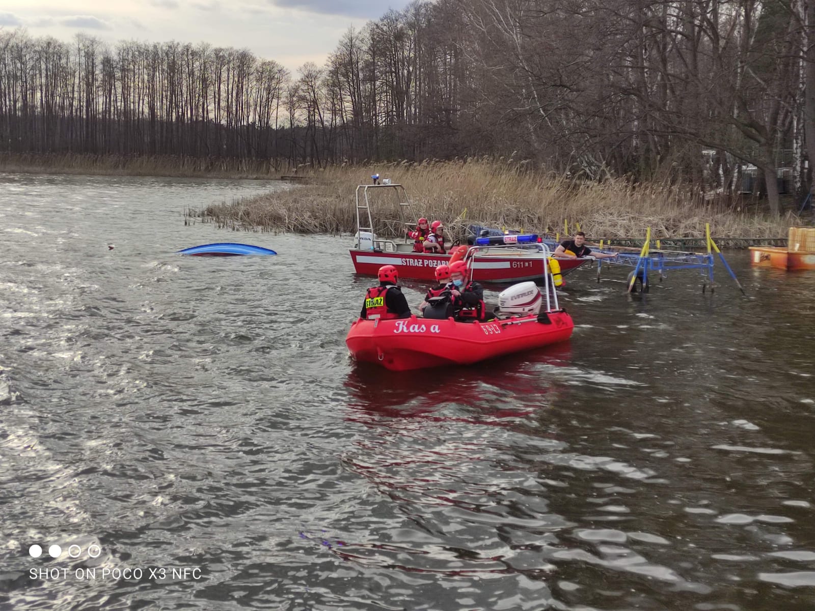 Po przybyciu strażaków okazało się, że prawdopodobnie na skutek silnego podmuchu wiatru doszło do wywrócenia żaglówki tupu „BEZ – 2” którą płynęli trzej mężczyźni. Na szczęście wszyscy dopłynęli do brzegu o własny siłach cali i zdrowi. Działania strażaków polegały na zabezpieczeniu miejsca zdarzenia oraz przyholowaniu za pomocą dwóch łodzi ratunkowych wywróconej jednostki do brzegu i zacumowaniu jej przy pomoście.