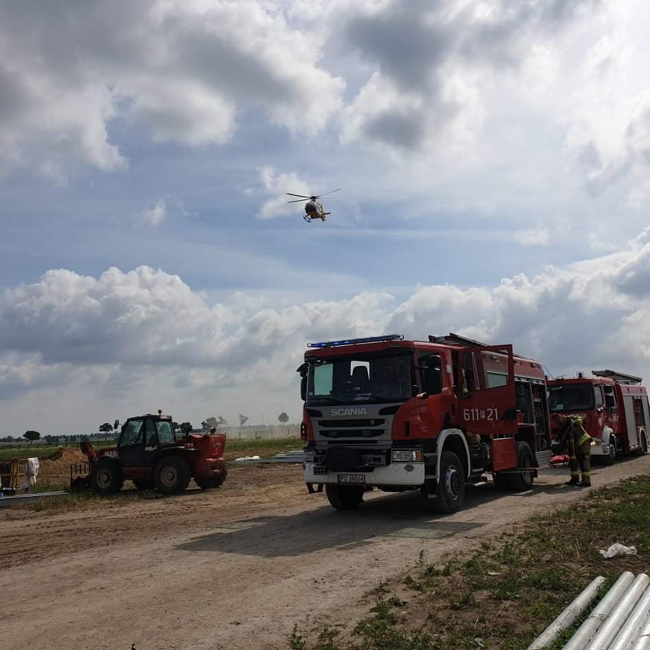 Do działań skierowano dwa zastępy z jednostki ratowniczo- gaśniczej w Środzie Wlkp. Po dojeździe na miejsce zdarzenia potwierdzono zgłoszenie. Wypadek powstał wskutek zahaczenia ładowarką teleskopową napowietrznych linii energetycznych o napięciu 15kV. Działania polegały na zabezpieczeniu miejsca zdarzenia oraz udzieleniu pomocy medycznej osobie poszkodowanej, a następnie przekazaniu jej przybyłemu na miejsce zdarzenia zespołowi Lotniczego Pogotowia Ratunkowego. Na miejsce zdarzenia skierowano również patrol Policji oraz Pogotowie Energetyczne.