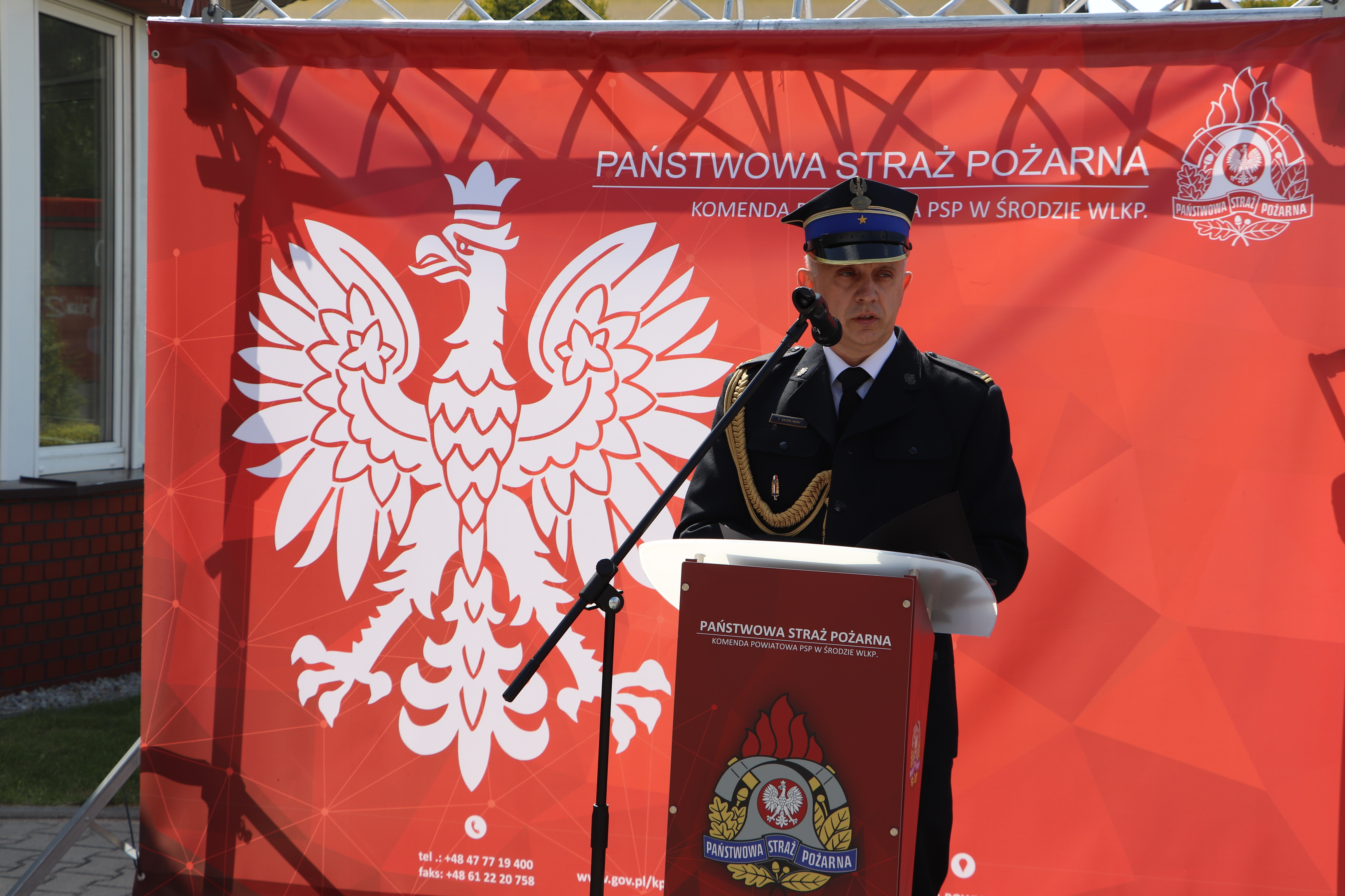 Komendant Powiatowy PSP w Środzie Wielkopolskiej mł. bryg. Tomasz Skorlinski, powitał przybyłych gości oraz obchodzących swoje święto strażaków. W swoim wystąpieniu podziękował wszystkim funkcjonariuszom i pracownikom cywilnym Komendy za zaangażowanie w codziennej służbie. Na ręce druha Prezesa przekazał również podziękowania i wyrazy uznania za poświęcenie Druhom z Ochotniczych Straży Pożarnych.