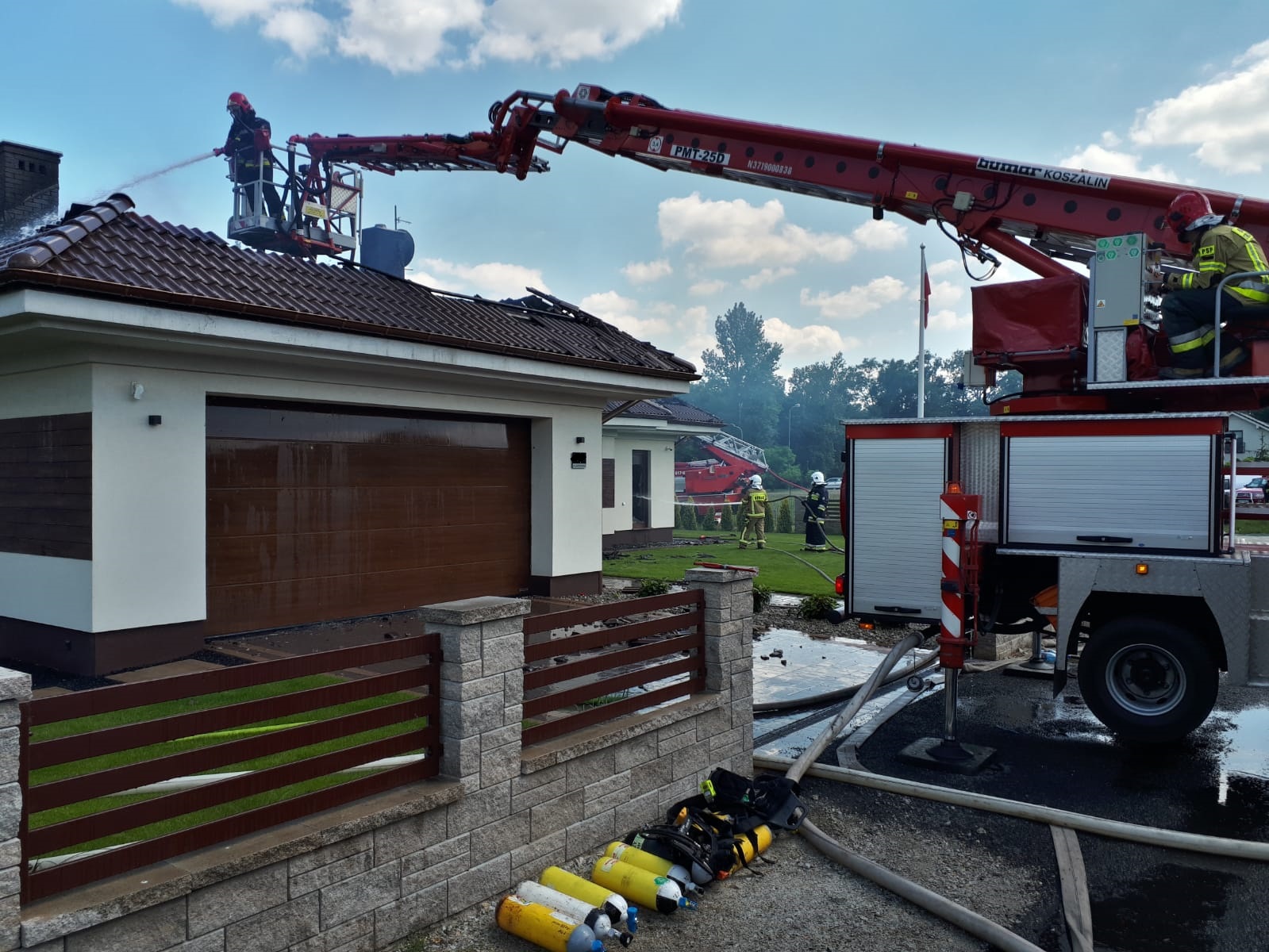 Do zdarzenia natychmiast zadysponowano strażaków z Jednostki Ratowniczo – Gaśniczej oraz druhów Ochotniczej Straży Pożarnej z Brodowa, Zaniemyśla, Koszut, Mącznik i Środy Wlkp. W momencie dojazdu pierwszych zastępów straży pożarnej na miejsce zdarzenia płomieniami objęty był już dach budynku.