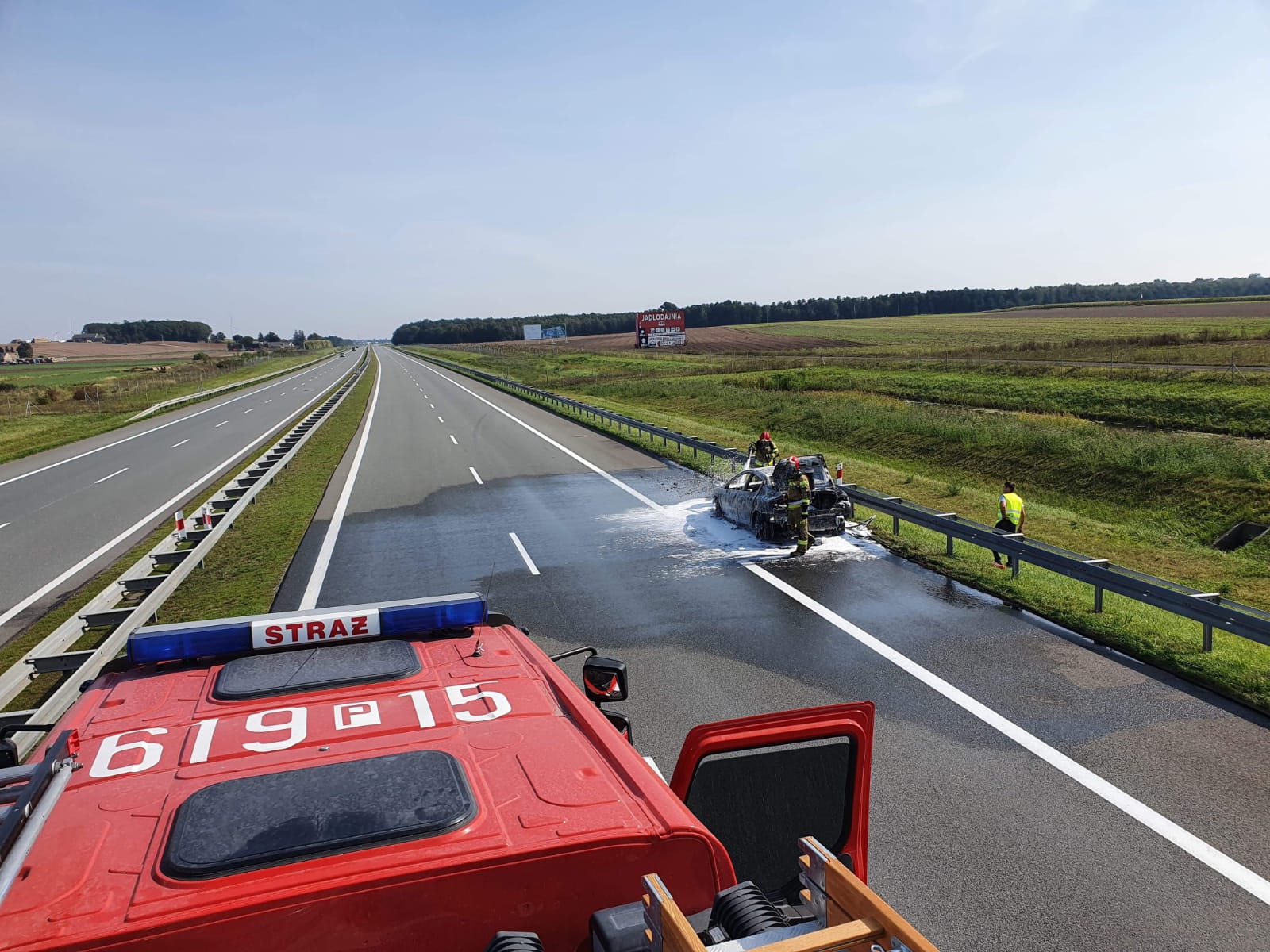 Po przybyciu jednostek Straży Pożarnej na miejsce zdarzenia i przeprowadzeniu rozpoznania ustalono, że pali się samochód osobowy marki Peugeot (cały objęty ogniem) a osoby podróżujące znajdują się poza pojazdem. Działania straży pożarnej polegały na zabezpieczeniu miejsca zdarzenia, podaniu jednego prądu wody w natarciu oraz jednego prądu piany gaśniczej ciężkiej na palący się pojazd. Po ugaszeniu pożaru i odparowaniu wody pojazd sprawdzono kamerą termowizyjną (zagrożenia nie stwierdzono). Na koniec zmyto pozostałości po pożarowe z jezdni . Podczas trwania akcji gaśniczej ruch w kierunku Warszawy był całkowicie zablokowany. Udział w zdarzeniu brały zastępy z JRG Środa Wlkp. oraz OSP Dominowo.