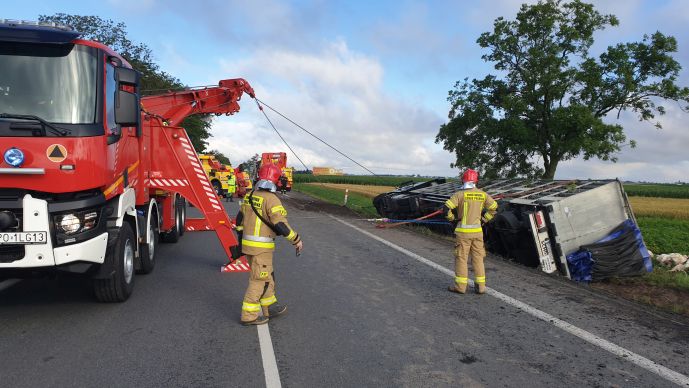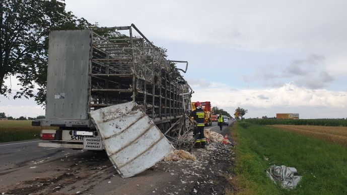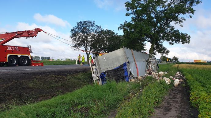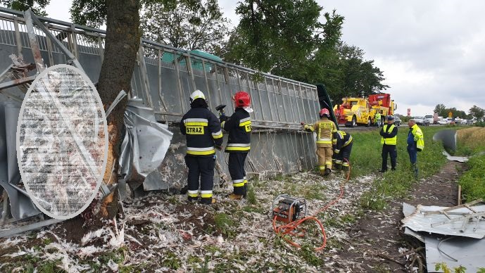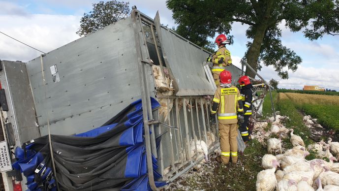 Kierujący samochodem ciężarowym, który przewoził 1800 szt. indyków z powodu niezachowania ostrożości podczas jazdy zjechał do rowu i uderzył w drzewo. Na szczęście kierujący pojazdem nie odniósł żadnych obrażeń jednak mniej szczęścia miały indyki przewożone na naczepie samochodu ciężarowego. Na miejsce zdarzenia zostali zadysponowani strażacy z Jednostki Ratowniczo - Gaśniczej w Środzie Wlkp. , specjalistyczna grupa ratownictwa technicznego z JRG 6 i 7 w Poznaniu oraz druhowie z OSP Koszuty. Strażacy przy użyciu specjalistycznego sprzętu wykonali dostęp do uwięzionych ptaków dzieki czemu pracownicy firmy przewozowej mogli je bezpiecznie przenieść do transportu zastępczego. Większą część ptaków udało się uratować a pozostała część została przetransportowana do zakładu utylizacyjnego. Po zakończonych działaniach samochód został wyciągnięty z rowu a ruch na drodze przywrócony.