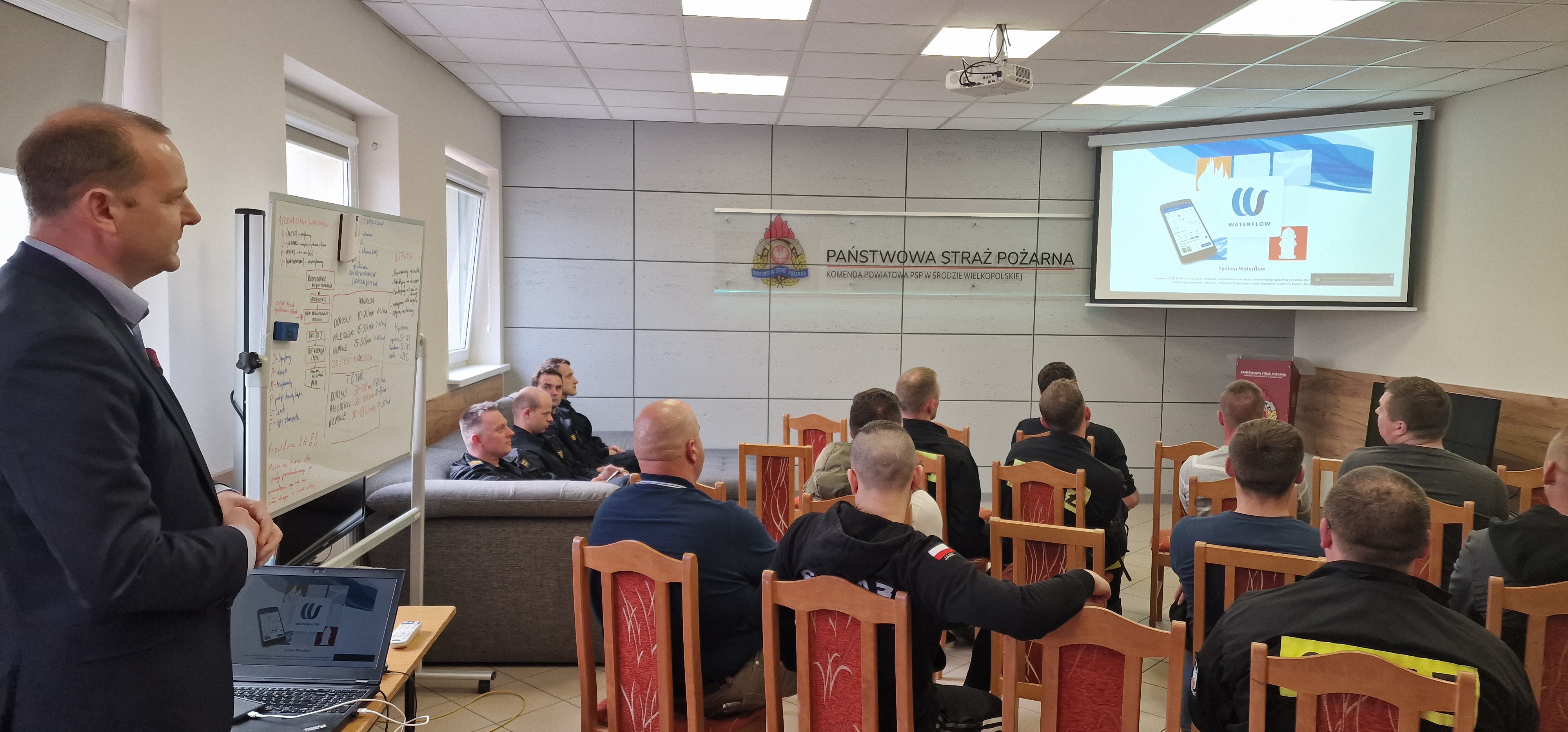 System WATERFLOW to dynamiczna mapa hydrantowa, która ułatwia lokalizację hydrantów i zbiorników wodnych dostarczając jednocześnie informację o stanie źródła wody oraz jego parametrach technicznych. Strażacy mając do dyspozycji aplikację w telefonie komórkowym na miejscu akcji mają narzędzie pozwalające na wspomaganie procesów decyzyjnych poprzez optymalizację prowadzenia linii wężowych, wyznaczanie ilości wody koniecznej do gaszenia oraz tworzenie bilansu zaopatrzenia i zapotrzebowania w czasie akcji. Kolejne wersje systemu mają pozwolić na szybkie uzyskanie informacji o planach budynków, które będą systematycznie dodawane do bazy danych.