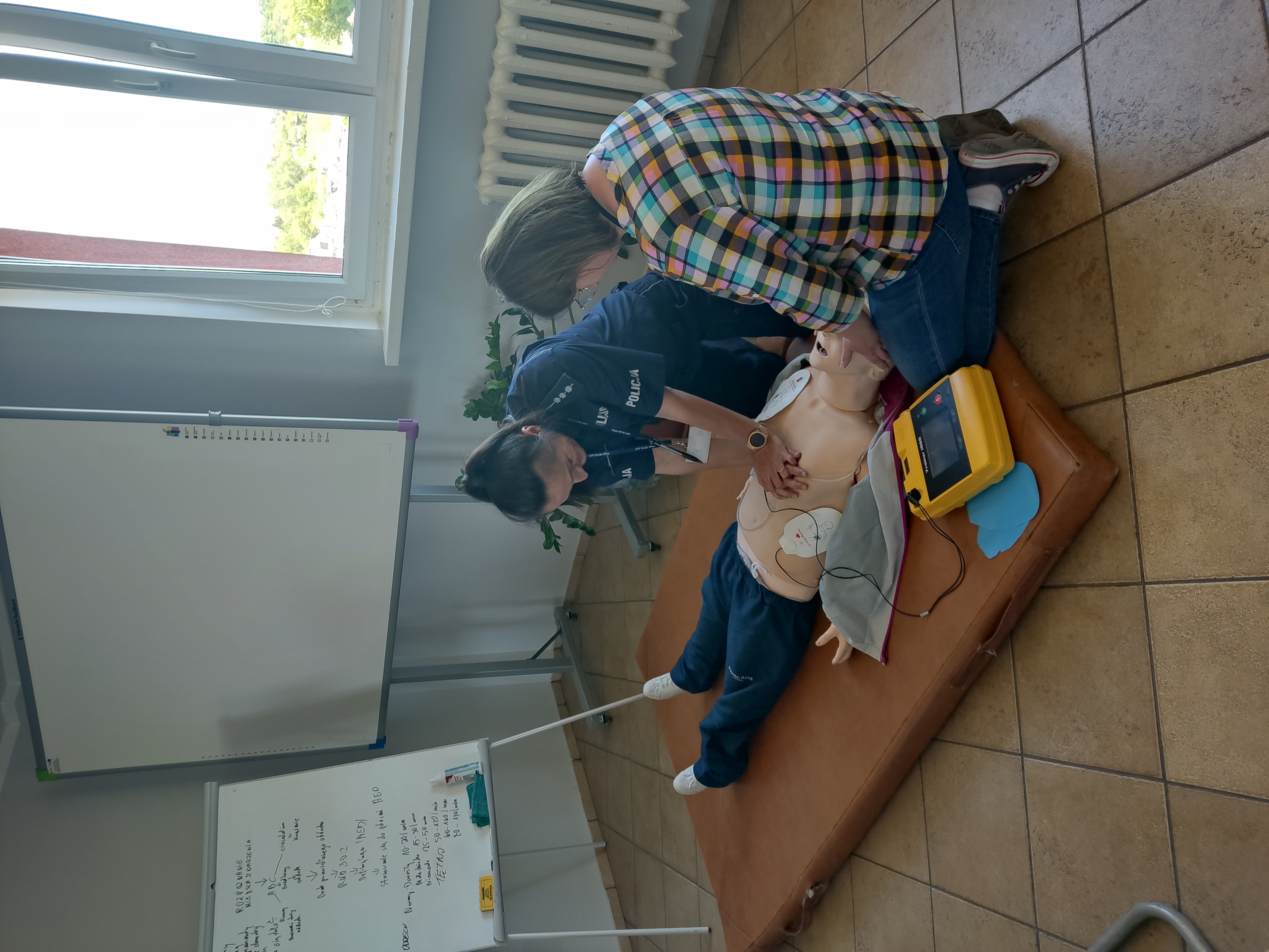 Praktyczną część szkolenia poświęcono na ćwiczenia z wykorzystaniem AED - automatycznego defibrylatora zewnętrznego oraz manekinów umożliwiających wykonanie resuscytacji krążeniowo – oddechowej.