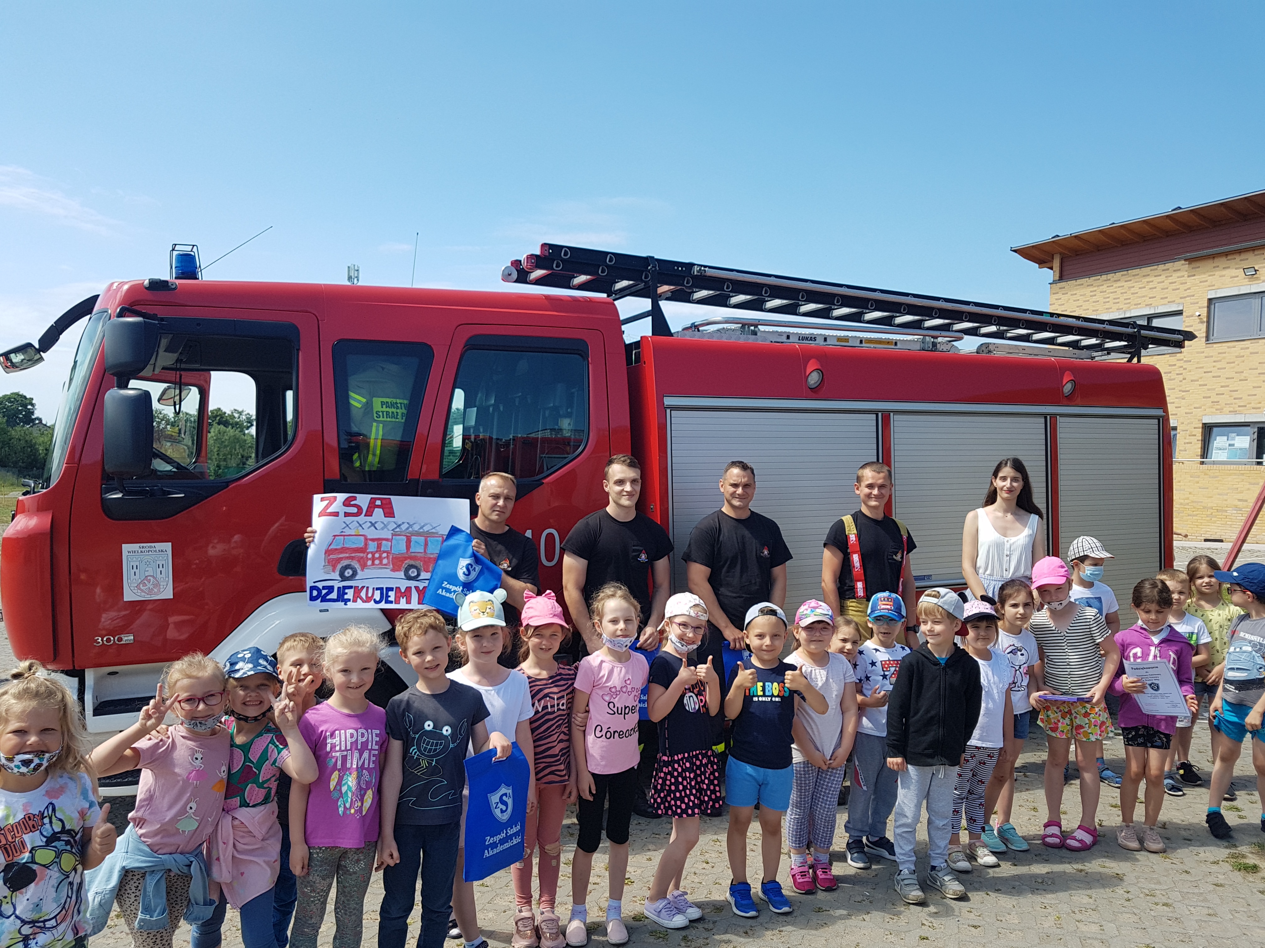 Na koniec klasy zrobiły pamiątkowe zdjęcia ze strażakami na tle wozów bojowych i wraz z opiekunami wręczyli podziękowania oraz własnoręcznie wykonany plakat.