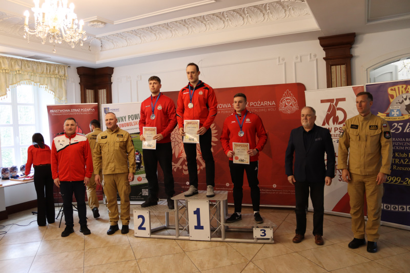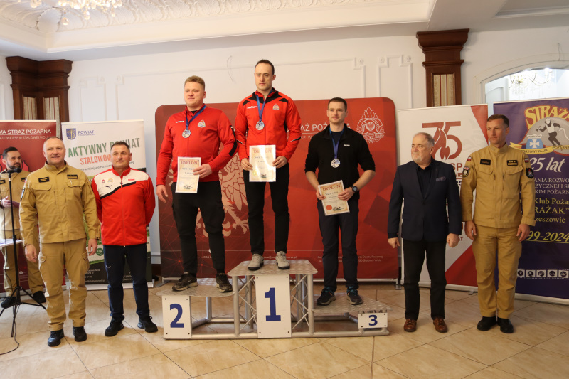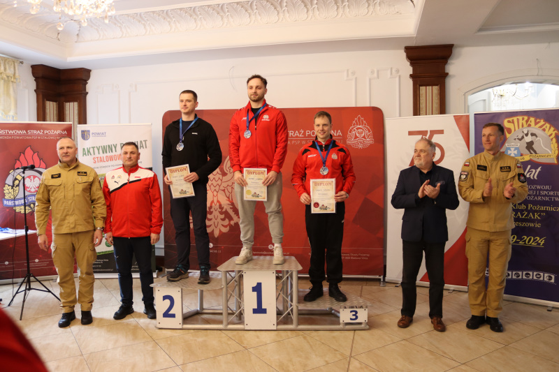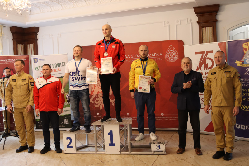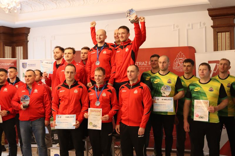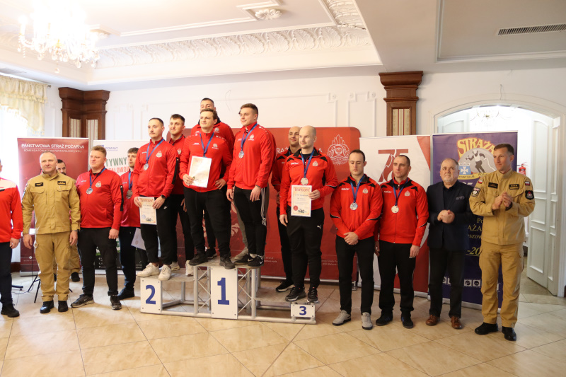 mł. kpt. Polowski Jakub, mł. bryg. Krystian Bąk, mł. kpt. Sławomir Bąk, ogn. Mariusz Wędrychowski - zdobyli brązowy medal w konkurencji 4x50 m stylem dowolnym