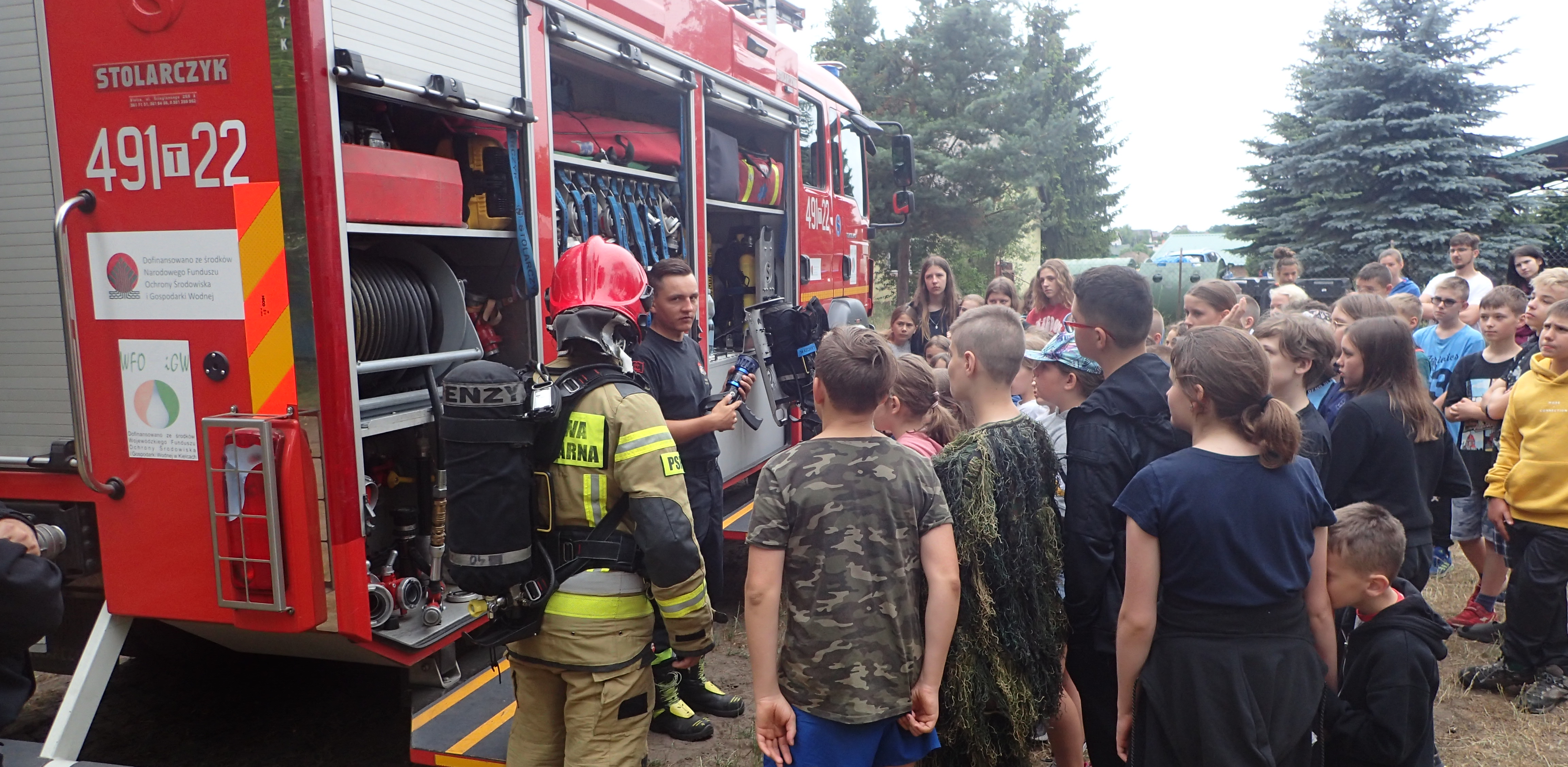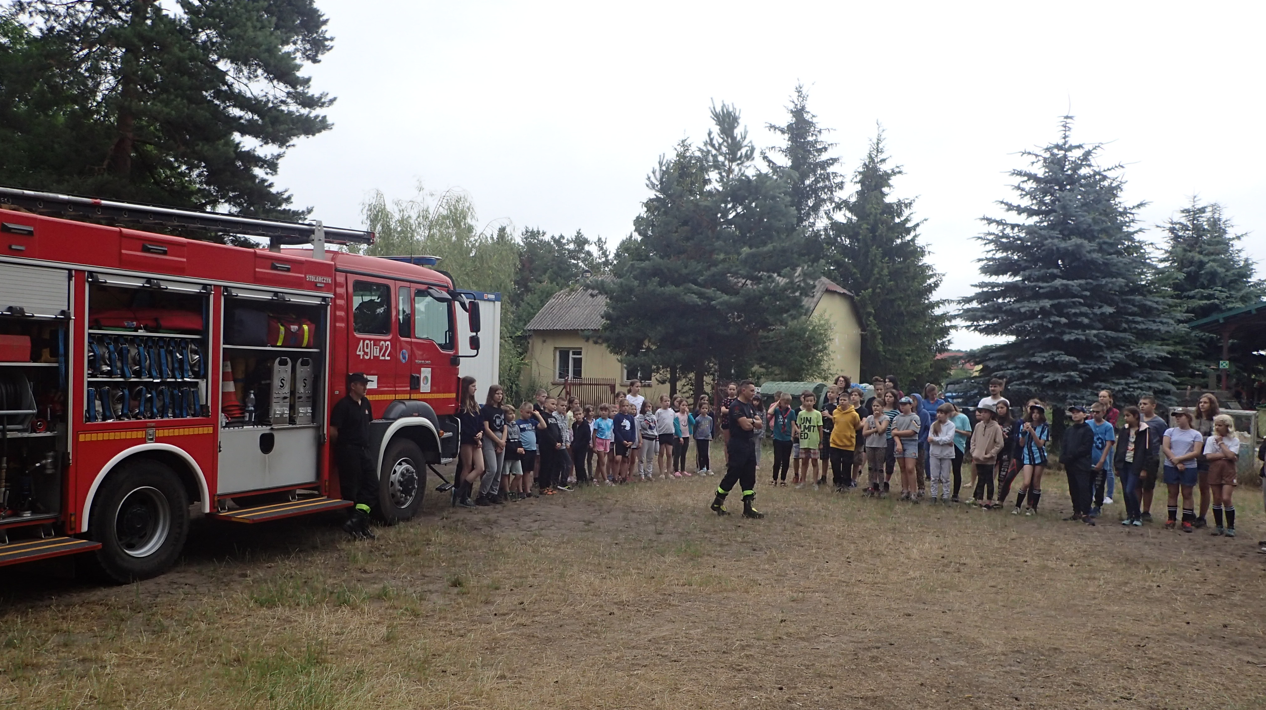 W ramach akcji propagującej bezpieczeństwo strażacy z Jednostki Ratowniczo-Gaśniczej przeprowadzili dla uczestników obozu pogadankę dotyczącą zasad bezpieczeństwa w czasie wypoczynku w lesie i nad wodą. Omówiono również zagrożenia jakie mogą występować na terenie kąpielisk i kompleksów leśnych. Strażacy zaprezentowali również sprzęt znajdujący się na samochodzie ratowniczo-gaśniczym oraz opowiedzieli
