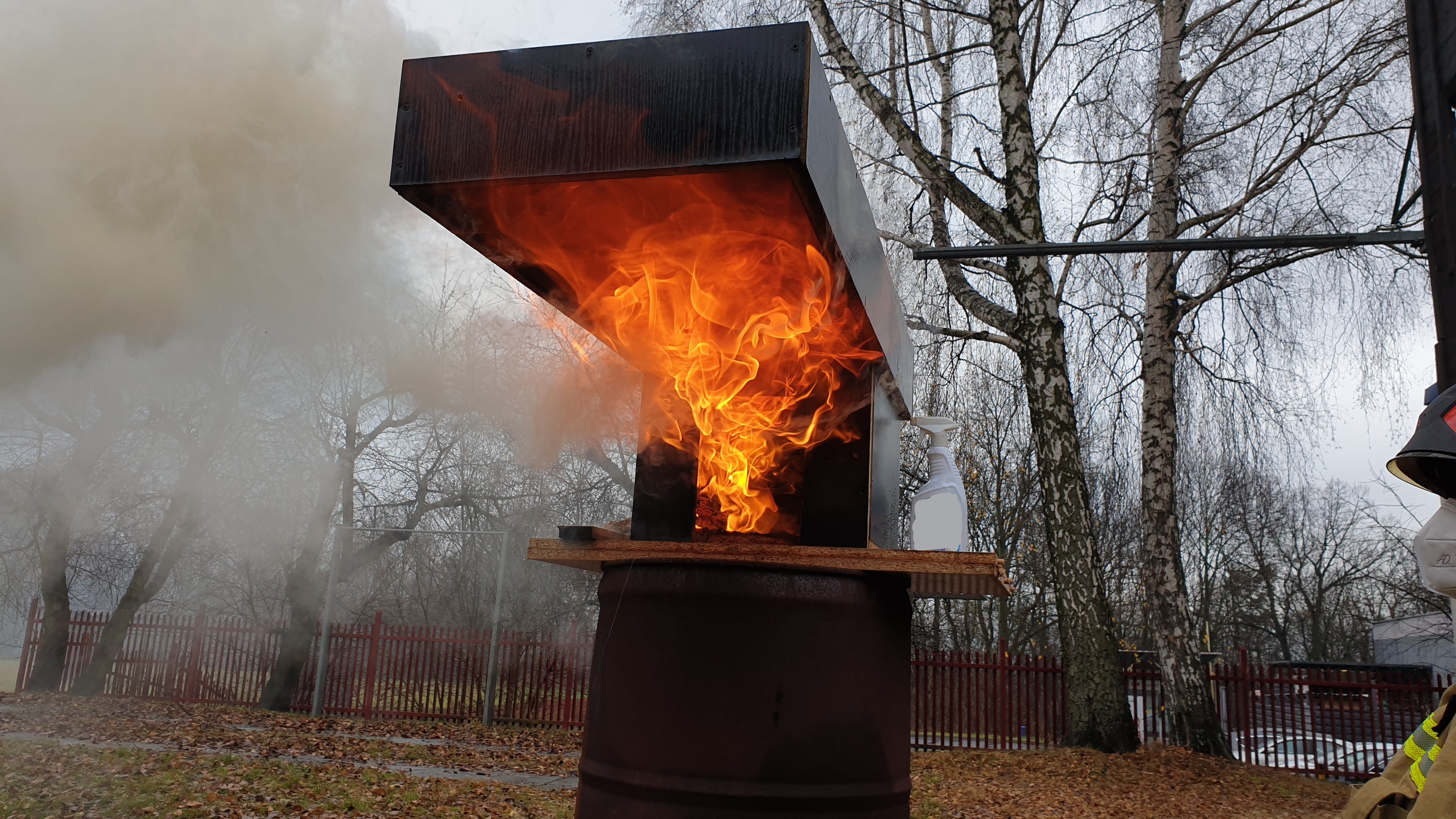 W trakcie trwania ćwiczeń przeprowadzono pokaz rozwoju pożaru w małej skali przy użyciu tzw. „małego domku dla lalek”, „dużego domku dla lalek” oraz domku z daszkiem.