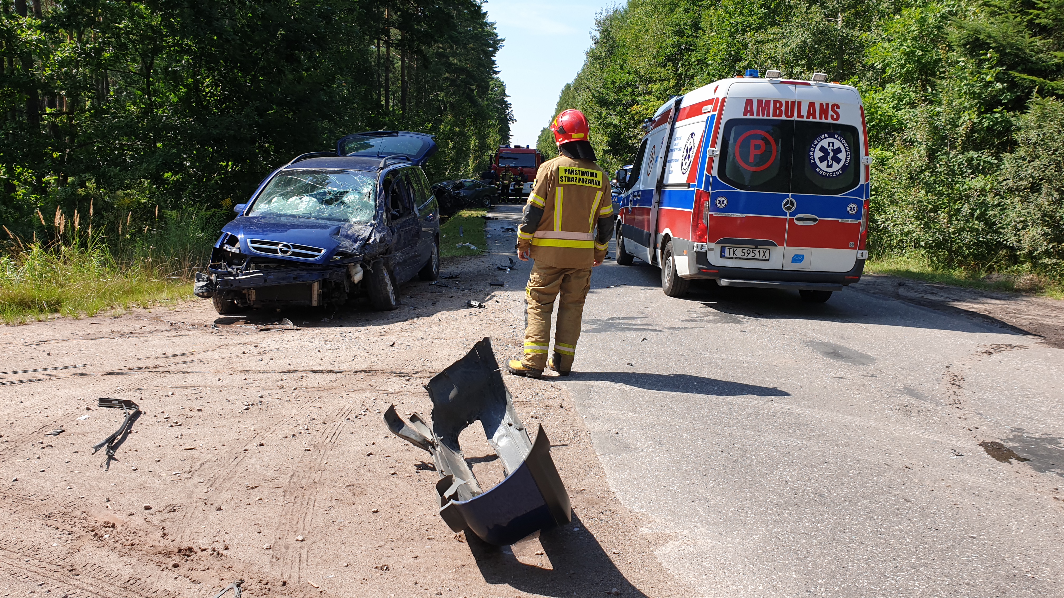 Do drugiego zdarzenia doszło o godzinie 13:05 w Adamowie na ulicy Starachowickiej. Po przyjeździe na miejsce zdarzenia zastępów straży pożarnej stwierdzono wypadek drogowy z udziałem trzech samochodów osobowych. W wyniku zdarzenia ranne zostały trzy osoby – kierujący pojazdami Opel Zafira i BMW oraz nieletni (15lat) pasażer samochodu BMW. Wszystkie cztery osoby biorące udział w zdarzeniu wyszły z pojazdów o własnych siłach przed przyjazdem służb ratowniczych . Działania zastępów polegały na zabezpieczeniu miejsca zdarzenia oraz udzieleniu kwalifikowanej pomocy przedmedycznej trzem poszkodowanym do czasu przyjazdu zespołów ratownictwa medycznego. Kierowca pojazdu Renault Clio nie wymagał pomocy medycznej. Dalsze czynności polegały na odłączeniu źródeł zasilania we wszystkich pojazdach biorących udział w zdarzeniu, zakręceniu butli LPG w samochodzie Opel Zafira oraz usunięciu powstałej w wyniku zdarzenia plamy oleju za pomocą sorbentu Compakt. Przez czas trwania akcji droga była zamknięta dla ruchu pojazdów.