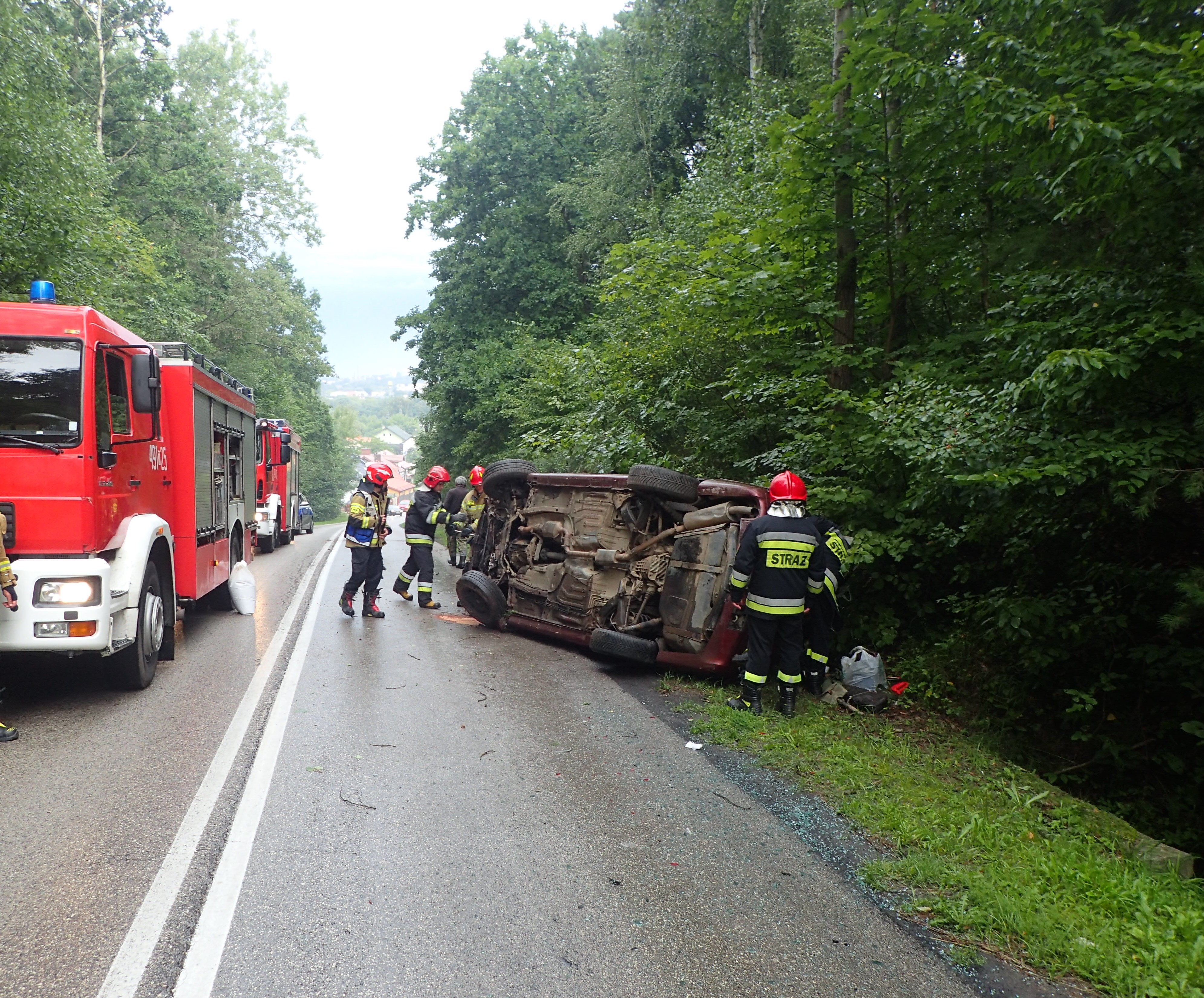 O godzinie 7:46 dyżurny stanowiska kierowania przyjął zgłoszenie o wypadku samochodu Opel Omega w Starachowicach przy ul. Zgodnej. Pojazd w chwili przyjazdu zastępów straży pożarnej leżał się na prawym boku, blokując jeden pas jezdni. Na miejscu znajdował się kierowca, który wyszedł o własnych siłach przed przybyciem służb ratowniczych. Działania zastępów polegały na zabezpieczeniu miejsca zdarzenia i postawieniu auta na koła w celu odłączenia zasilania i zakręcenia butli z gazem. Następnie usunięto płyny eksploatacyjne z jezdni przy użyciu sorbentu Compakt.