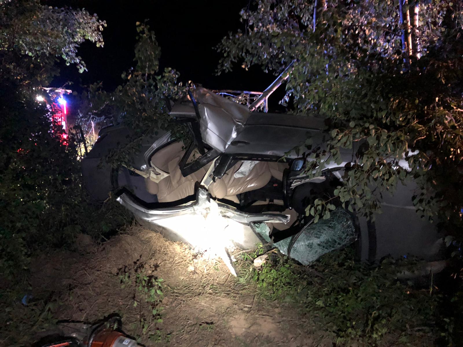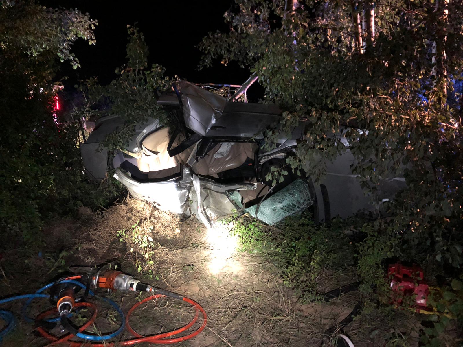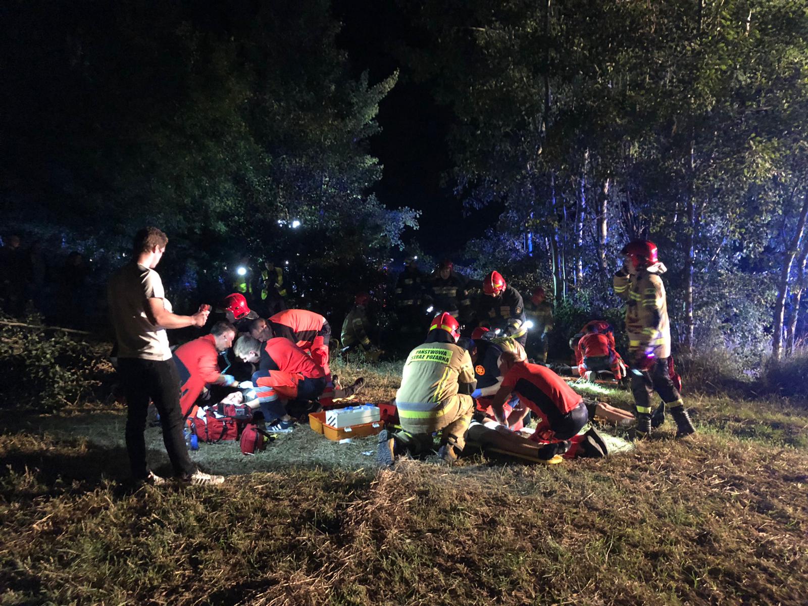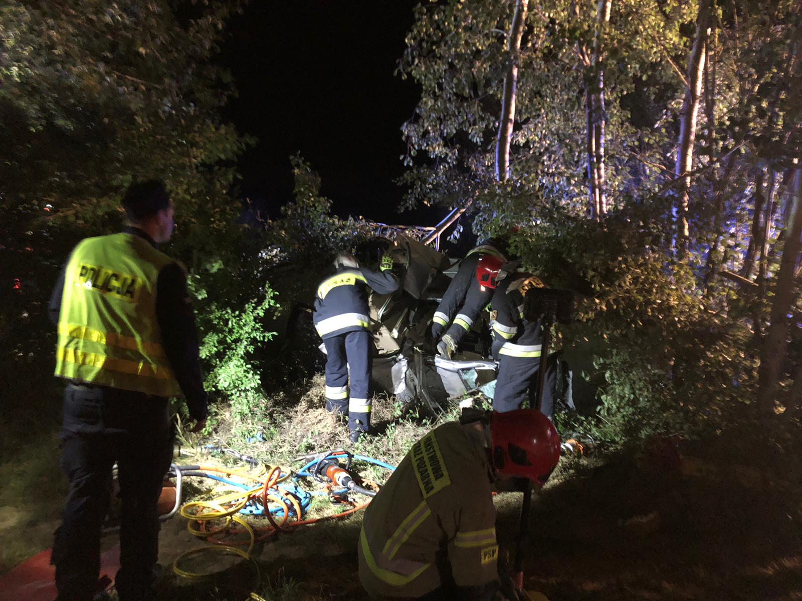 Po dojeździe do miejsca zdarzenia stwierdzono, że pojazd osobowy marki BMW wypadł z drogi i uderzył w przydrożne drzewo. Samochód znajdował się w trudnodostępnym miejscu całkowicie poza obrysem jezdni leżąc na boku. Strażacy ustalili miejsce zdarzenia po słabo świecącej lampie reflektora rozbitego BMW. Poza pojazdem, w pobliżu, leżał przytomny mężczyzna. Wewnątrz pojazdu uwięzione były 4 osoby, w tym 3 mężczyzn i 1 kobieta. Zastępy straży pożarnej dotarły równocześnie z zespołem ratownictwa medycznego. Po zabezpieczeniu miejsca zdarzenia strażacy musieli przeprowadzić wycinkę drzew, a następnie użyć sprzętu hydraulicznego, by wykonać dostęp do poszkodowanych. Utrudnieniem była pora nocna i trudny dostęp do wnętrza samochodu. Sukcesywnie ratownicy wydobywali rannych i wspomagali udzielanie im pomocy przez kolejne zespoły ratownictwa medycznego.