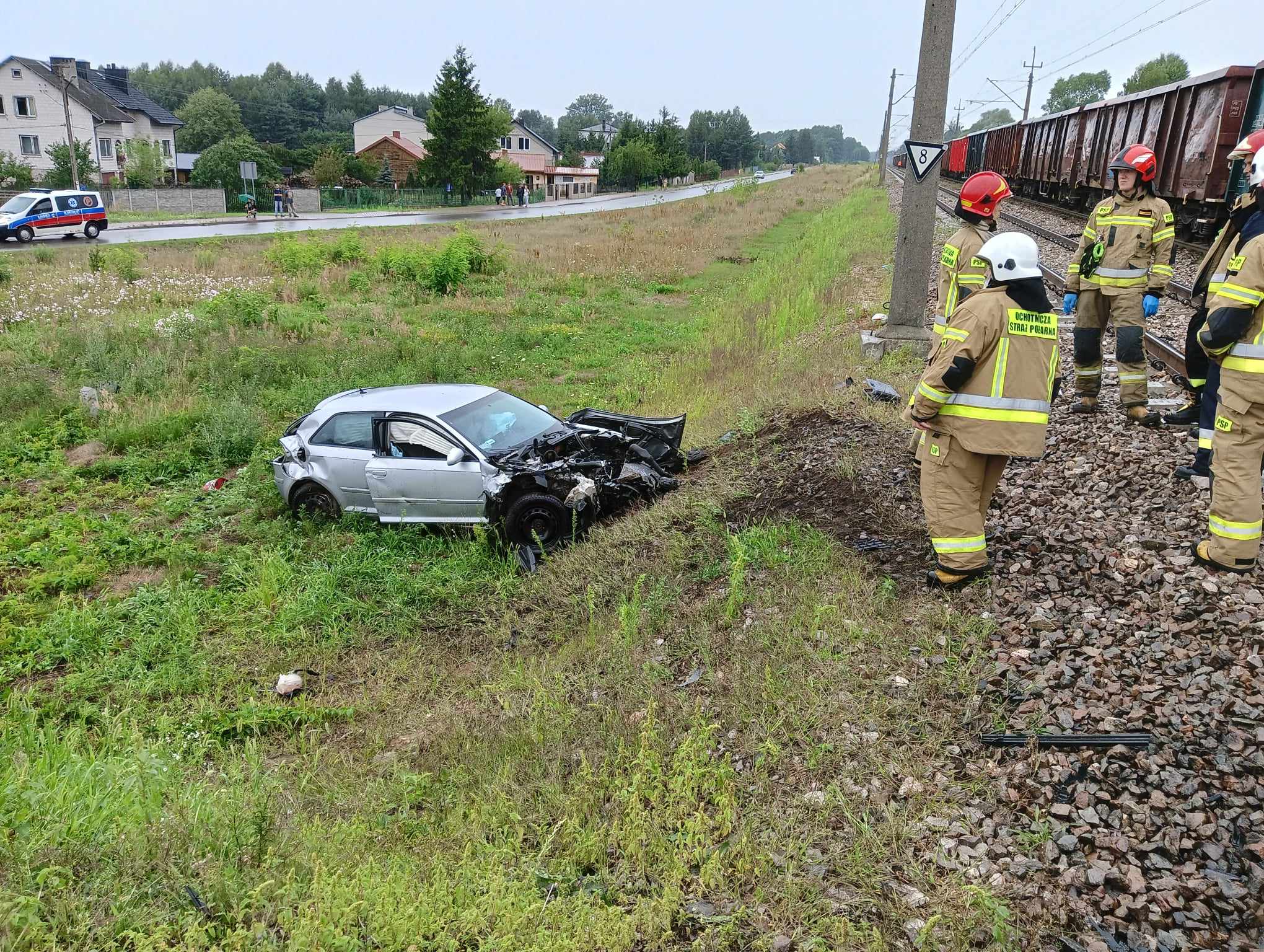 Osobowe auto uderzyło w lokomotywę pociągu towarowego w Wąchocku