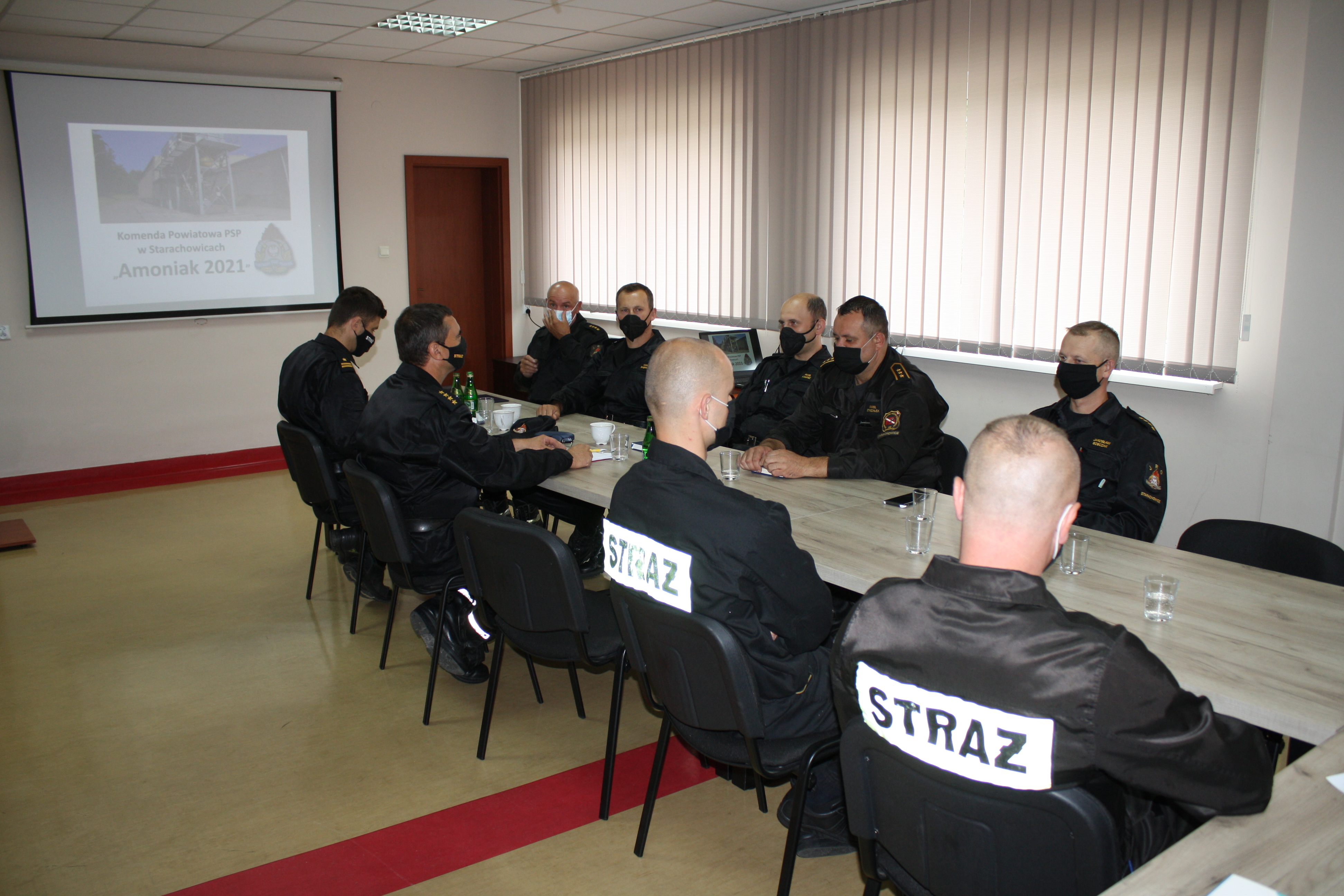 27 lipca 2021 roku w Komendzie Powiatowej PSP w Starachowicach odbyło się spotkanie podsumowujące ćwiczenia powiatowe „Amoniak 2021”. Na spotkanie przybyli oficerowie reprezentujący Świętokrzyskiego Komendanta Wojewódzkiego PSP w Kielcach, naczelnik wydziału operacyjnego- bryg. Marcin Nyga oraz st.kpt. Wojciech Sapielak, kadra kierownicza komendy, rozjemcy oceniający ćwiczenia, funkcjonariusze Komendy Powiatowej PSP w Starachowicach. Spotkanie otworzył Komendant Powiatowy PSP w Starachowicach st.kpt. Sławomir Zięba, który przywitał wszystkich uczestników spotkania. Następnie naczelnik wydziału operacyjno-kontrolno-rozpoznawczego KP PSP w Starachowicach st. kpt. Konrad Dąbrowski przypomniał przebieg poszczególnych epizodów, a st. kpt. Paweł Kot odczytał ocenę końcową głównego rozjemcy. W dalszej części spotkania odbyła się dyskusja. Na zakończenie głos zabrał z-ca Komendanta Powiatowego bryg. Andrzej Pyzik, który podziękował zespołowi rozjemców za merytoryczna ocenę ćwiczeń, a pozostałym uczestnikom za cenne uwagi i dyskusję.