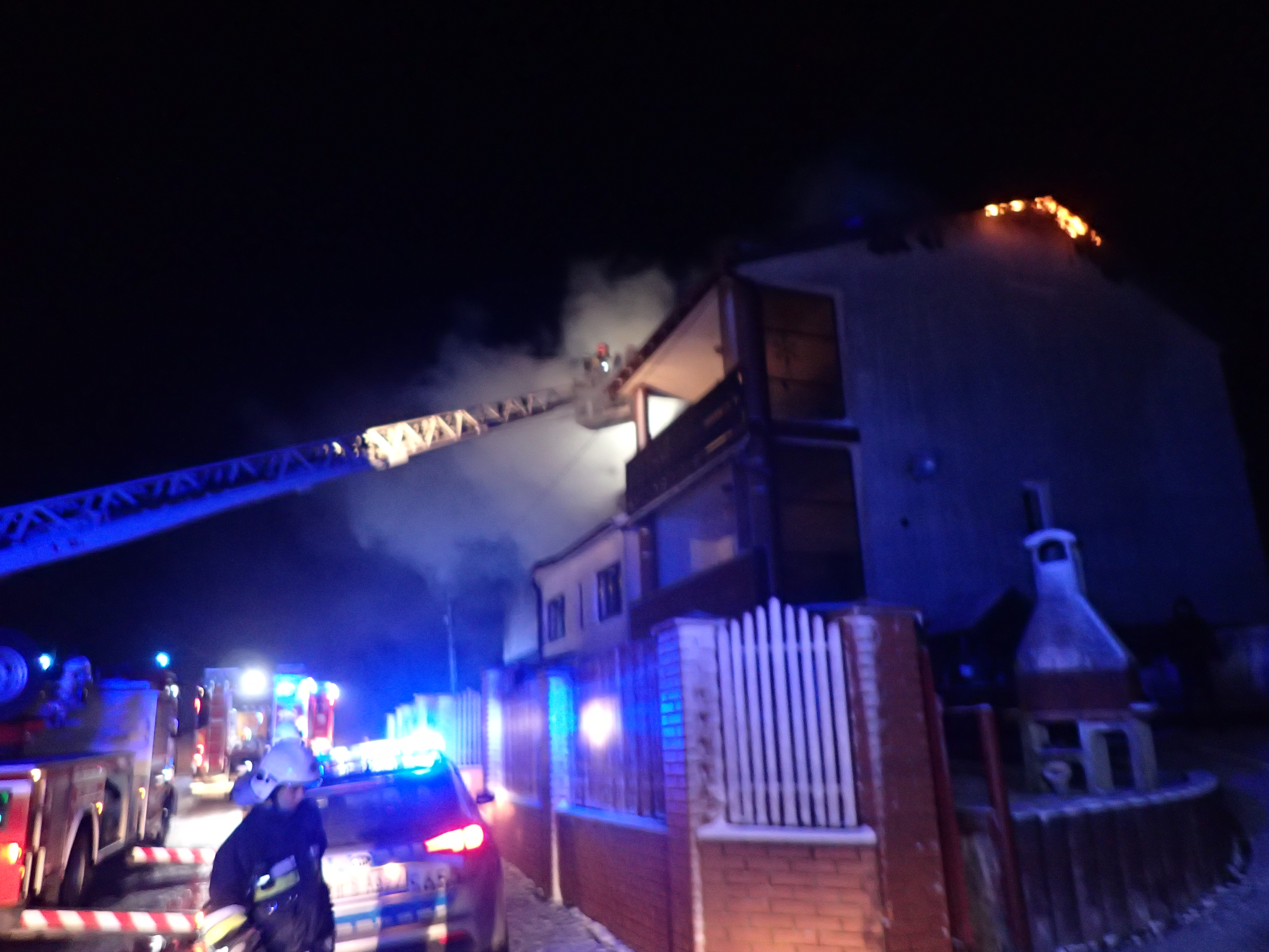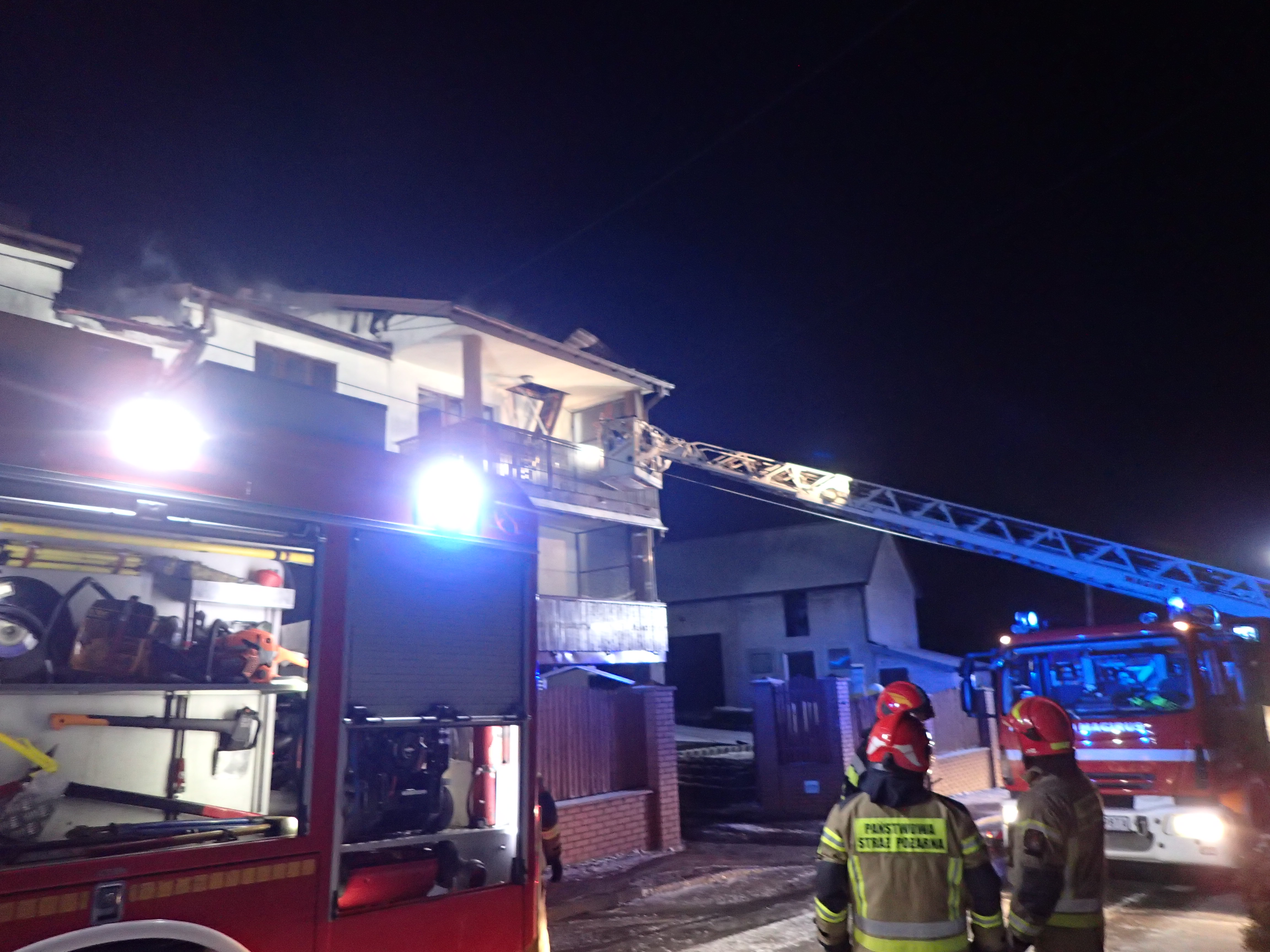 Po dojeździe zastępów straży pożarnej na miejsce zdarzenia stwierdzono rozwinięty pożar dachu i poddasza budynku drewniano – murowanego. Dwaj mężczyźni zamieszkujący budynek samodzielnie opuścili go przed przybyciem jednostek ochrony pożarowej.