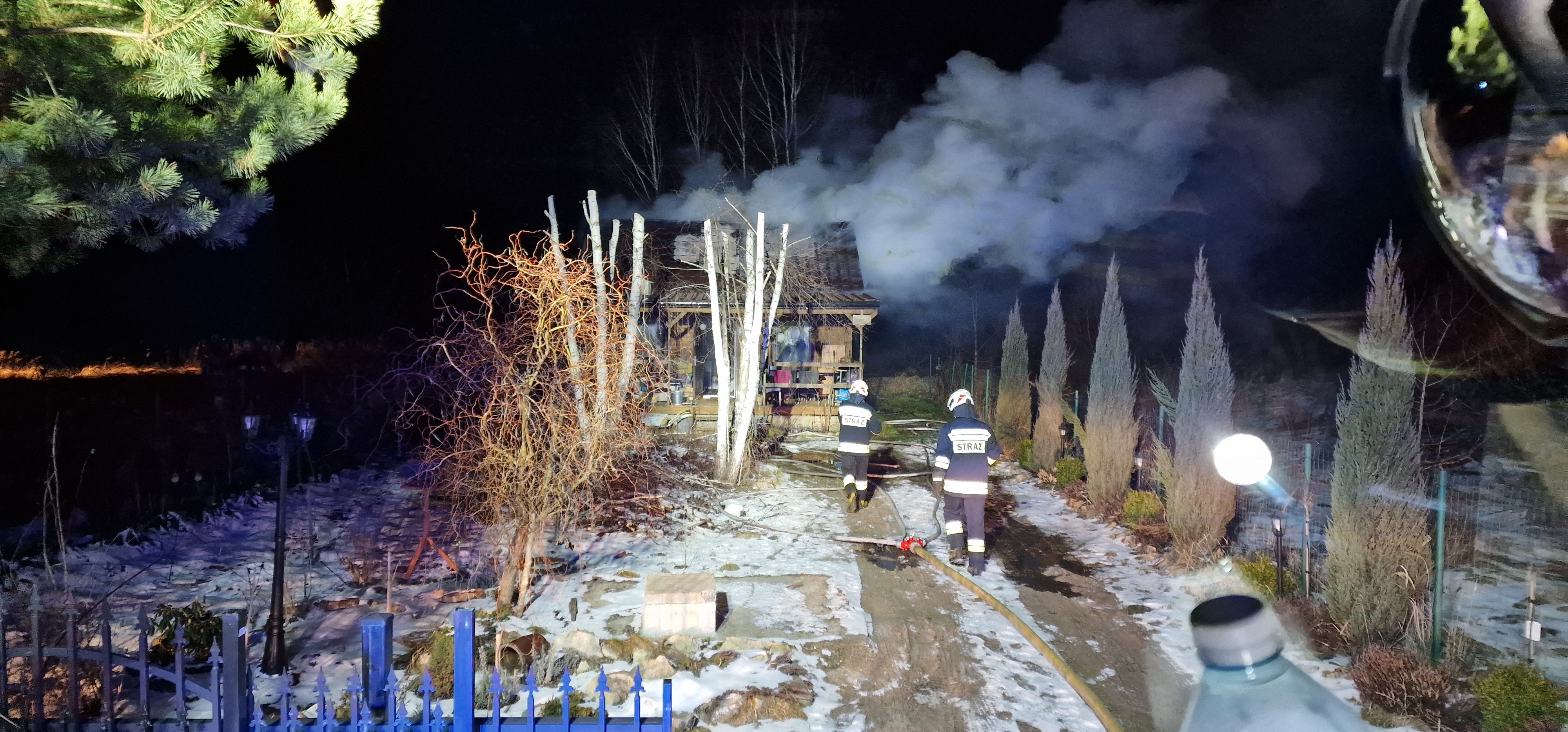 Właściciel budynku doznał poparzenia dłoni podczas próby gaszenia pożaru przed przyjazdem zastępów straży pożarnej. Poszkodowanemu została udzielona kwalifikowana pomoc medyczna.