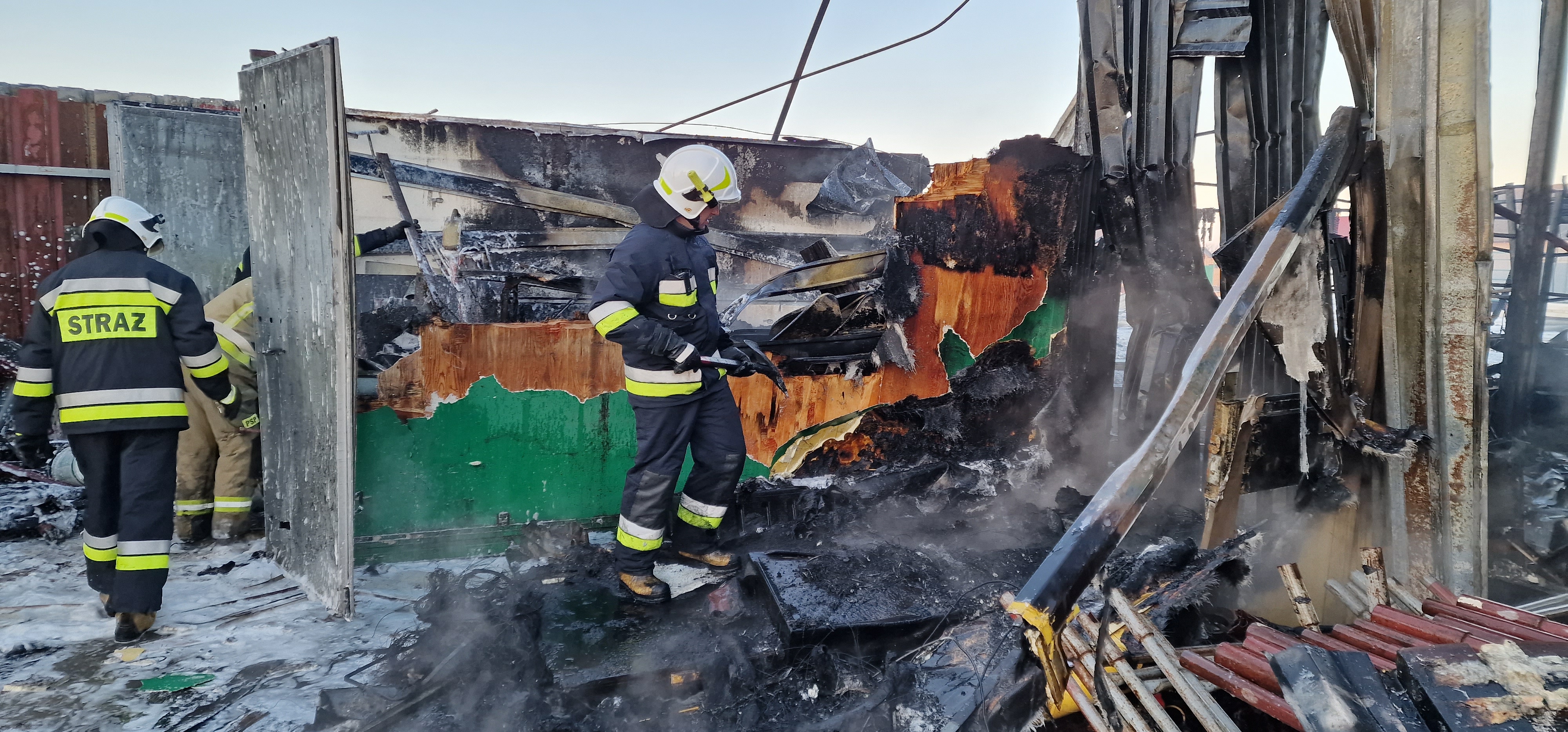 W miarę przybywania na miejsce zdarzenia kolejnych sił i środków wprowadzano dodatkowe prądy wody w natarciu do wnętrza hali. Po ugaszeniu pożaru kierujący działaniem ratowniczym podjął decyzję o przeniesieniu butli z acetylenem do zbiornika z wodą w celu dalszego schładzania zgodnie z procedurą przez 24 godziny.