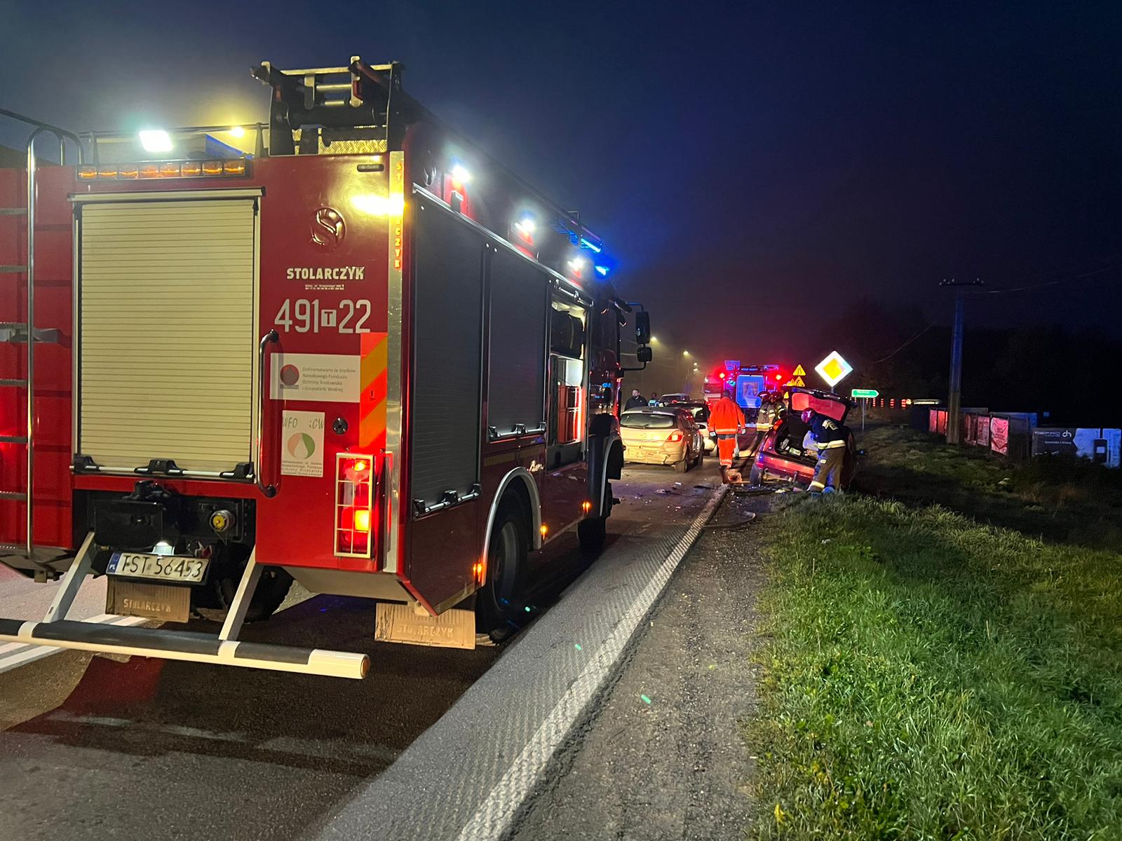 O godz. 6:25 do stanowiska kierowania wpłynęło zgłoszenie z CPR dotyczące zderzenia trzech samochodów osobowych na DK-42 w Wąchocku. Po dojeździe na miejsce zdarzenia zastępów JRG stwierdzono zderzenie trzech samochodów osobowych Ford Focus, Opel Astra i Mitsubishi Space Star. Pojazdami podróżowały wyłącznie kierowcy. Samochody blokowały prawy pas jezdni. W chwili dojazdu zastępów JRG na miejsce zdarzenia podróżujący znajdowali się poza pojazdami. Ruch na DK-42 odbywał się wahadłowo. Po przebadaniu uczestników zdarzenia, koordynator medycznych działań ratowniczych przekazał, że nikt z podróżujących nie wymaga hospitalizacji. Działania zastępów polegały na zabezpieczeniu miejsca zdarzenia, zepchnięciu pojazdów na pobocze drogi oraz kierowaniu ruchem do czasu usunięcia pojazdów z jezdni.