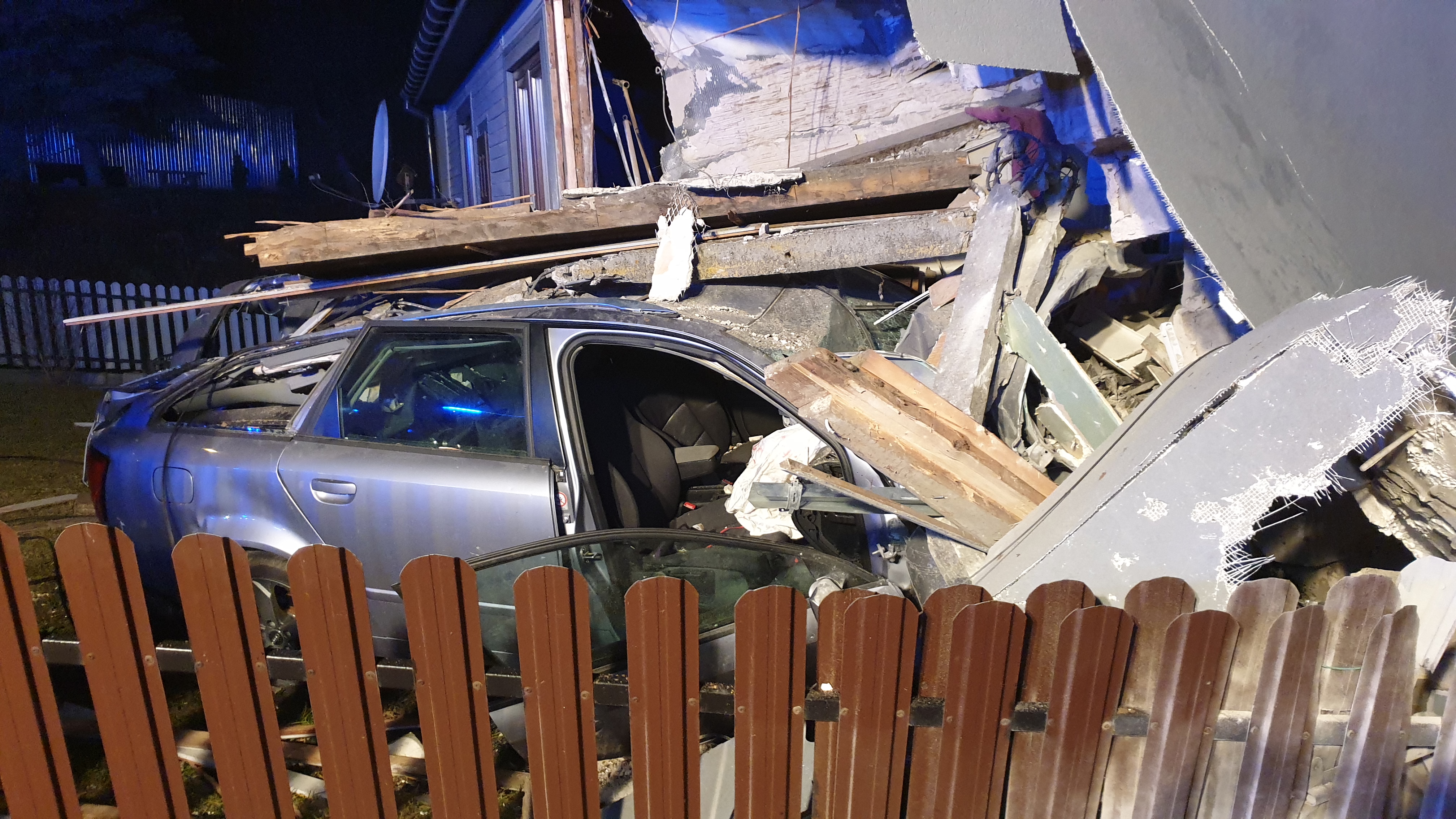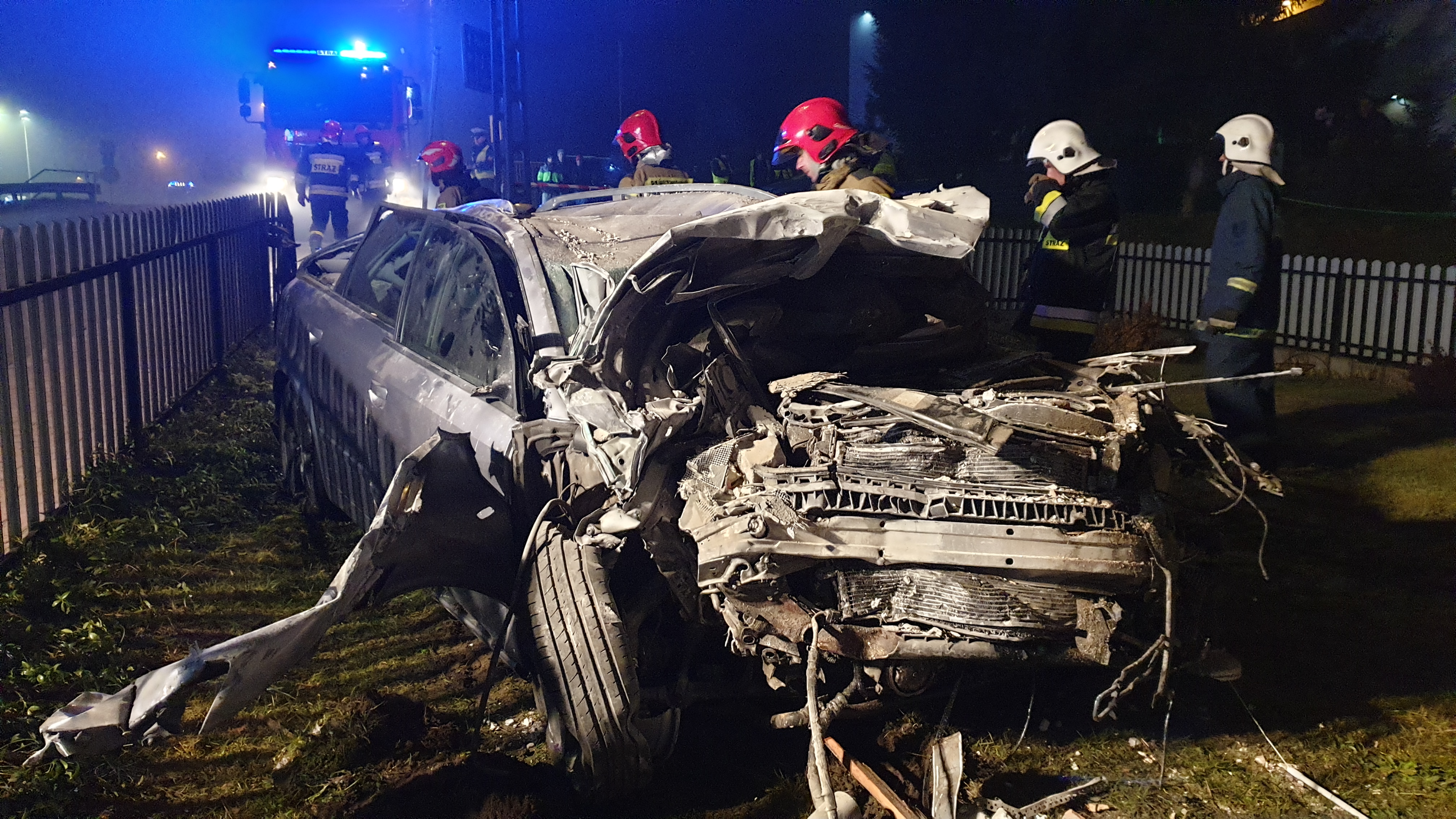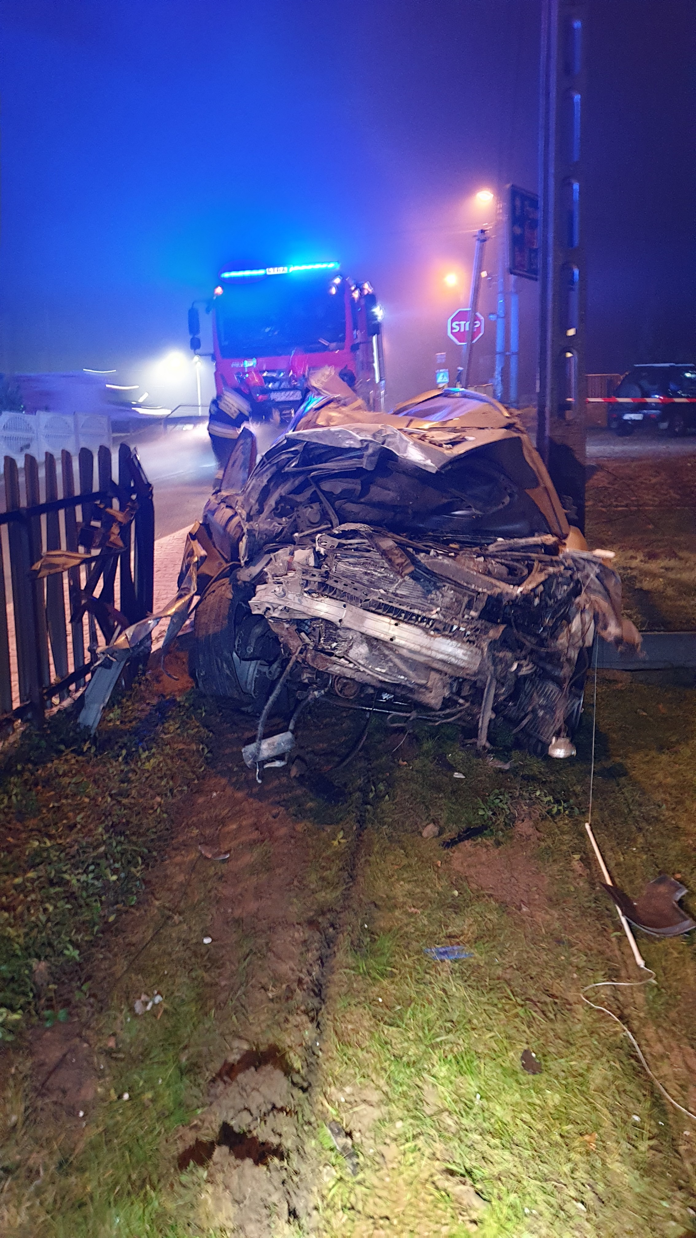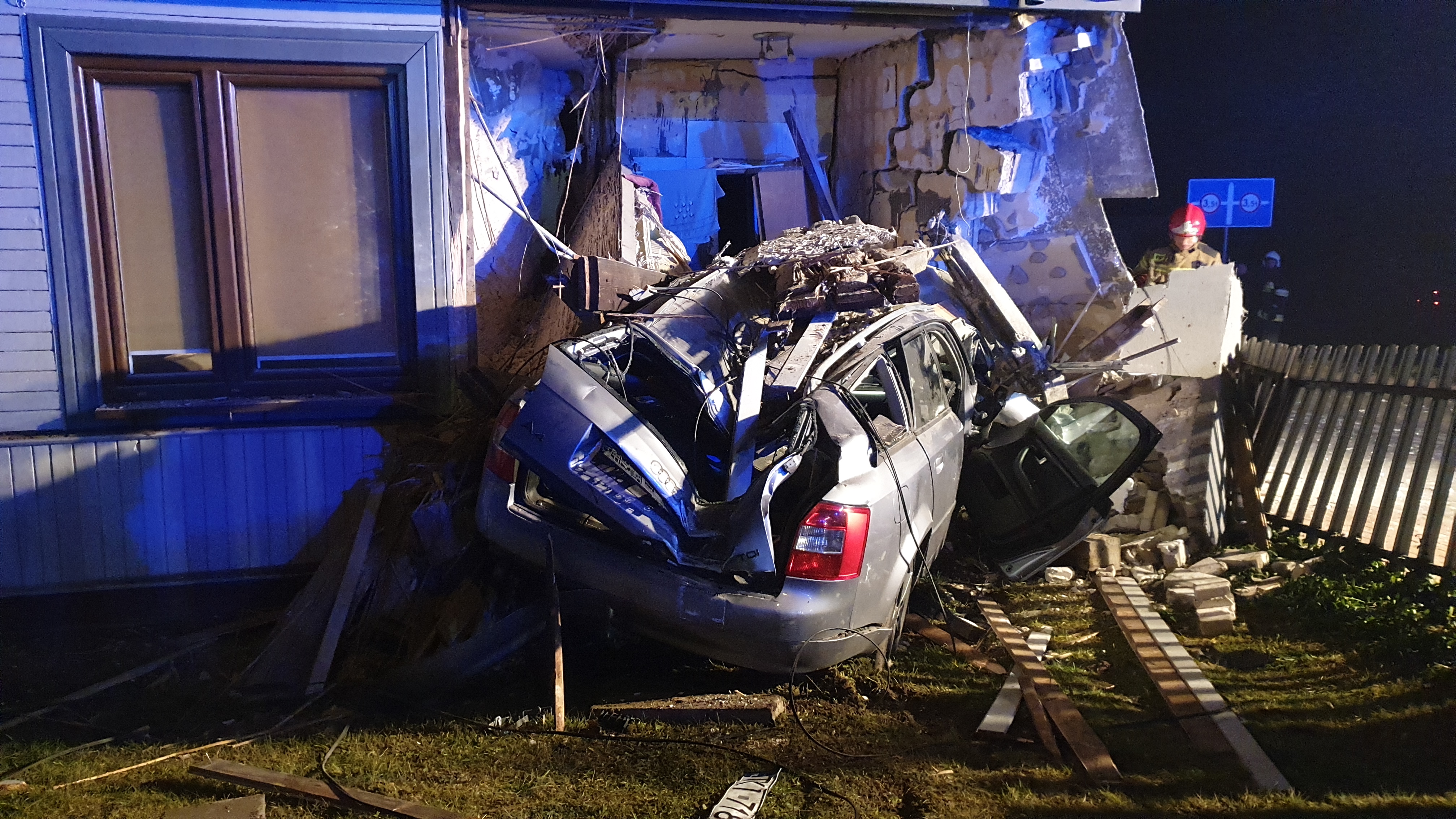 Po przyjeździe na miejsce zdarzenia zastępów PSP stwierdzono, że samochód osobowy Audi A4 wypadł z drogi, uszkodził słup teleinformatyczny i wbił się w róg domu jednorodzinnego. Kierujący pojazdem znajdował się wewnątrz pojazdu. Mieszkańcy w wyniku zdarzenia nie odnieśli żadnych obrażeń i w chwili przybycia jednostek ratowniczych znajdowali się na zewnątrz budynku.