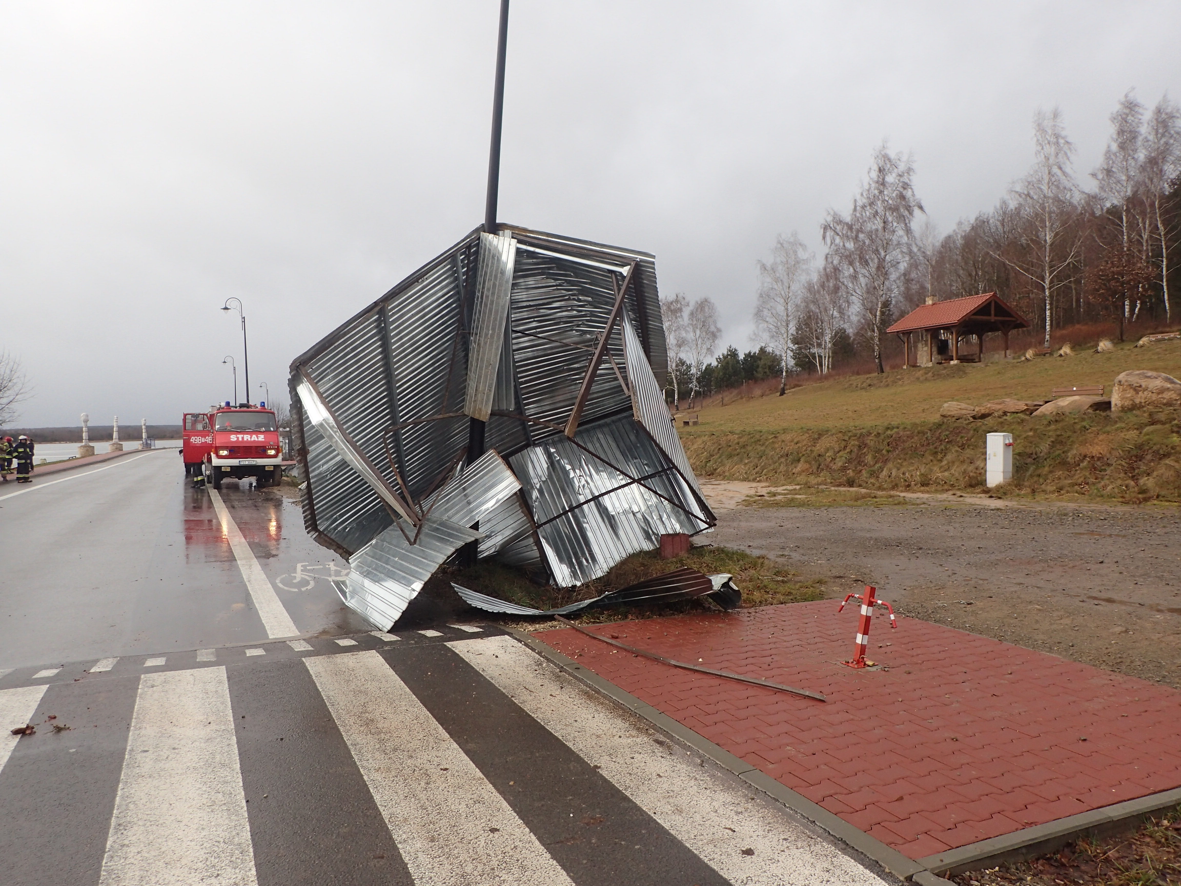 W związku z powyższym starachowiccy strażacy interweniowali 6 razy. Dwukrotnie zastępy wyjeżdżały do usuwania powalonych drzew w Starachowicach. W wyniku silnego wiatru ucierpiały również budynki, między innymi dach budynku mieszkalnego w Adamowie oraz komin pustostanu w Starachowicach . W Rudzie silny wiatr porwał 2 garaże blaszane, z których jeden zatrzymał się na latarni ulicznej. Na szczęście przy żadnym ze zgłoszeń nie ucierpiały żadne osoby.