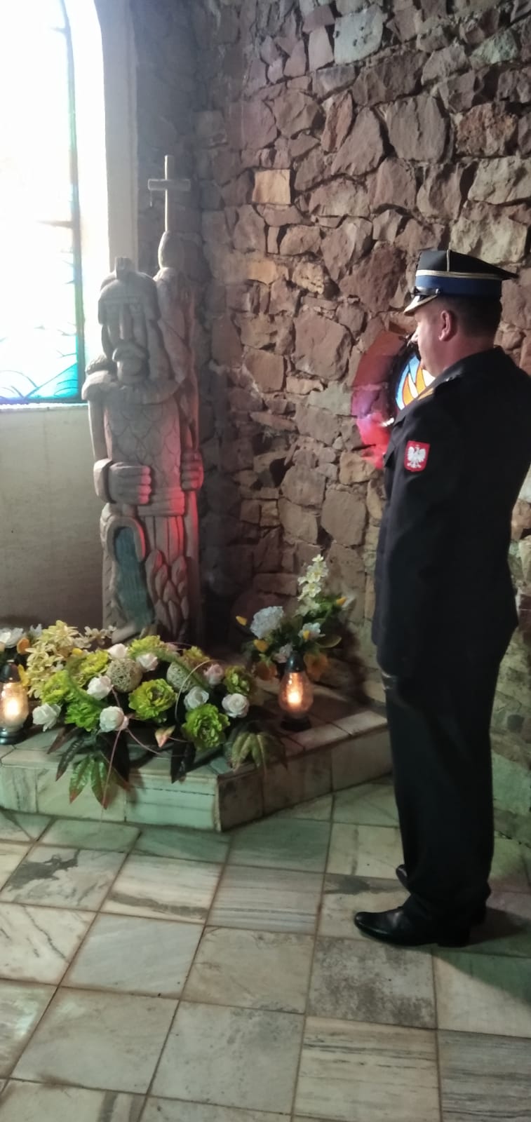 Komendant Powiatowy PSP w Starachowicach mł. bryg. Sławomir Zięba złożył kwiaty w kaplicy św. Floriana przy Sanktuarium w Kałkowie-Godowie.