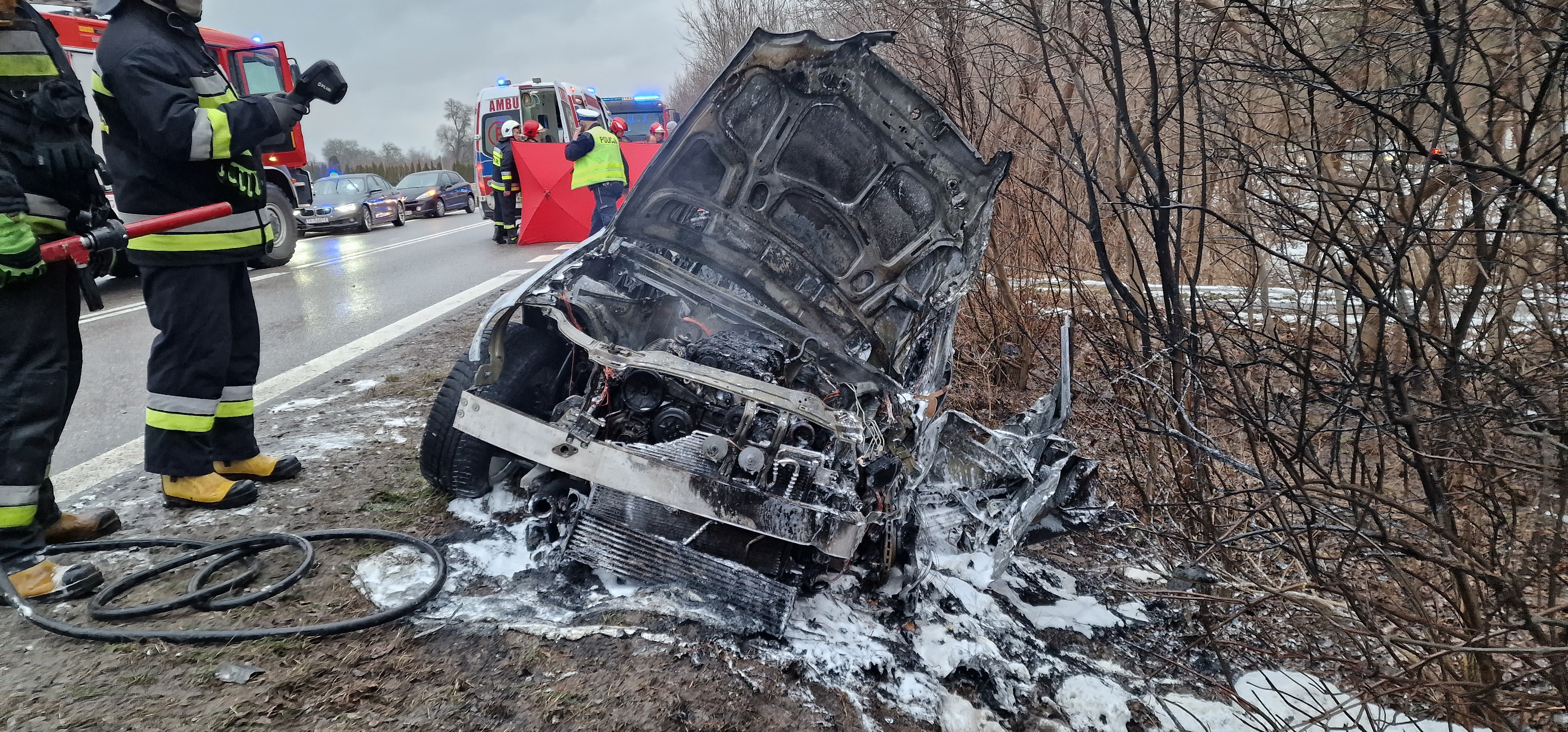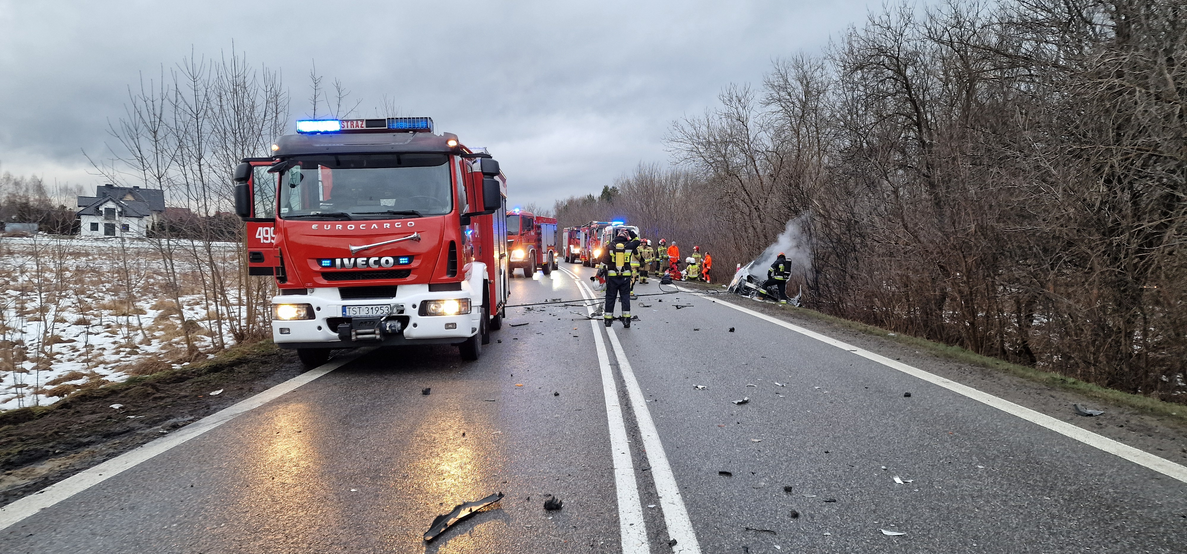Po dojeździe na miejsce zdarzenia zastępów straży pożarnej stwierdzono, że doszło do zderzenia samochodu ciężarowego z osobowym. W wyniku zdarzenia samochód osobowy Mercedes znajdował się poza obrysem jezdni i objęty był pożarem, natomiast samochód ciężarowy MAN znajdował się po przeciwległej stronie drogi również poza jej obrysem. Kierowca ciężarówki wyszedł z pojazdu o własnych siłach i nie wymagał pomocy medycznej, natomiast nieprzytomny kierowca samochodu Mercedes został ewakuowany z płonącego pojazdu przez świadków zdarzenia przed przybyciem służb ratowniczych. Działania zastępów polegały na zabezpieczeniu miejsca zdarzenia oraz wspólnie z zastępem ratownictwa medycznego przystąpiono do resuscytacji krążeniowo oddechowej poszkodowanego mężczyzny . Jednocześnie podano jeden prąd piany ciężkiej w natarciu na palący się samochód przez rotę ratowników zabezpieczonych w aparaty ochrony układu oddechowego. Na miejsce przybył zespół Lotniczego Pogotowia Ratunkowego. Niestety mimo działań ratowniczych lekarz stwierdził zgon mężczyzny. Na czas działań droga krajowa była całkowicie zablokowana.