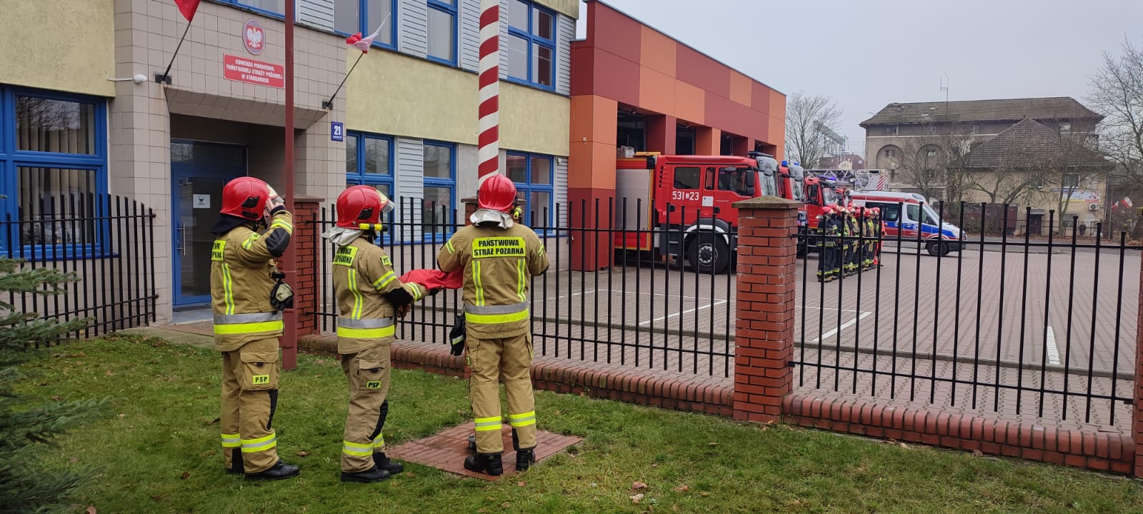 Strażacy z JRG Stargard uczcili 103 rocznicę odzyskania przez Polskę Niepodległości. O godzinie 12:00 uroczyście wciągnięto flagę na maszt i odśpiewano hymn państwowy.