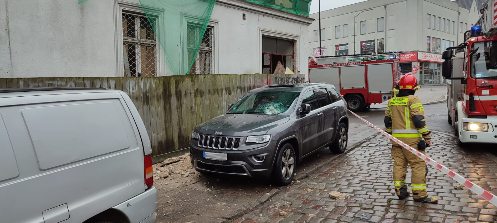 Elementy elewacji spadły na samochód.
